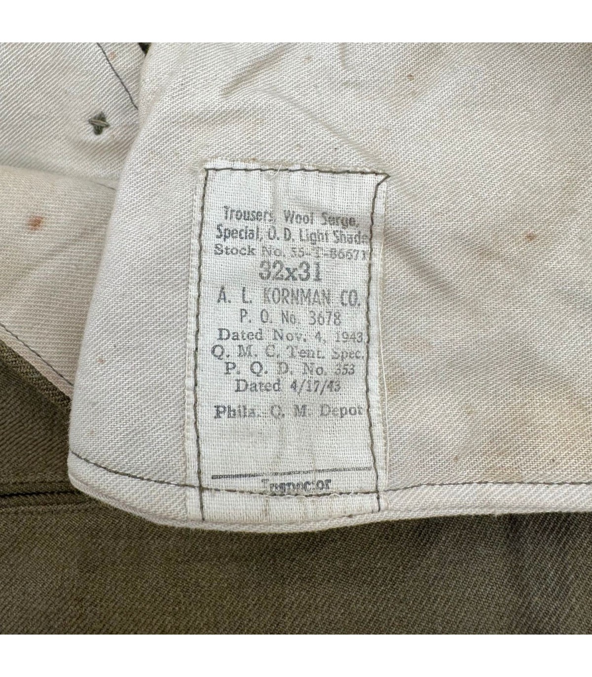 Pantalon M-1937 pour soldat de l'armée américaine. Ce pantalon d'origine deuxième guerre dispose de son étiquette qui nous stipule une fabrication du 4 novembre 1943 et de taille 32x31.