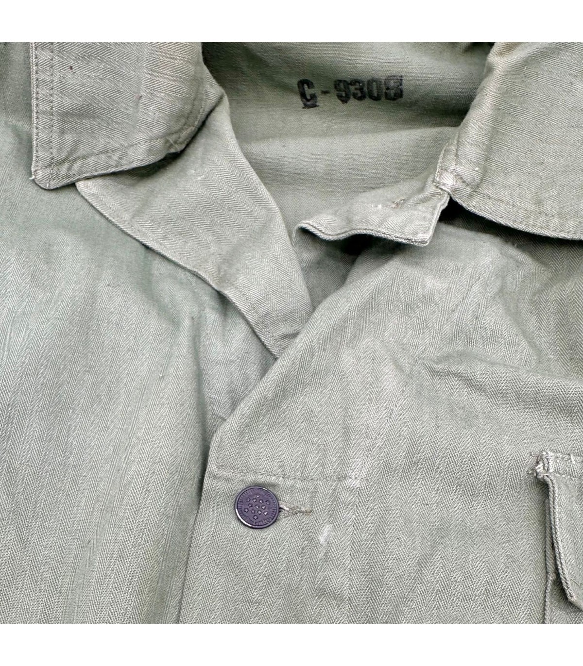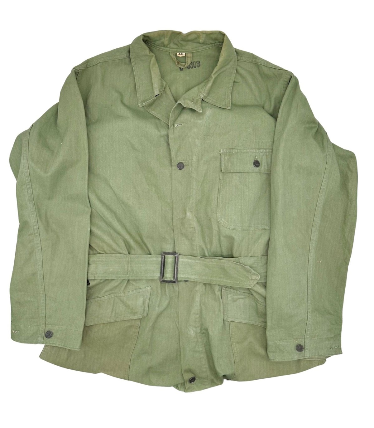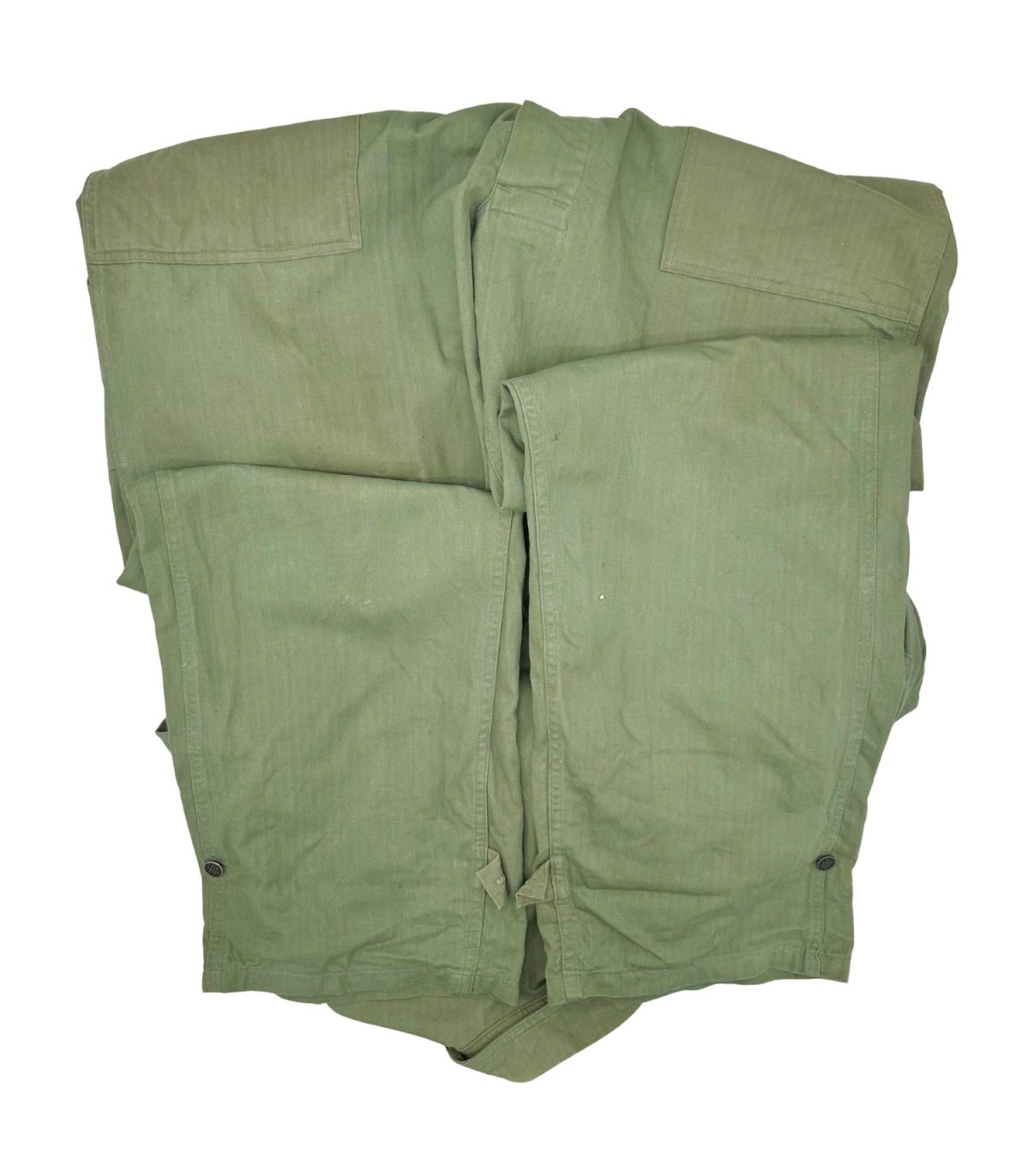 Découvrez cette combinaison HBT (Herringbone Twill) authentique de la Seconde Guerre Mondiale. Ce modèle 2nd pattern, fabriqué à partir de toile de coton robuste, était largement utilisé par les forces armées américaines durant le conflit.