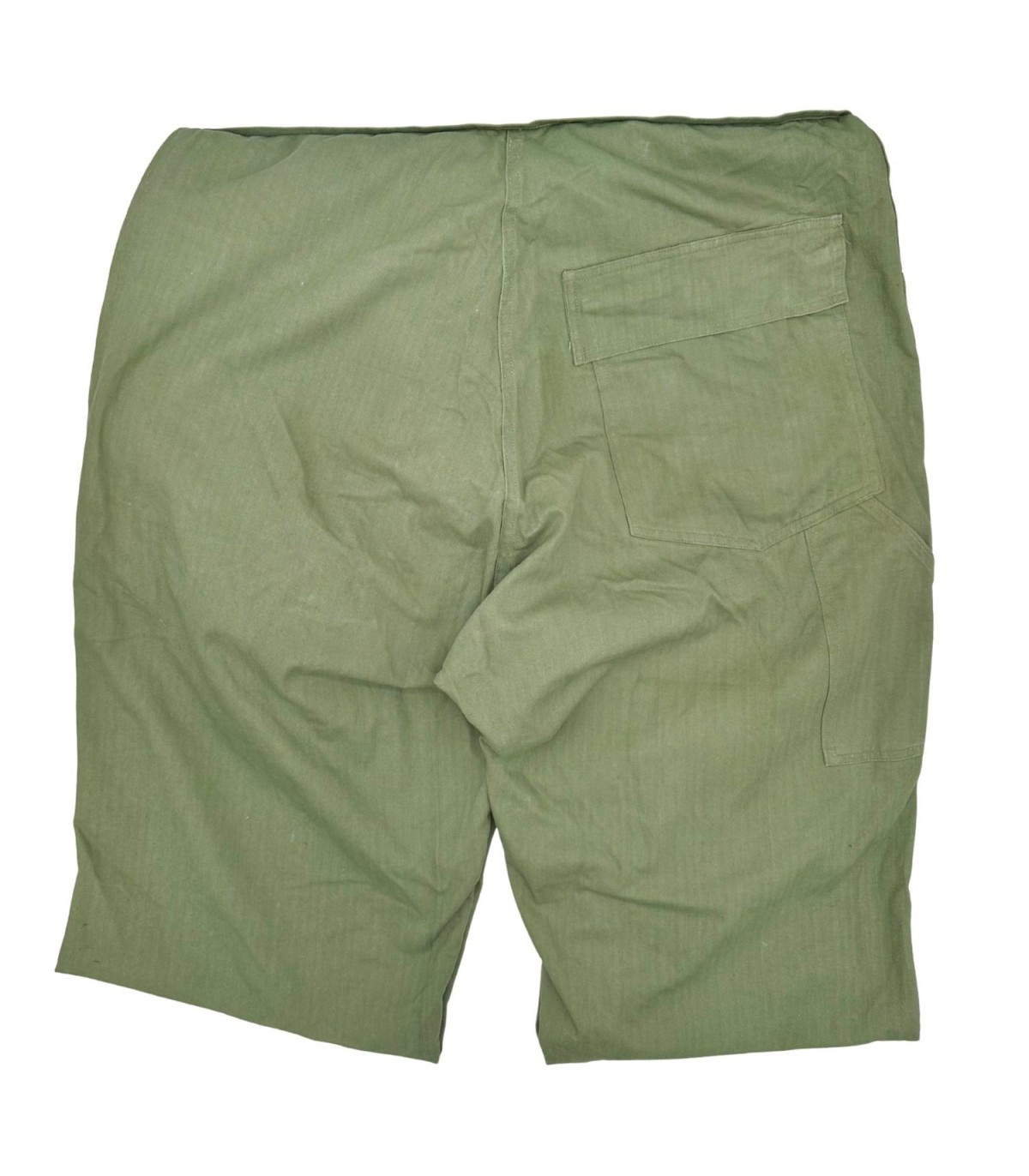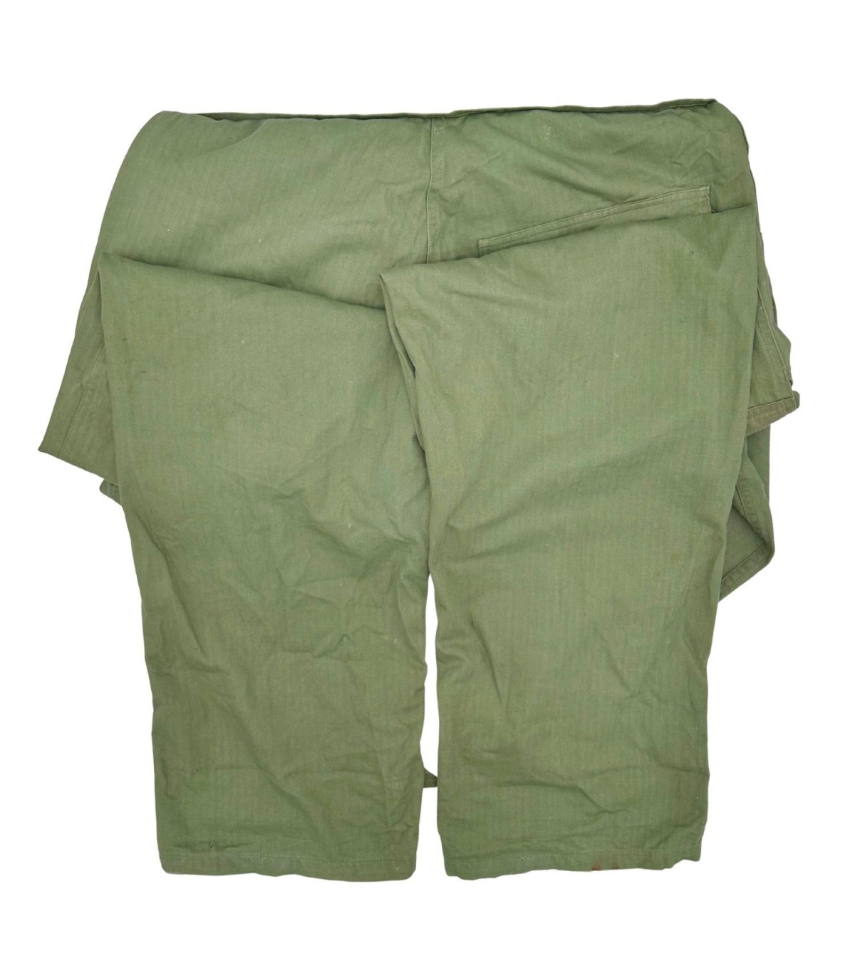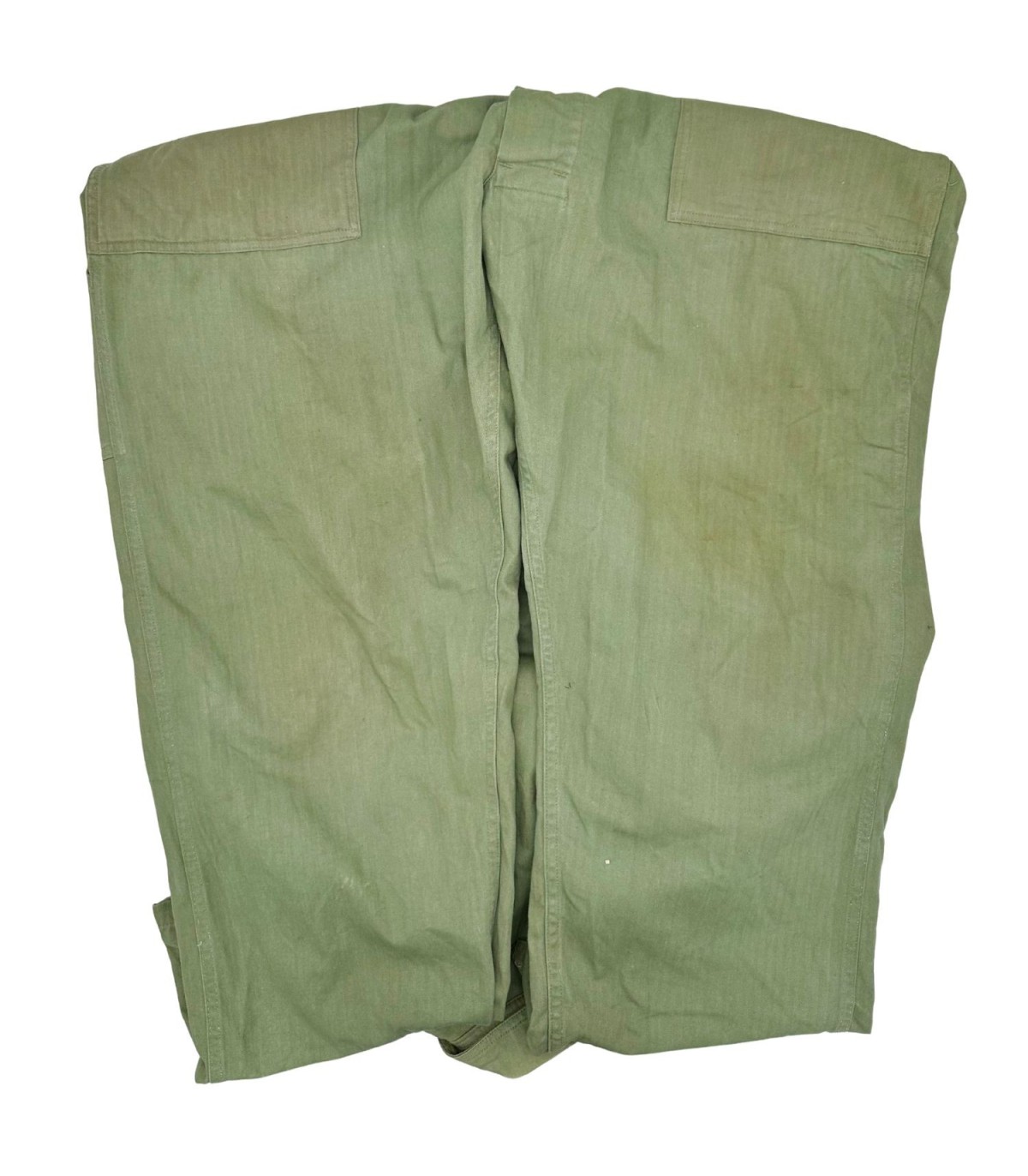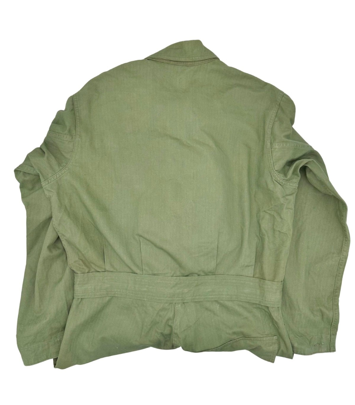 Découvrez cette combinaison HBT (Herringbone Twill) authentique de la Seconde Guerre Mondiale. Ce modèle 2nd pattern, fabriqué à partir de toile de coton robuste, était largement utilisé par les forces armées américaines durant le conflit.