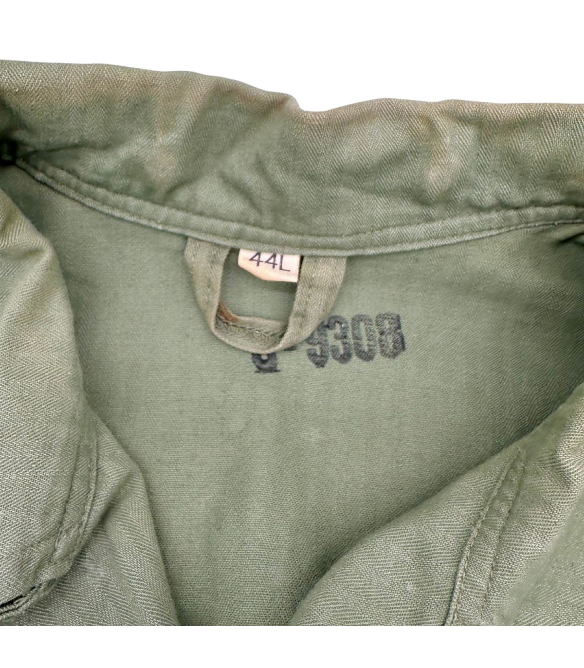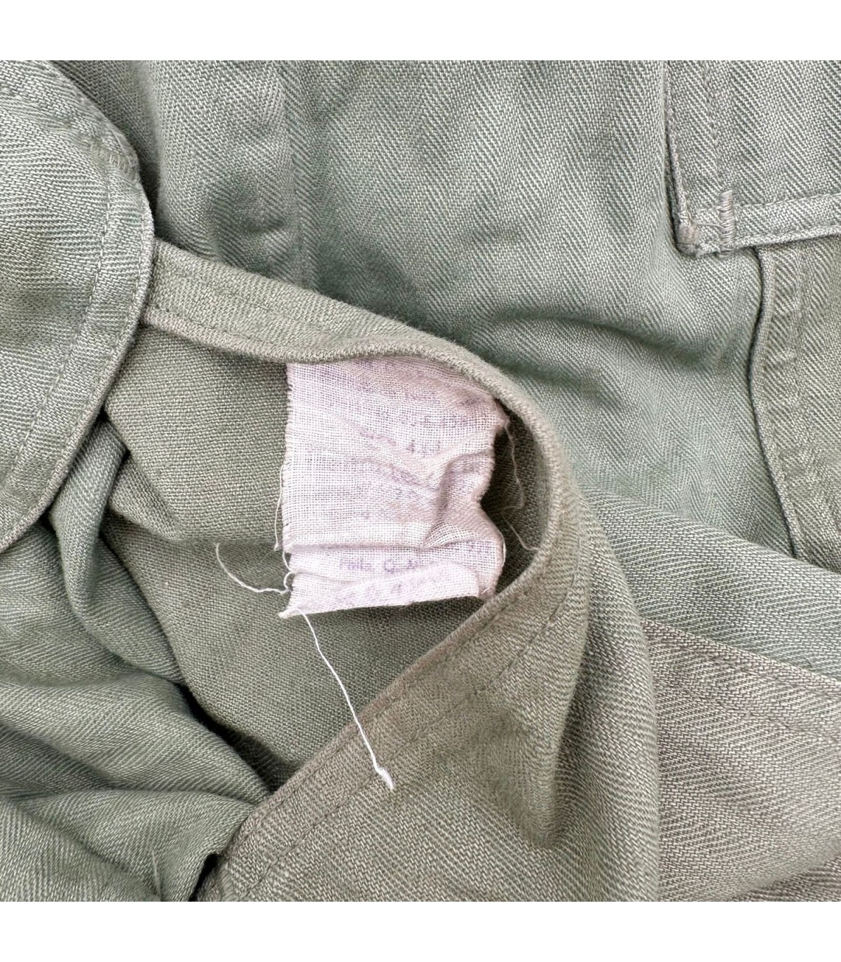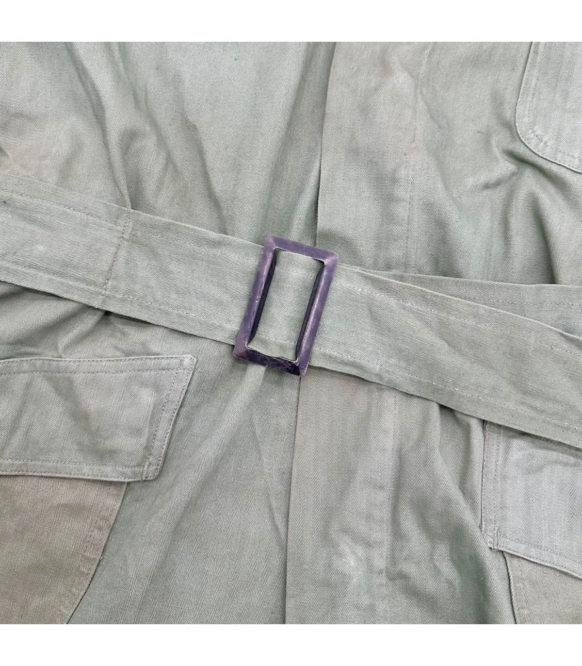 Superbe combinaison HBT (Herringbone-twill) d'origine deuxième guerre. Il s'agit du deuxième modèle avec poche cargo à rabat sur le torse et deux poches sur les hanches. Etiquette de taille 44L présente dans le col + étiquette de manufacture (presque illsibile).