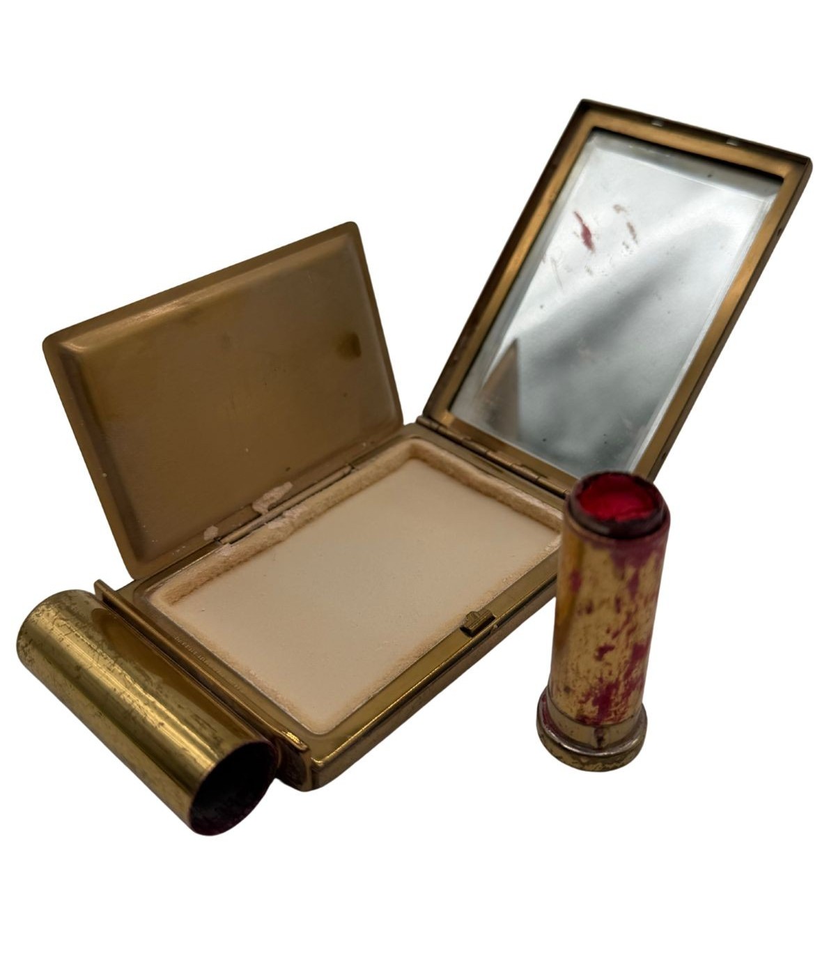 Objet Complet : La présence du rouge à lèvres et de la poudre d'origine en fait une pièce de vitrine "vivante" et hautement évocatrice.