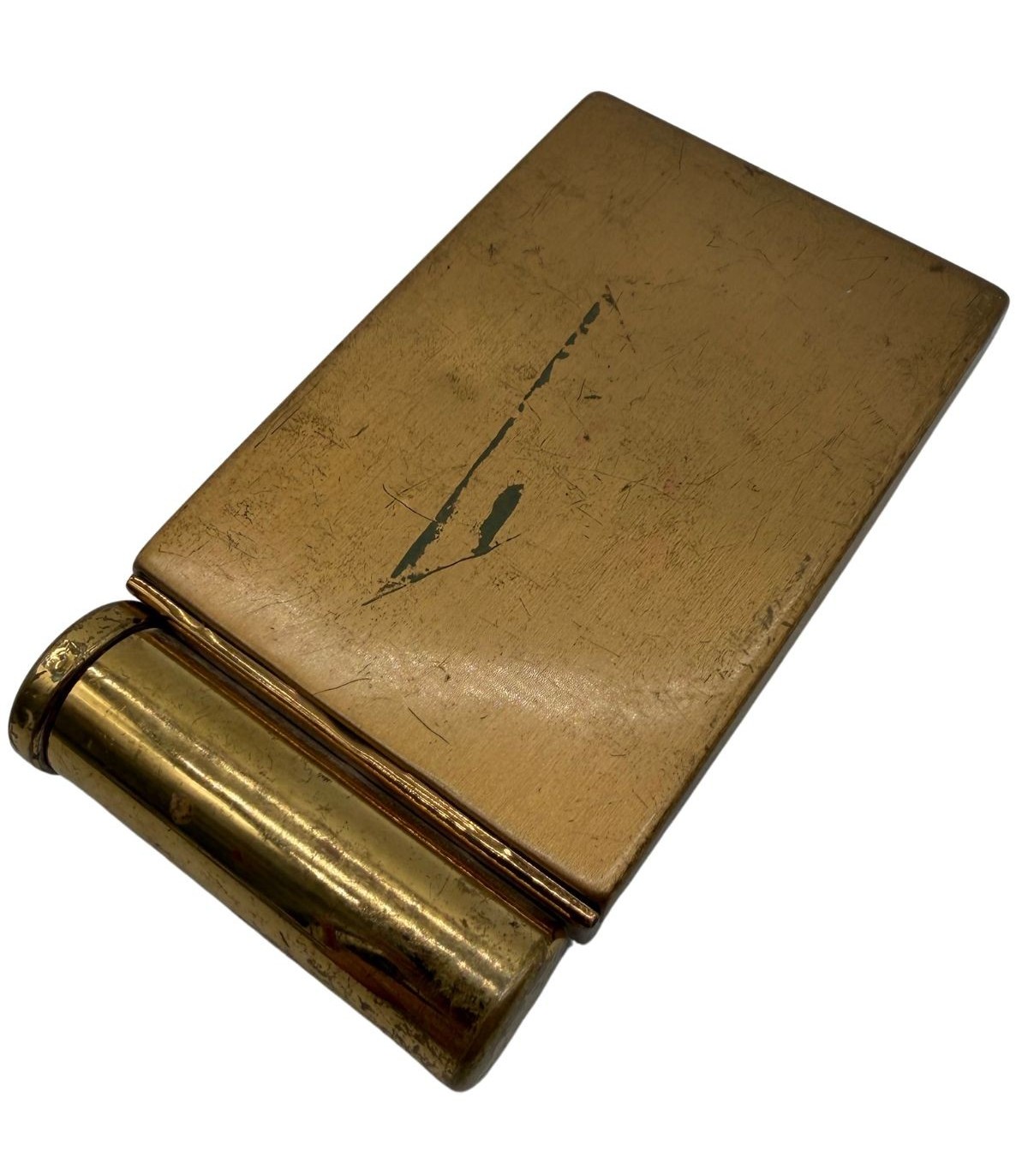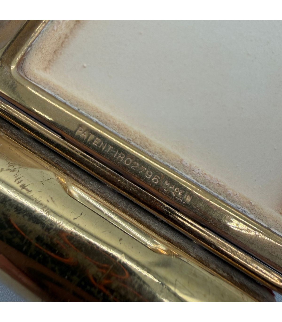 Rouge à lèvres intégré sur le côté ou dans un logement spécifique, un détail rare et recherché.