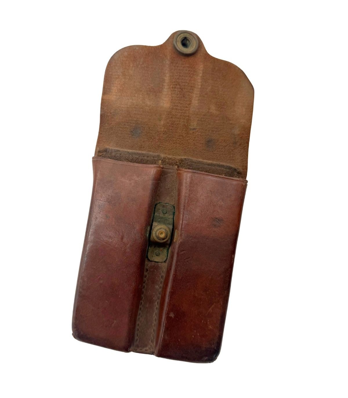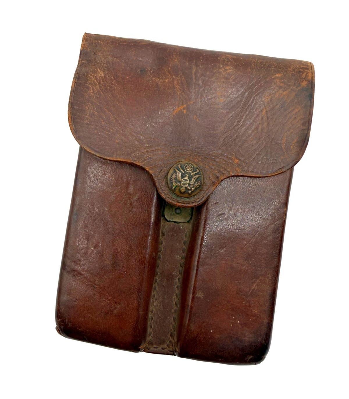 Malgré ses 113 ans, cet exemplaire affiche un excellent état. Le cuir est resté souple, une caractéristique rare pour des pièces de cette époque qui ont souvent tendance à sécher et à craqueler. La patine couleur noisette est profonde et homogène. La pression est parfaitement fonctionnelle, permettant une manipulation sécurisée. Ce porte-chargeurs est conçu pour être porté sur le ceinturon d'officier M-1912 en cuir, complétant ainsi une silhouette de prestige du début du XXe siècle.