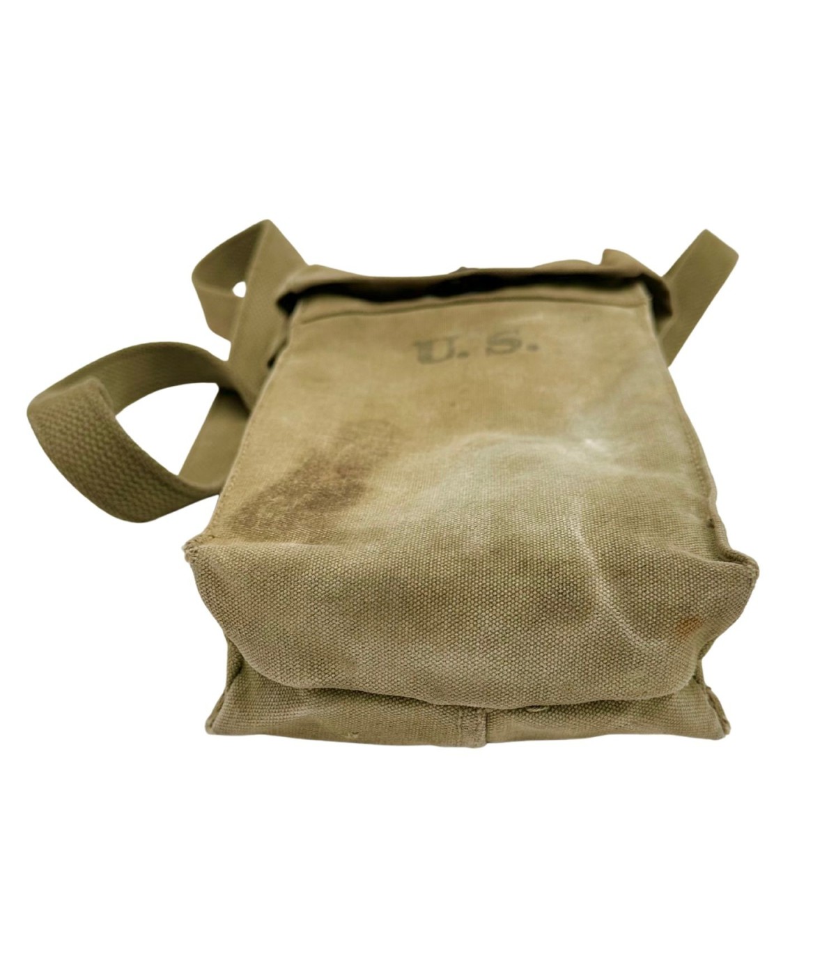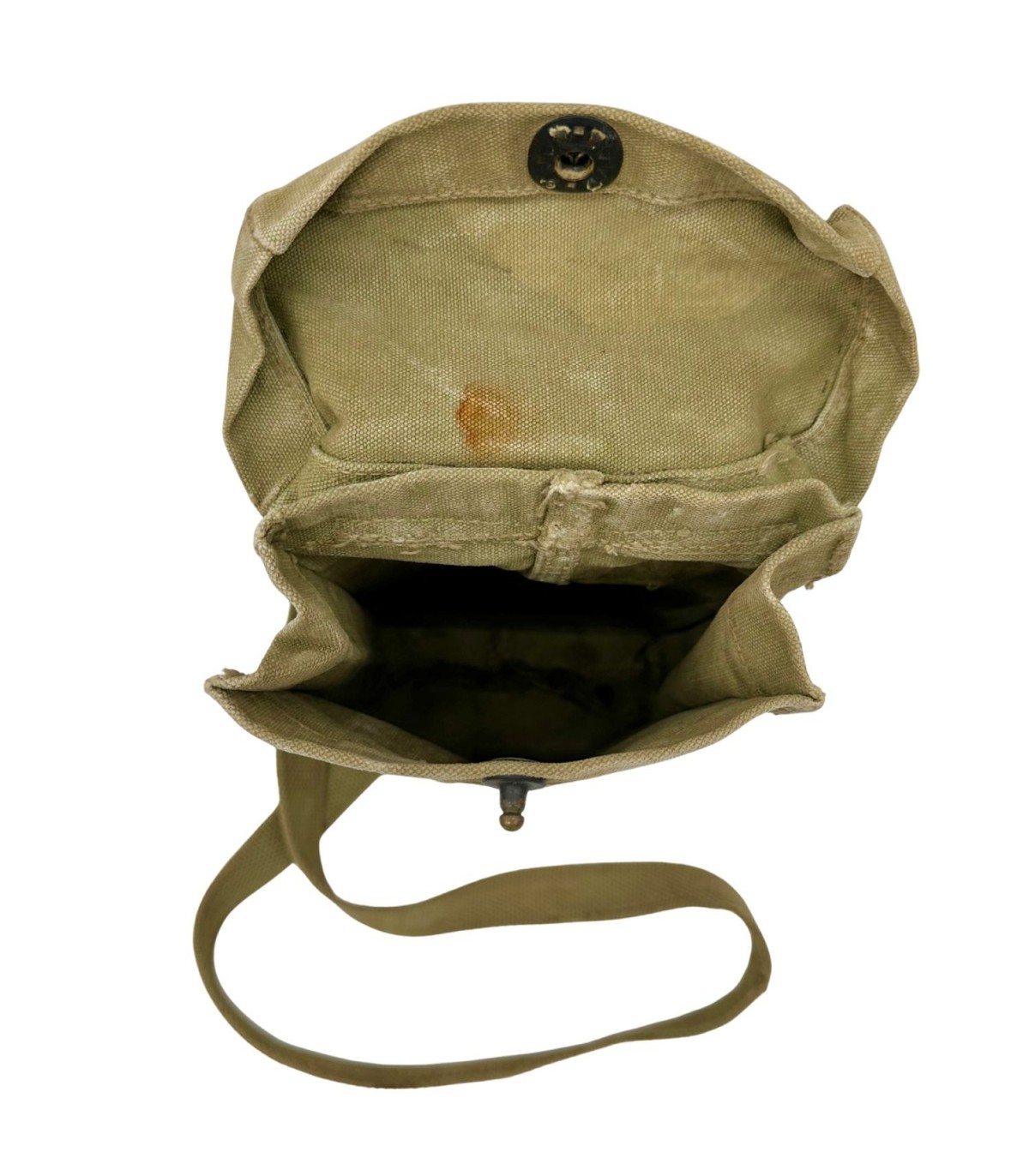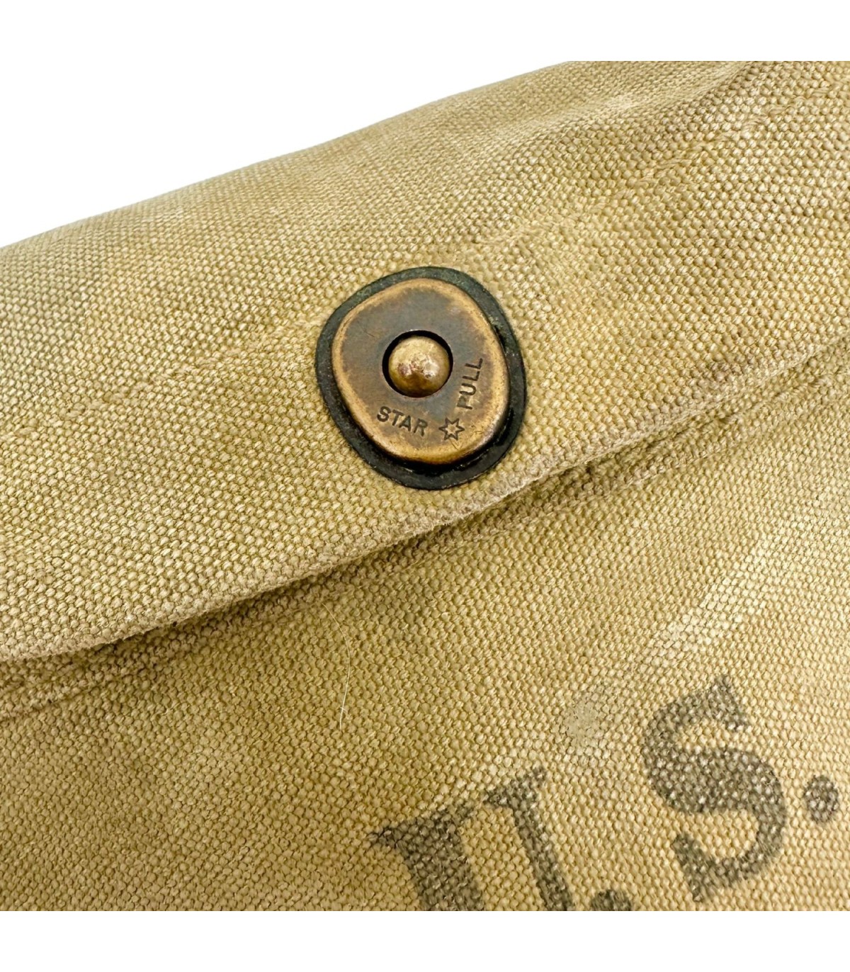 Superbe porte chargeur en bandoulière pour pistolet mitrailleur thompson 30 coups ou Grease Gun M3. Exemplaire d'origine deuxième guerre et fabriqué par AMER Fabrics Compagny en 1943. Sangle de transport présente et pressions fonctionnelle.