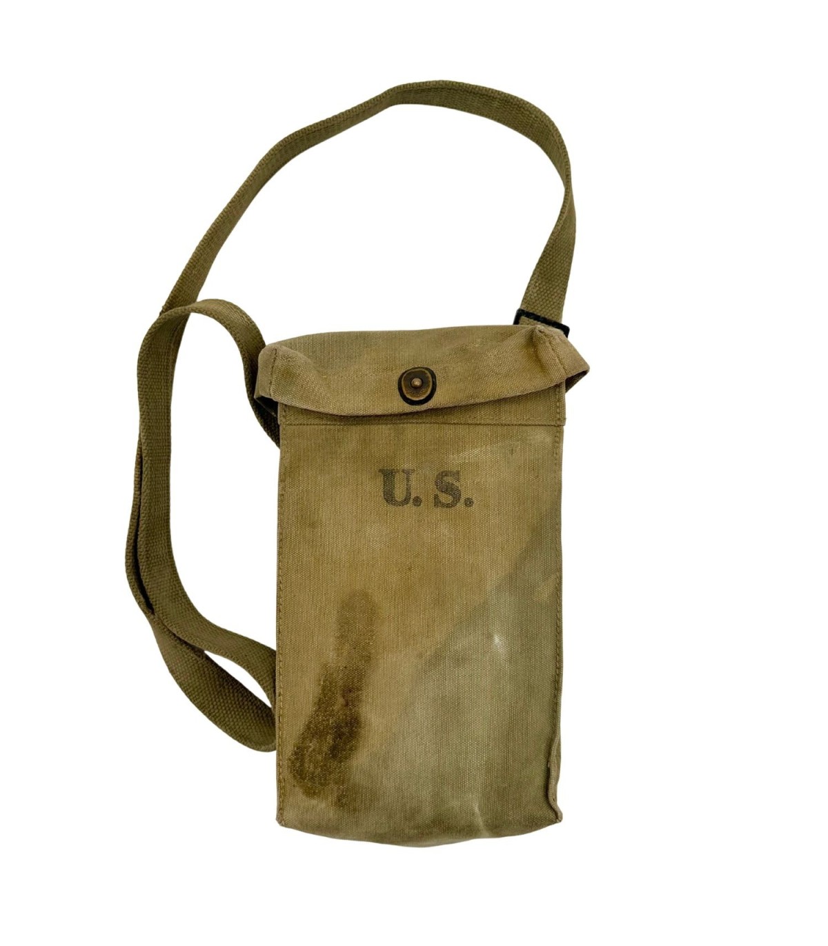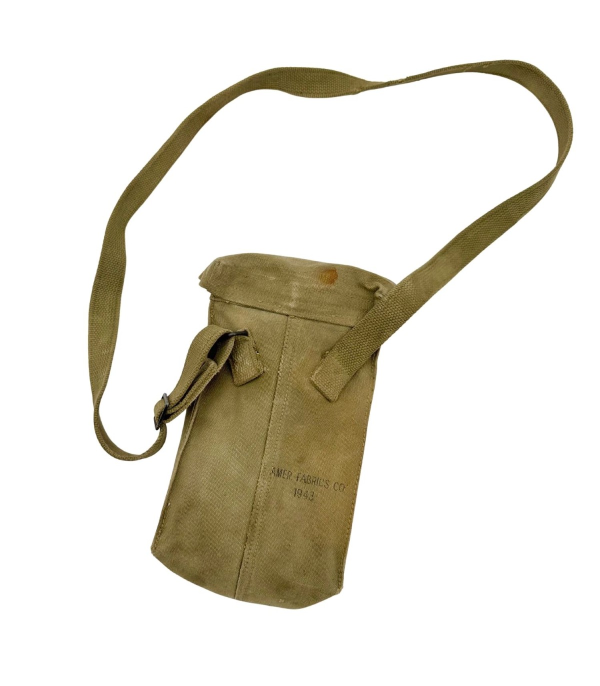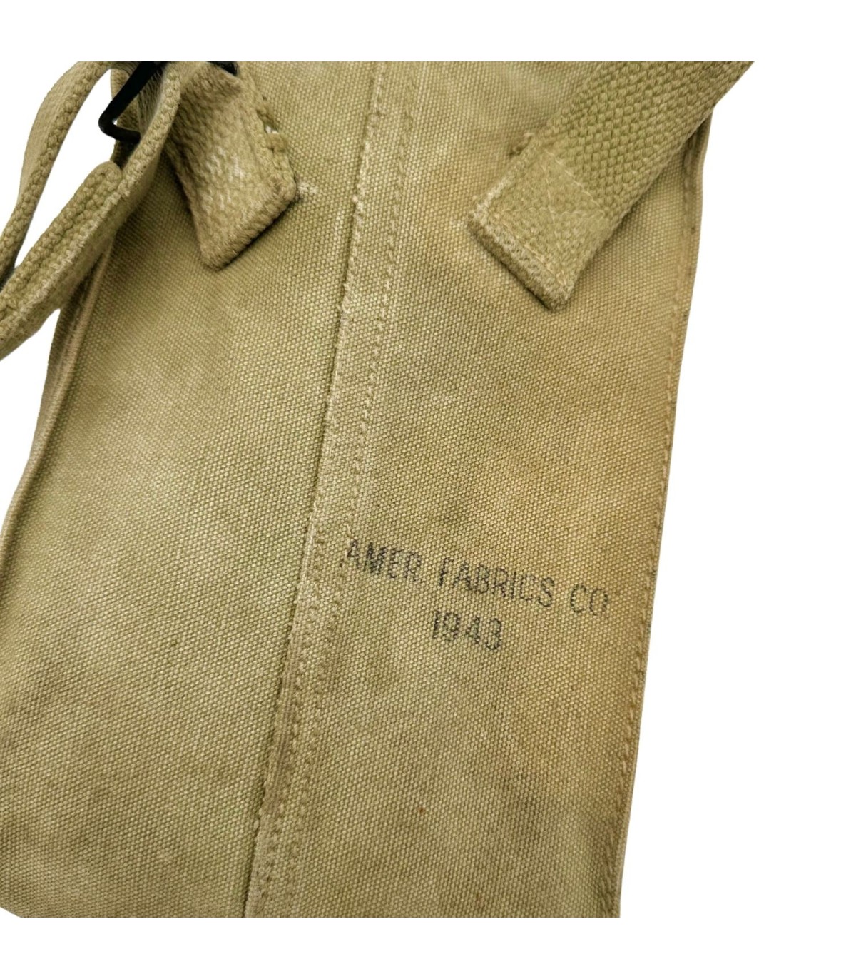 Découvrez ce porte-chargeur authentique de Thompson, fabriqué par AMER FABRICS Co en 1943 pendant la Seconde Guerre mondiale. Conçu pour transporter les chargeurs du célèbre pistolet-mitrailleur Thompson, cet accessoire en toile robuste est une pièce précieuse pour les collectionneurs et les passionnés d'histoire militaire. En excellent état malgré son âge, il présente des marquages clairs "Avery 1943" qui attestent de son authenticité.