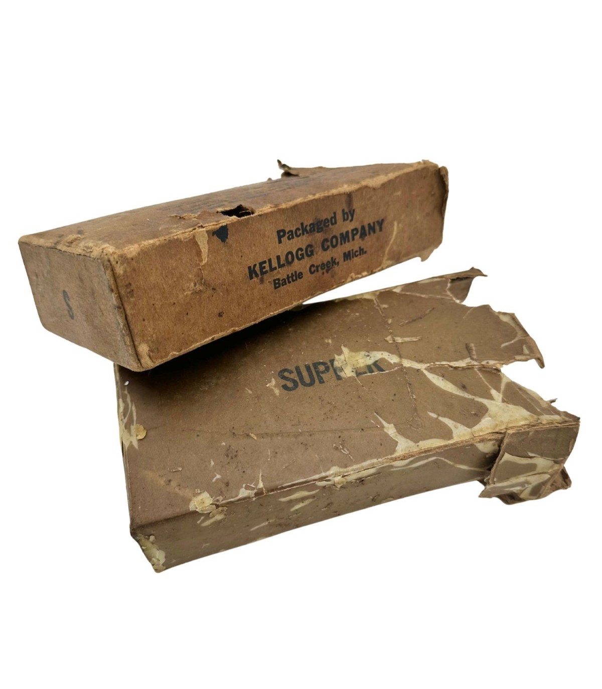 Découvrez une authentique boîte de ration K "Supper" de la Seconde Guerre mondiale, un objet historique rare qui témoigne du quotidien des soldats américains sur le front. Fabriquée en carton paraffiné pour résister à l’humidité et aux conditions difficiles du terrain, cette boîte vide a traversé les décennies et conserve toute la force de son authenticité.