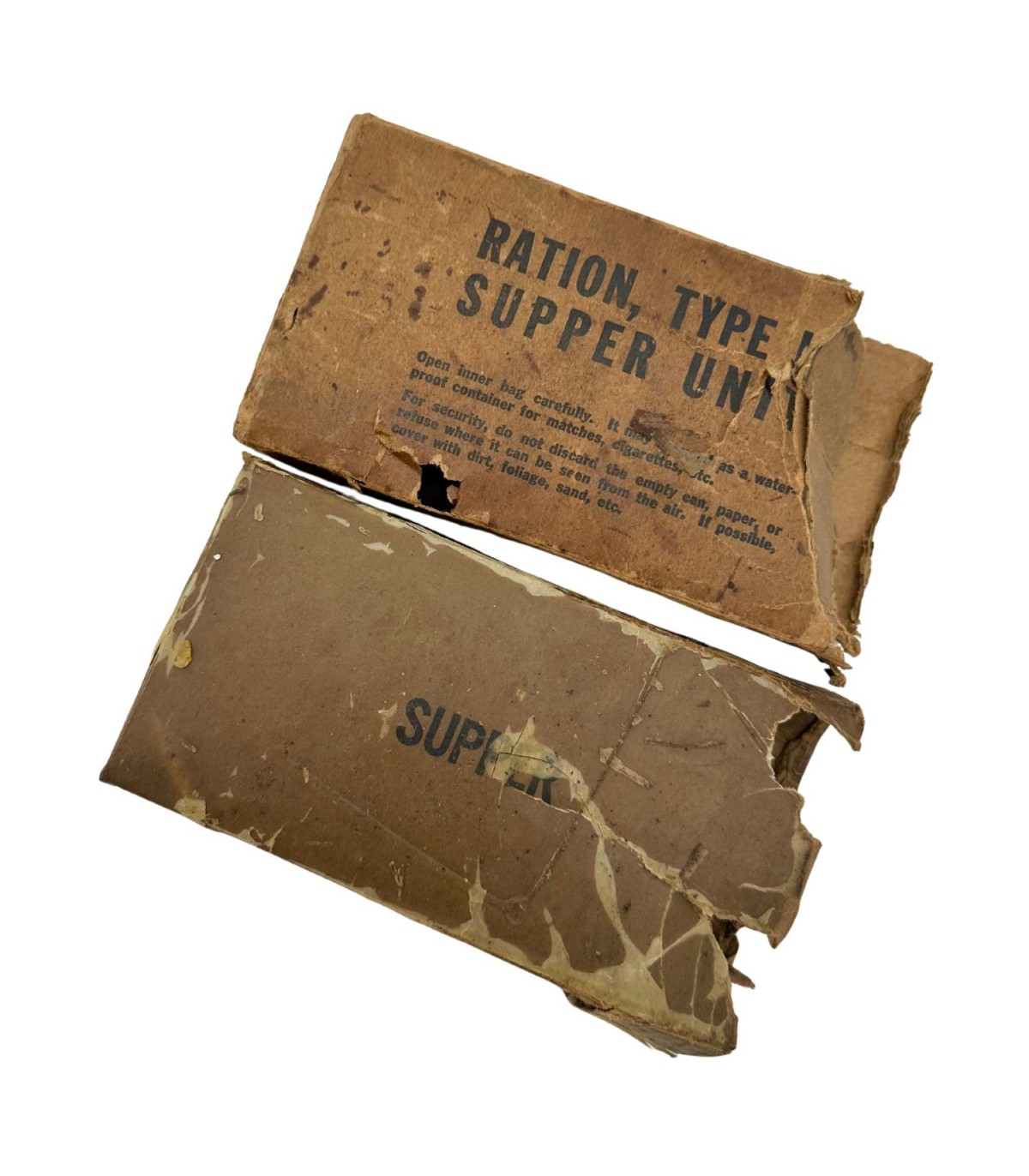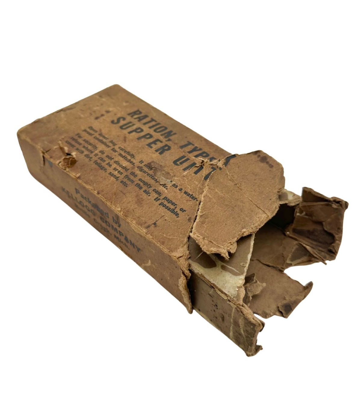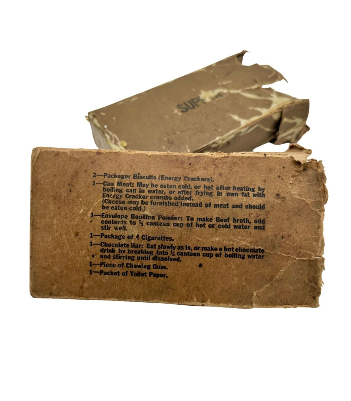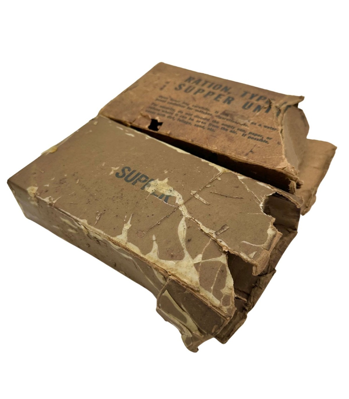 Cette ration était destinée au repas du midi (Supper Unit) et contenait à l’époque divers produits de première nécessité pour soutenir les troupes : biscuits, viande en conserve, bonbons, chewing-gums et poudre pour boisson chaude. Bien que vide aujourd’hui, la boîte conserve sa structure d’origine, offrant un témoignage tangible du système logistique militaire américain durant le conflit.