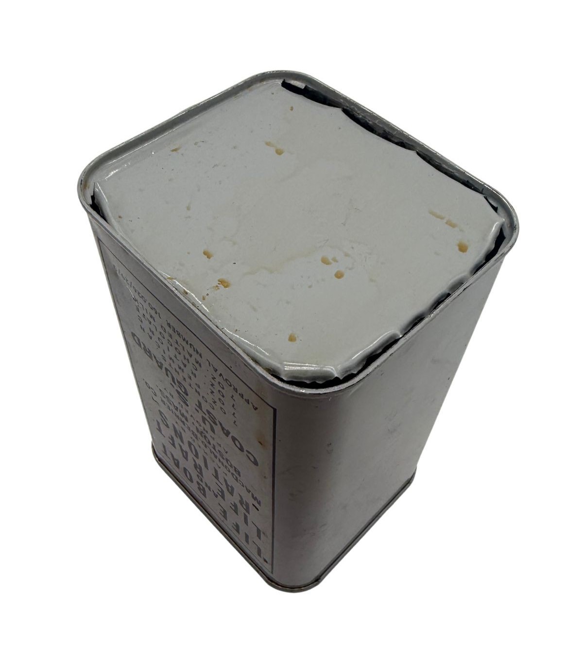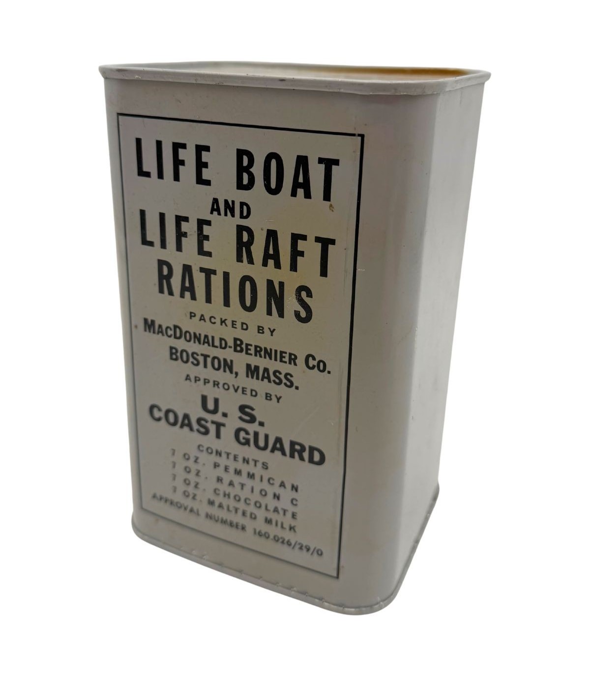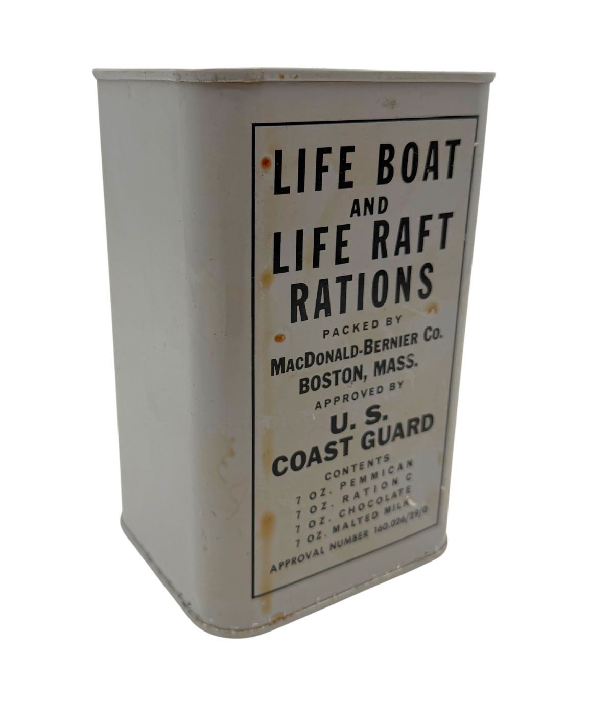Cette boîte métallique, intitulée "Life Boat and Life Raft Rations", est une pièce emblématique de l'équipement de secours de l'U.S. Coast Guard. Ces conteneurs étaient stockés dans les canots et radeaux de sauvetage des navires marchands et militaires, ainsi que dans les avions de patrouille maritime. Packagée par la firme MacDonald-Bernier Co. à Boston, elle contient la liste des aliments énergétiques essentiels à la survie en mer : pemmican, ration C, chocolat et lait malté. C’est un objet qui illustre parfaitement l'organisation méticuleuse de l'intendance américaine pour faire face aux situations de détresse dans l'Atlantique ou le Pacifique.