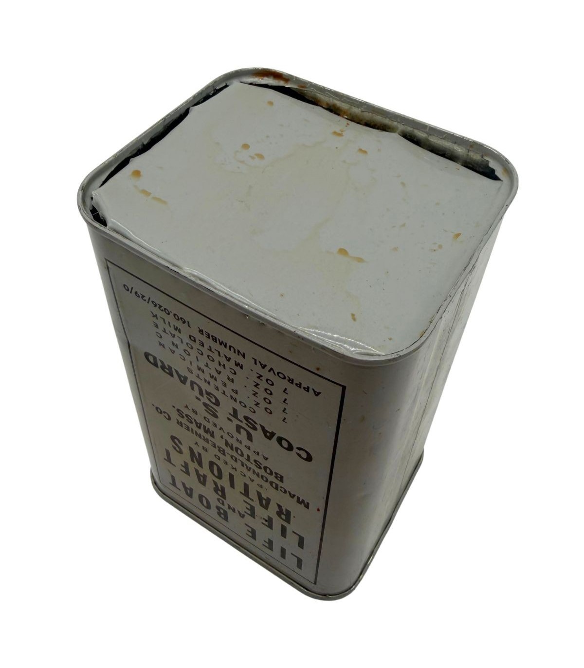 Pièce emblématique du sauvetage maritime, cette boîte "Life Boat and Life Raft Rations" équipait les canots et radeaux de l'U.S. Navy et des Coast Guards. Packagée par MacDonald-Bernier Co., elle contenait les vivres énergétiques vitaux (pemmican, chocolat, lait malté) pour la survie en Atlantique ou dans le Pacifique