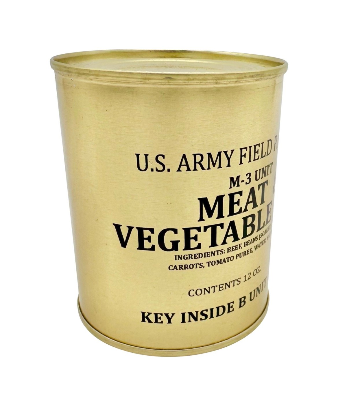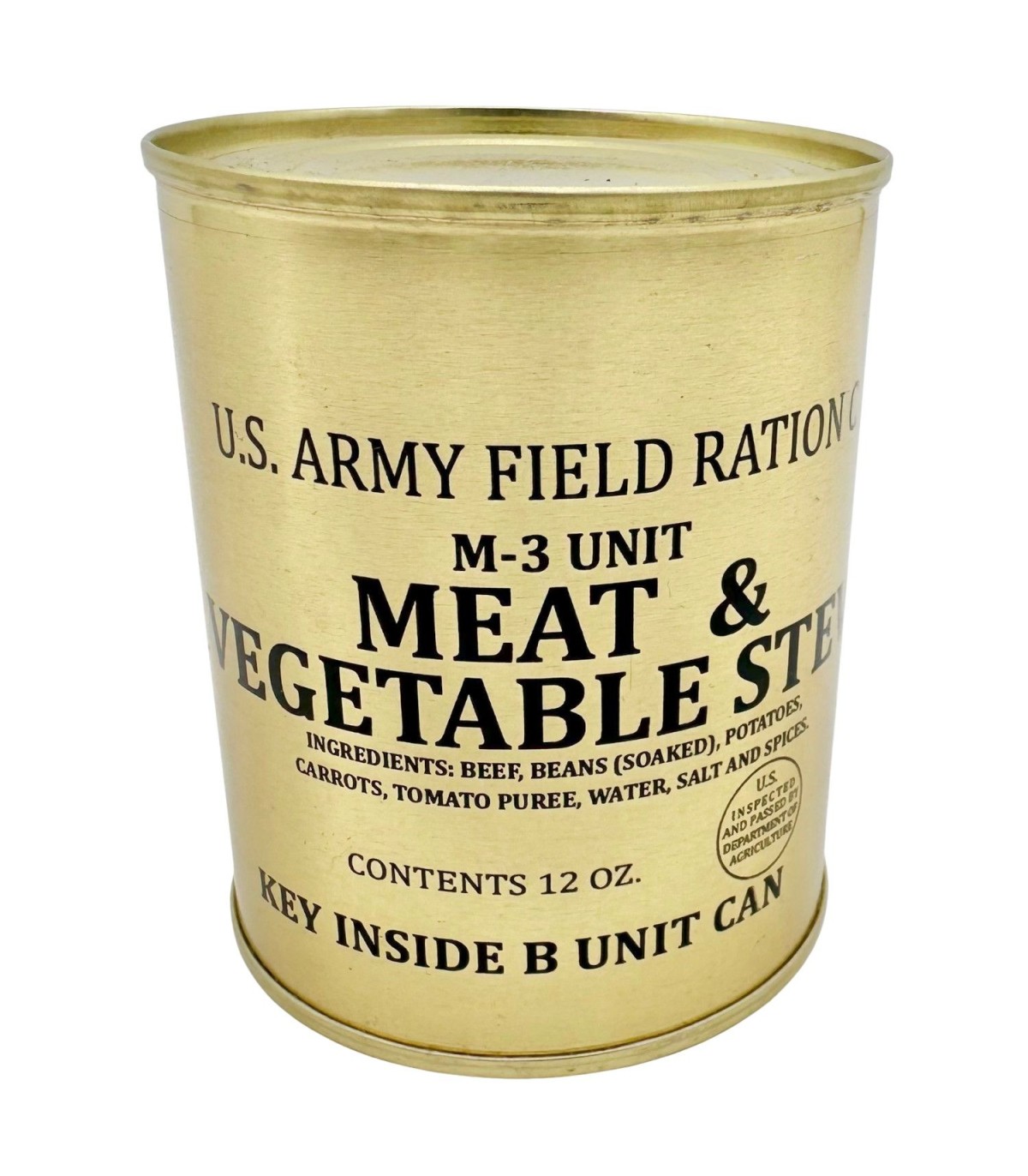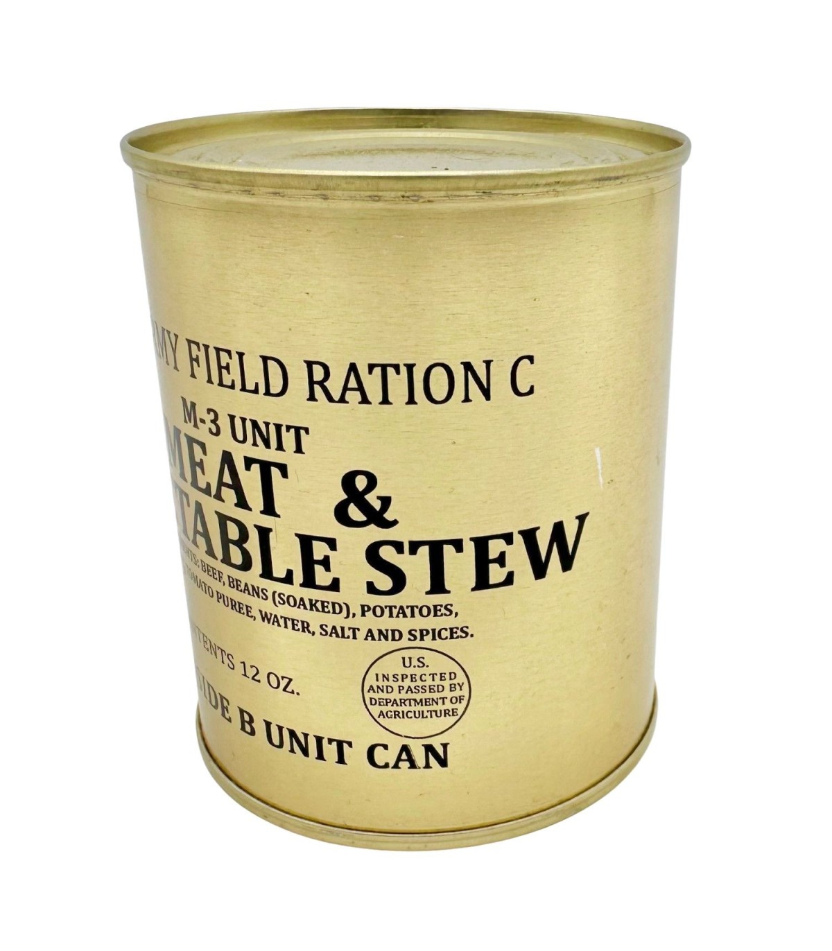 Reproduction de la ration "C" américaine. Dans l'armée de terre américaine, la ration C était une ration individuelle, prête à manger et en boîte de conserve. Elle était distribuée lorsque la ration A (aliments frais) ou la ration B (aliments en conserve à préparer en cuisine pour un groupe de soldats), étaient peu pratiques ou indisponibles, et que les rations de survie (ration K ou ration D) étaient inadaptées.