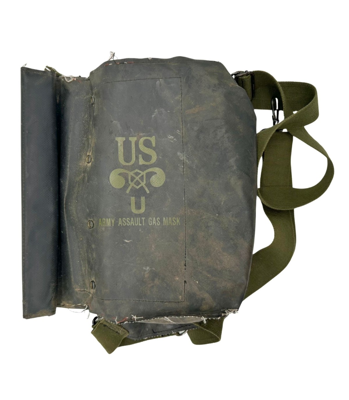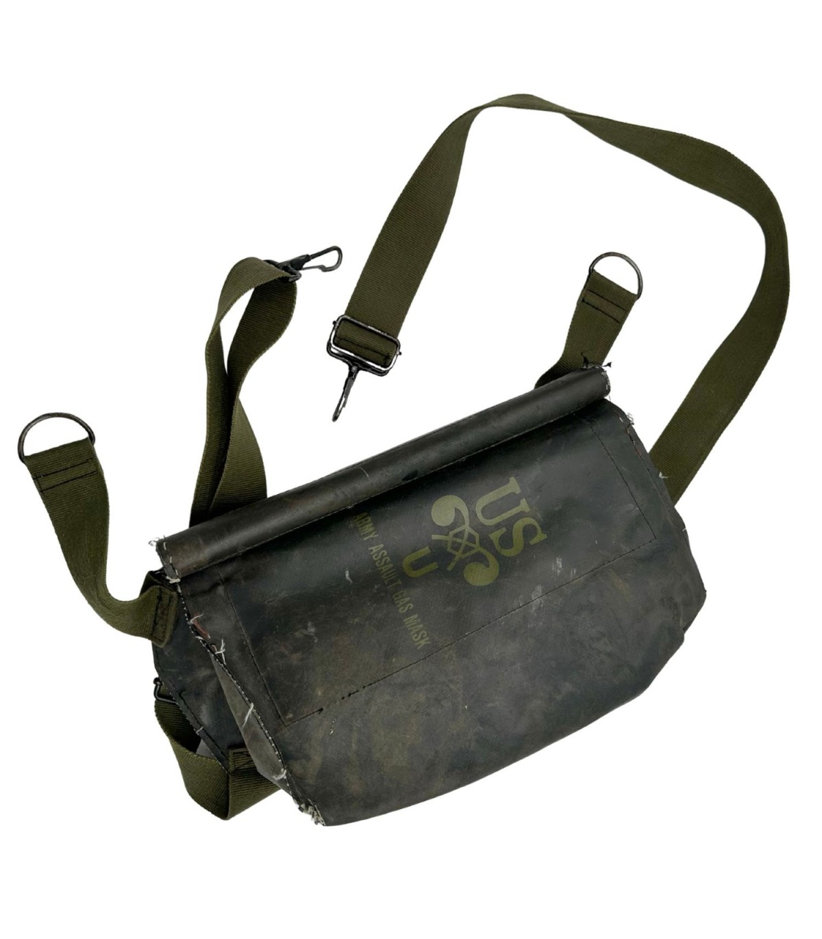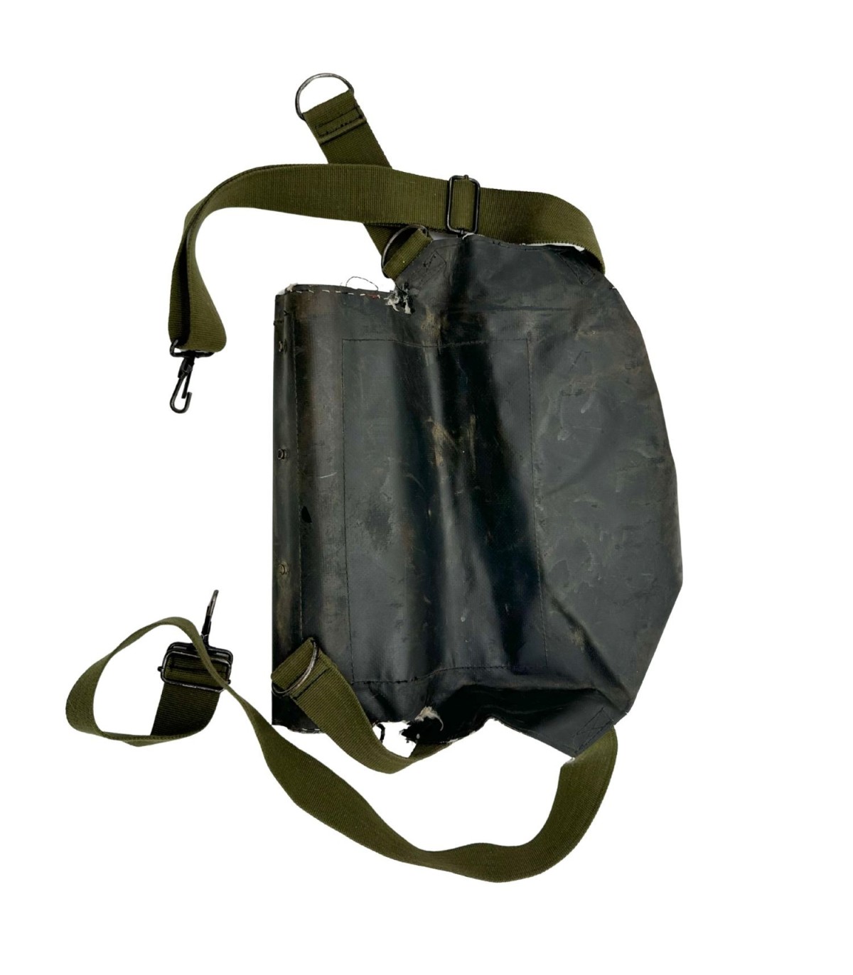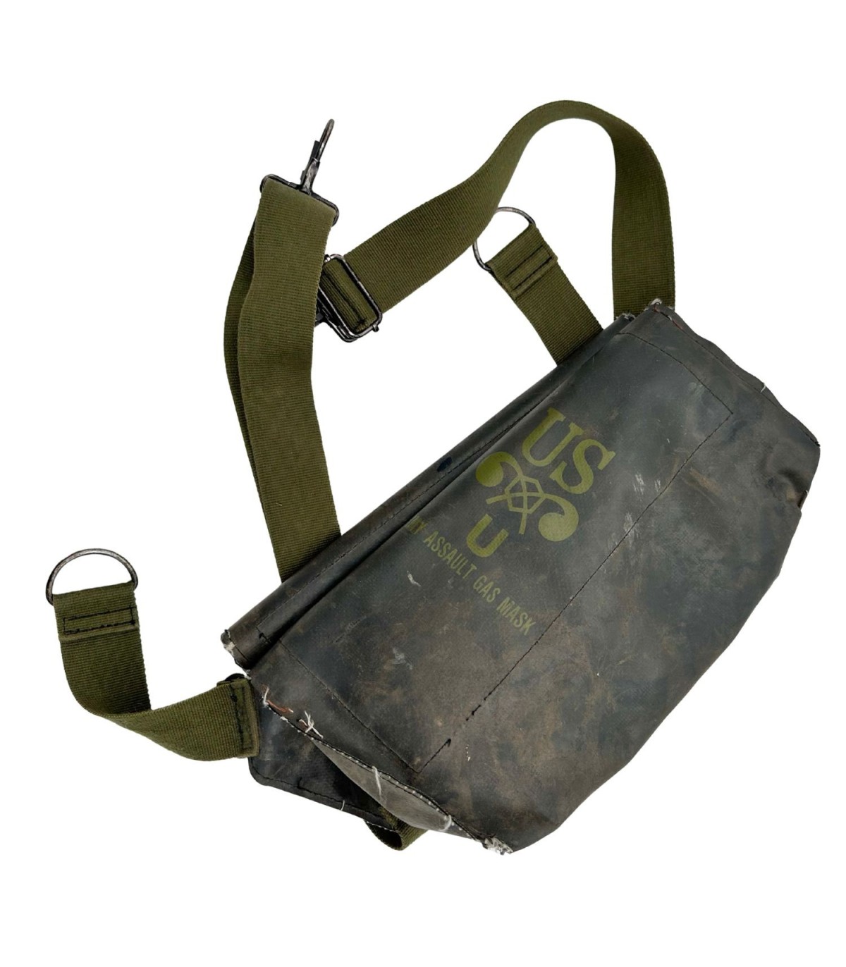Reproduction de la housse M7 pour masque à gaz de type M5. Cette reproduction a une patine et est complète ; pressions fonctionnelles, crochets également.