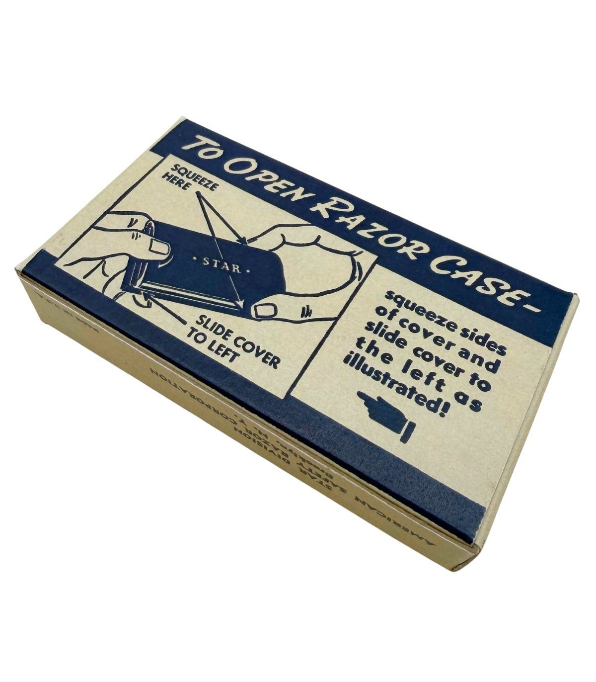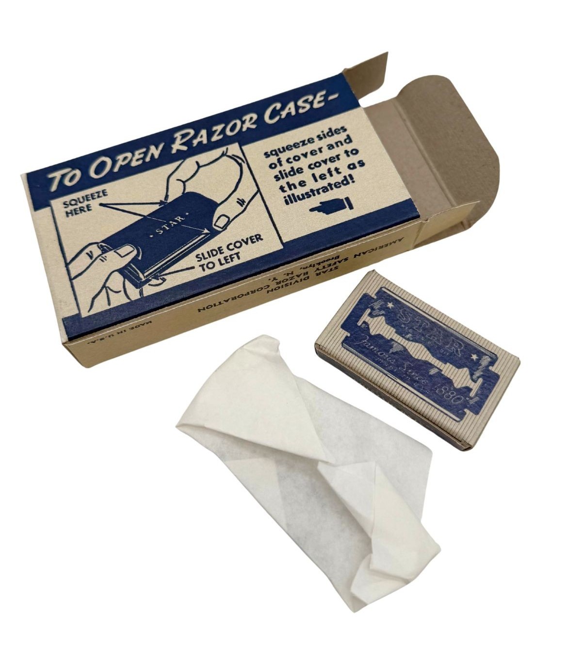 Détails d'époque : Instructions illustrées "To open razor case" et boîte de lames assortie.