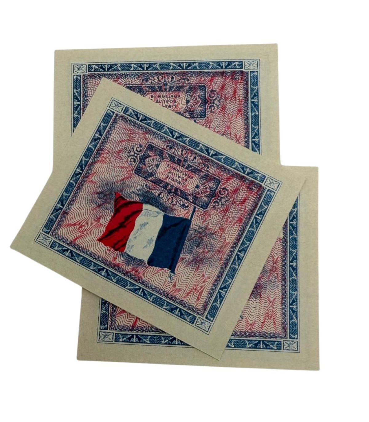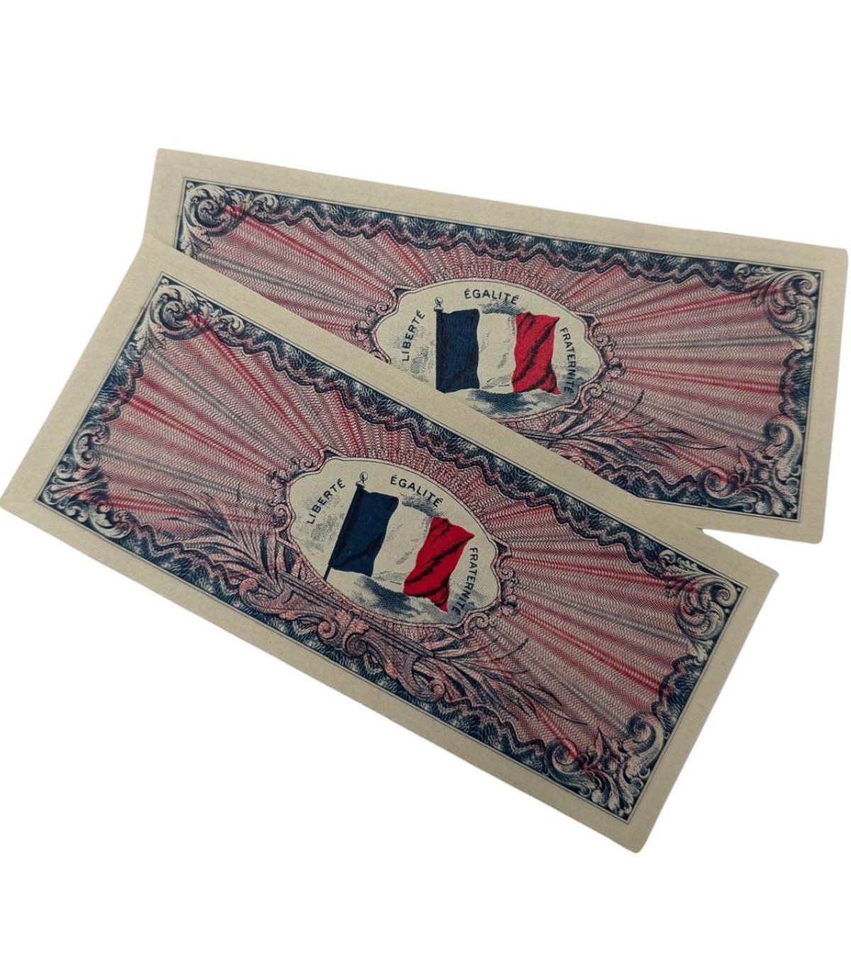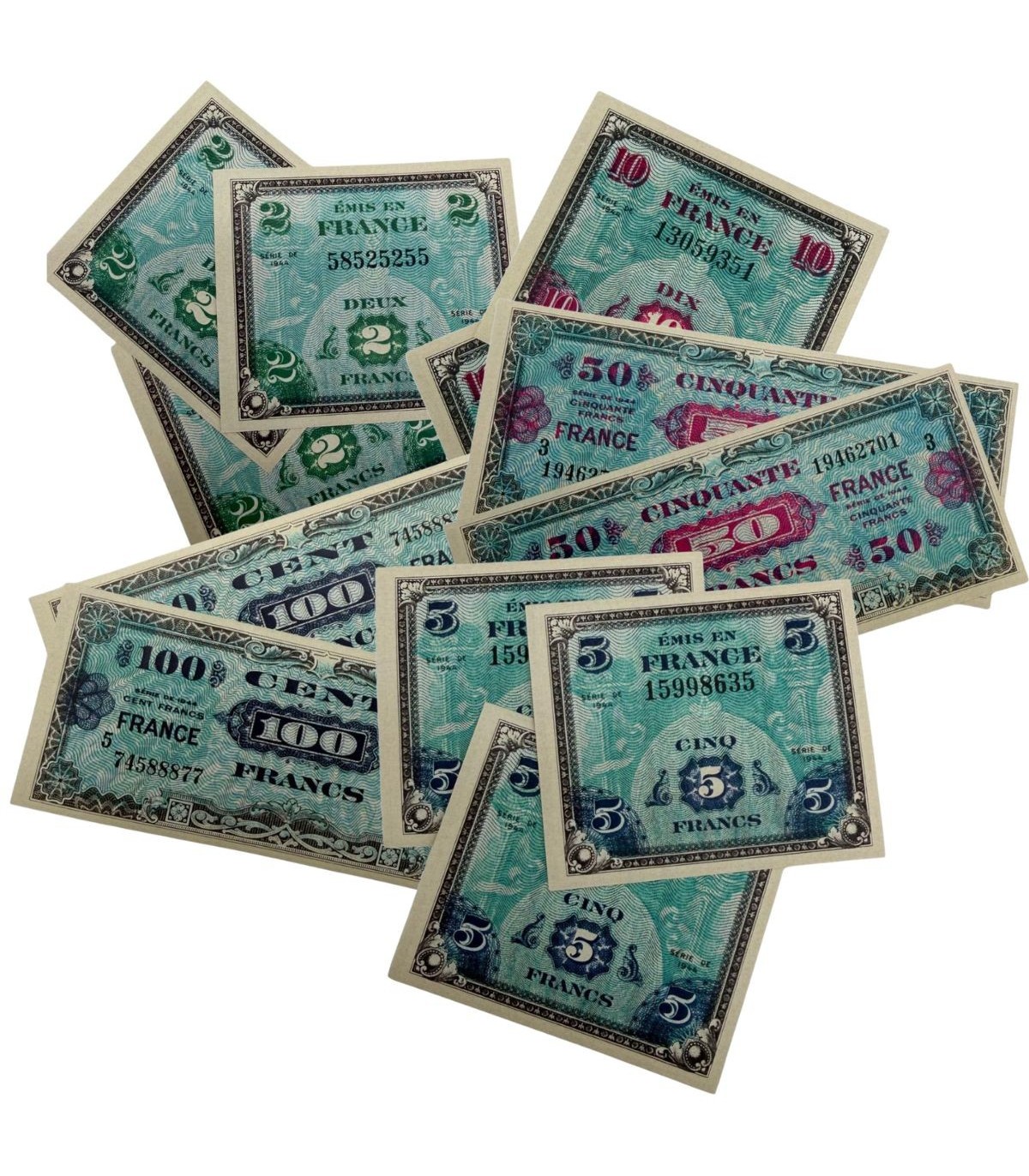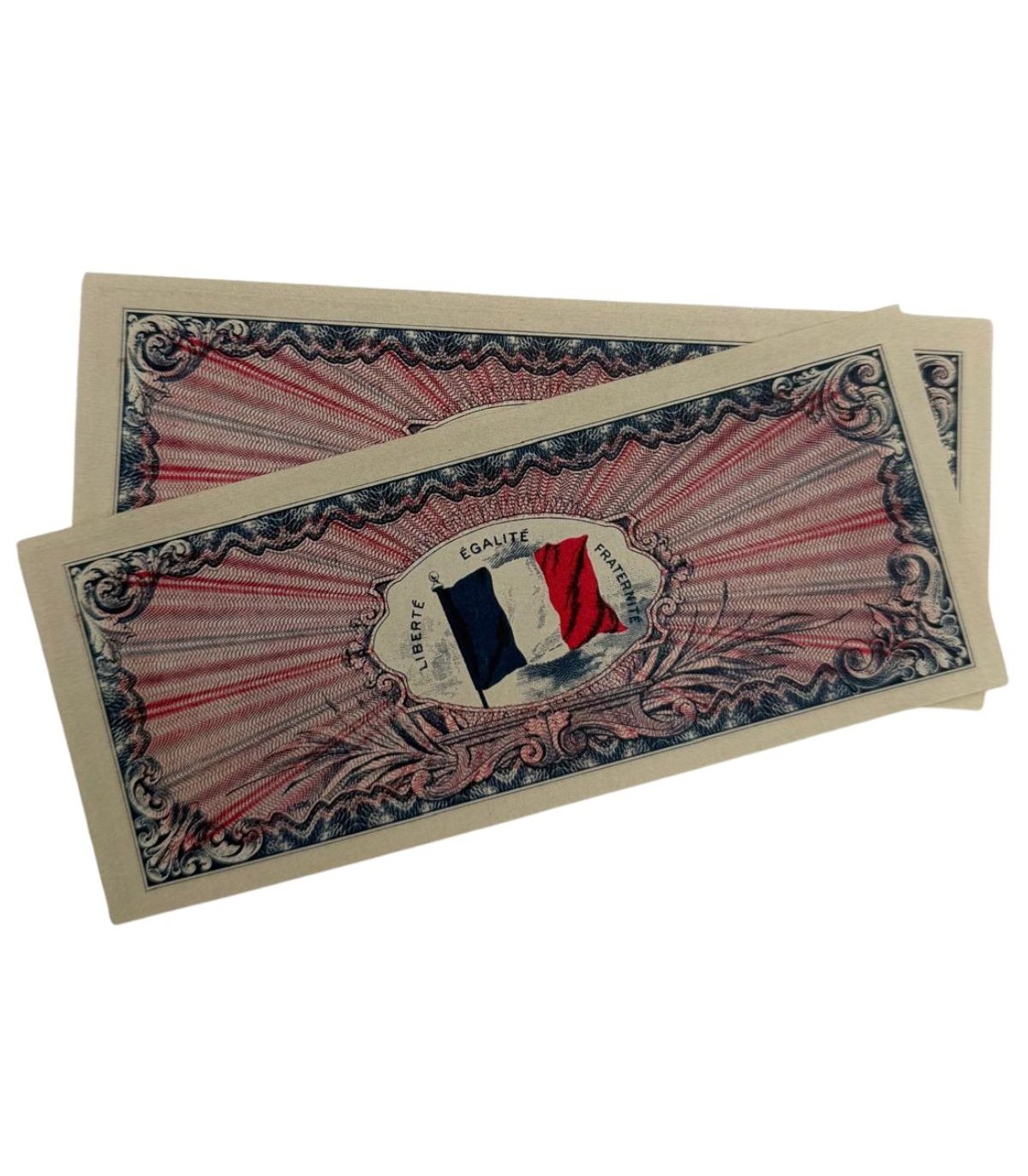 Ce lot de 12 billets reproduit la monnaie de nécessité imprimée aux États-Unis et mise en circulation lors du débarquement en Normandie. Appelés "billets drapeau" en raison du drapeau tricolore au verso, ils étaient utilisés par les soldats pour leurs dépenses quotidiennes en France libérée.