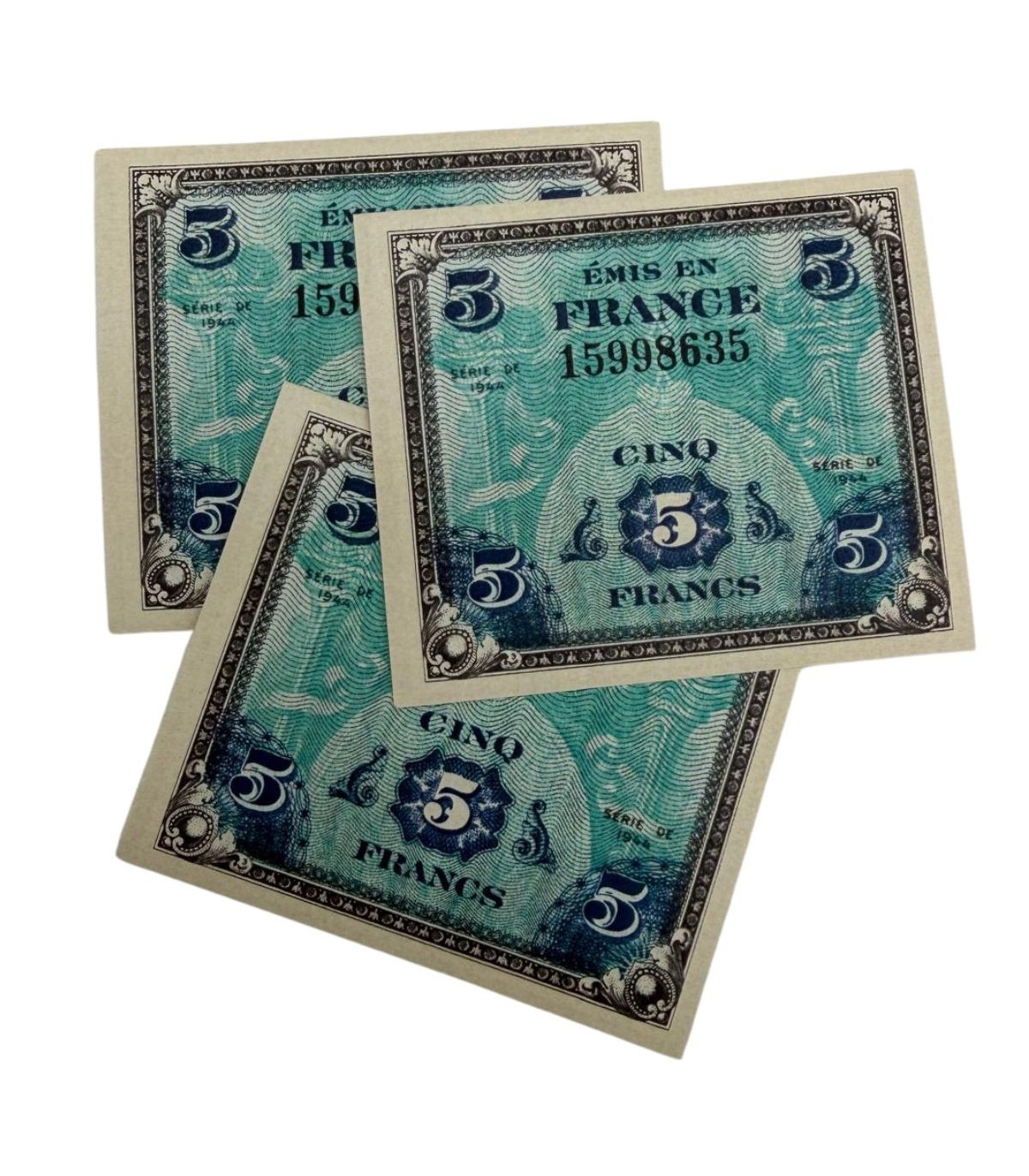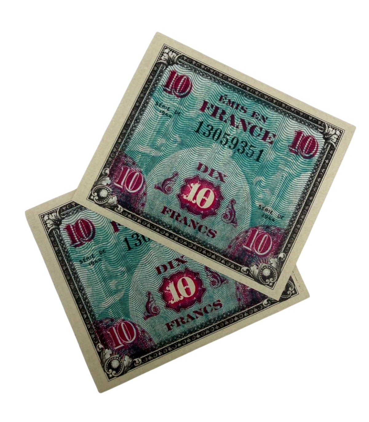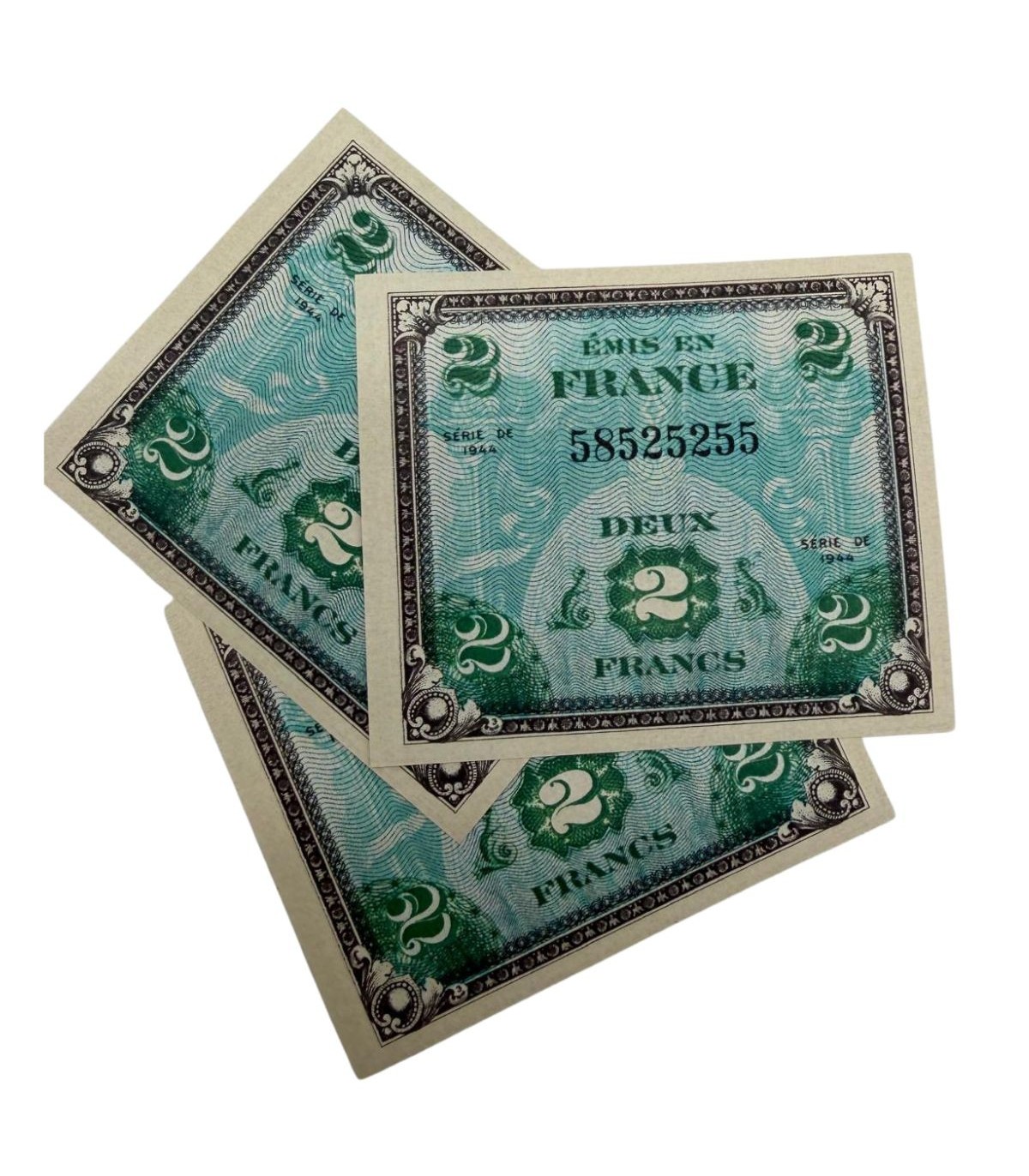 Ce lot de 12 billets reproduit la monnaie de nécessité imprimée aux États-Unis et mise en circulation lors du débarquement en Normandie. Appelés "billets drapeau" en raison du drapeau tricolore au verso, ils étaient utilisés par les soldats pour leurs dépenses quotidiennes en France libérée.