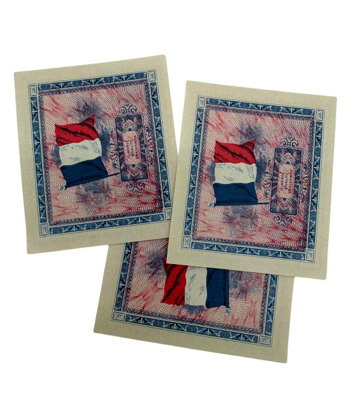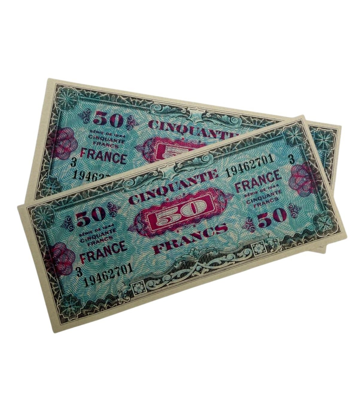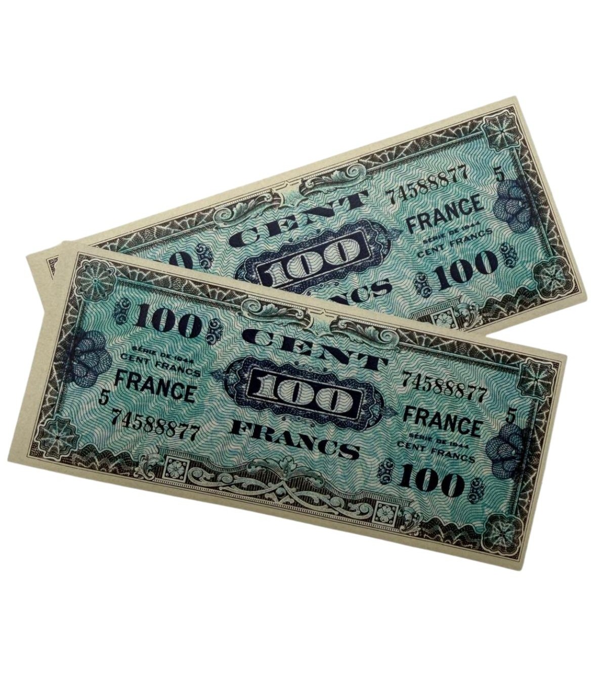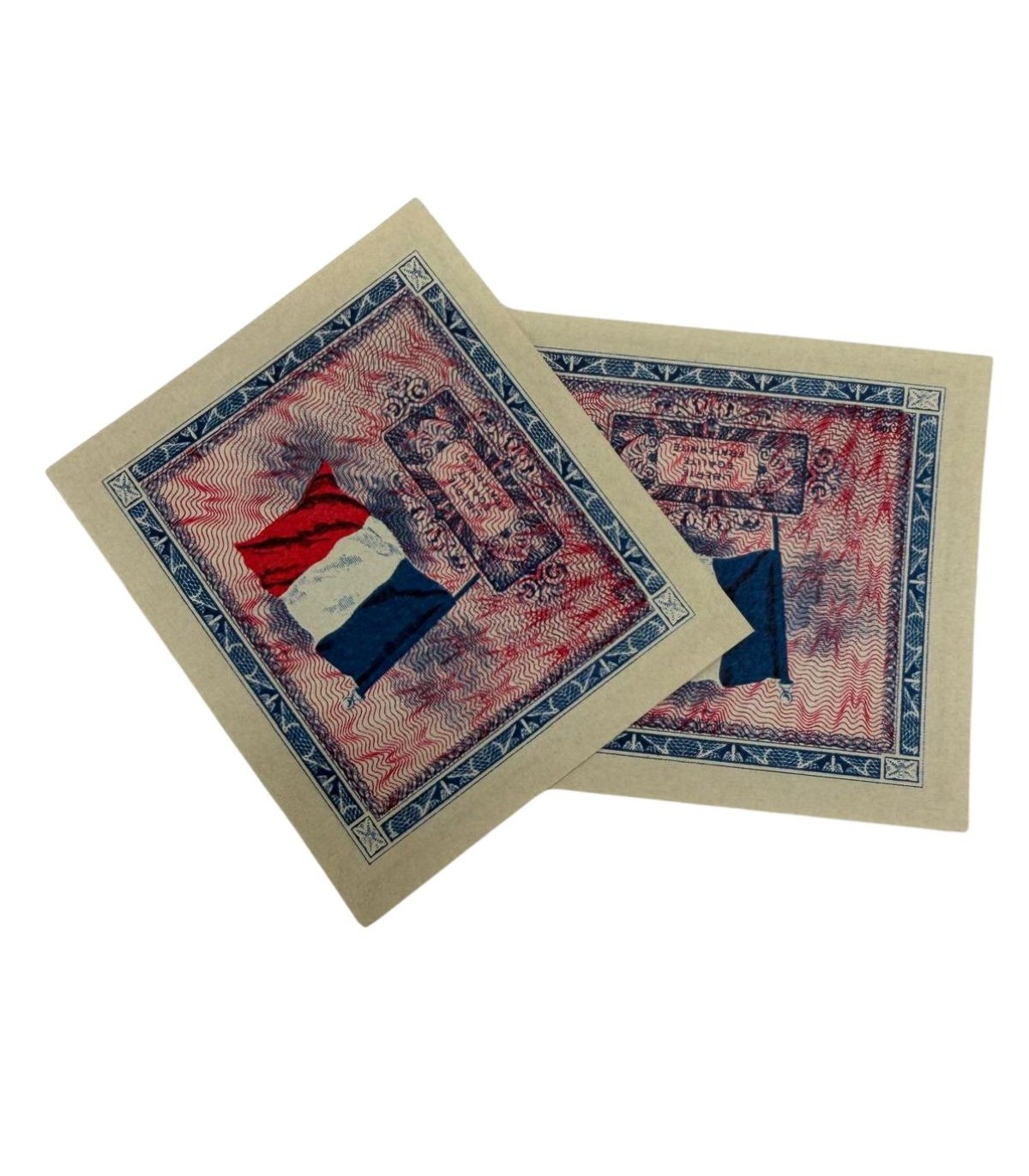 Ce lot de 12 billets reproduit la monnaie de nécessité imprimée aux États-Unis et mise en circulation lors du débarquement en Normandie. Appelés "billets drapeau" en raison du drapeau tricolore au verso, ils étaient utilisés par les soldats pour leurs dépenses quotidiennes en France libérée.