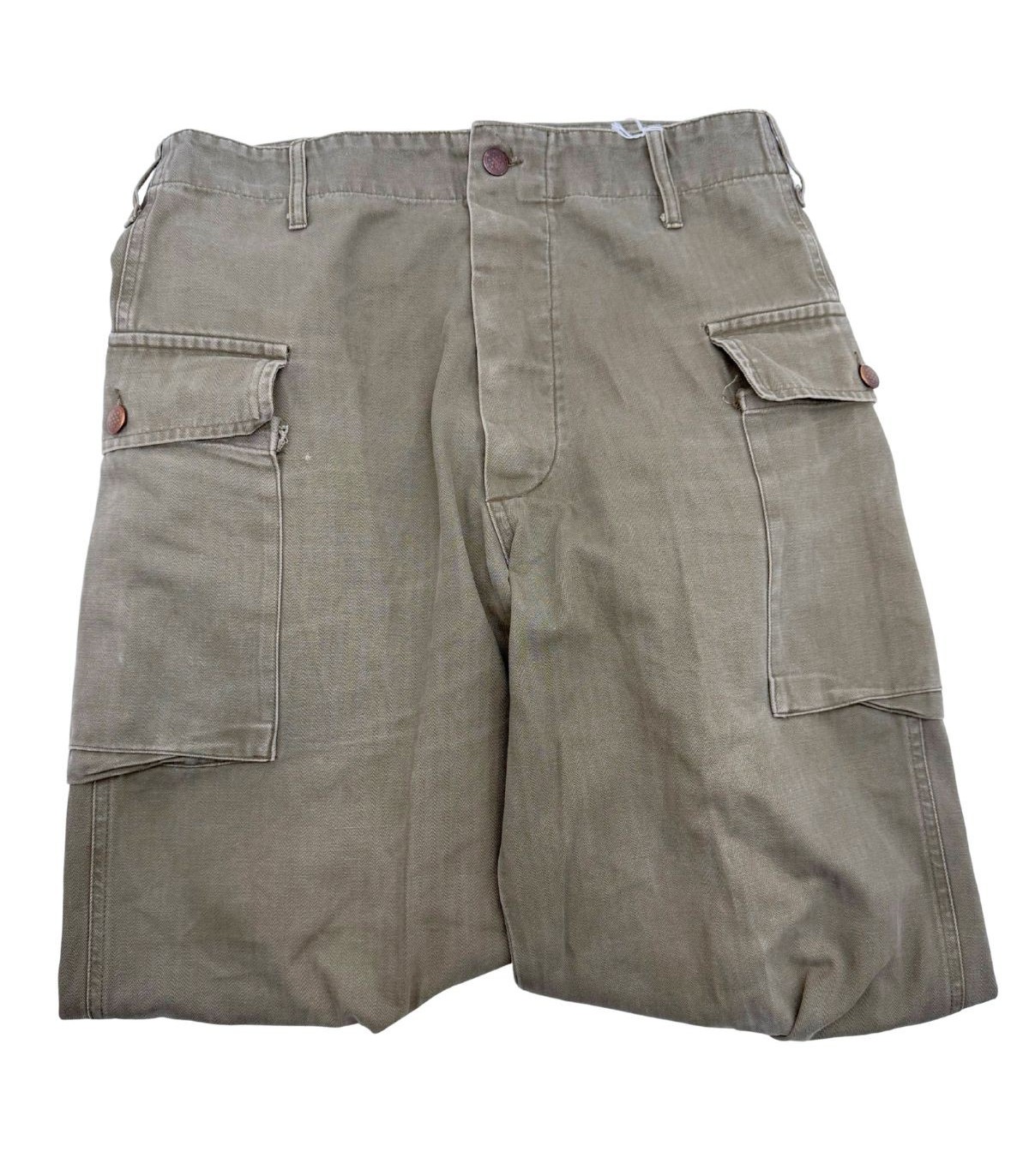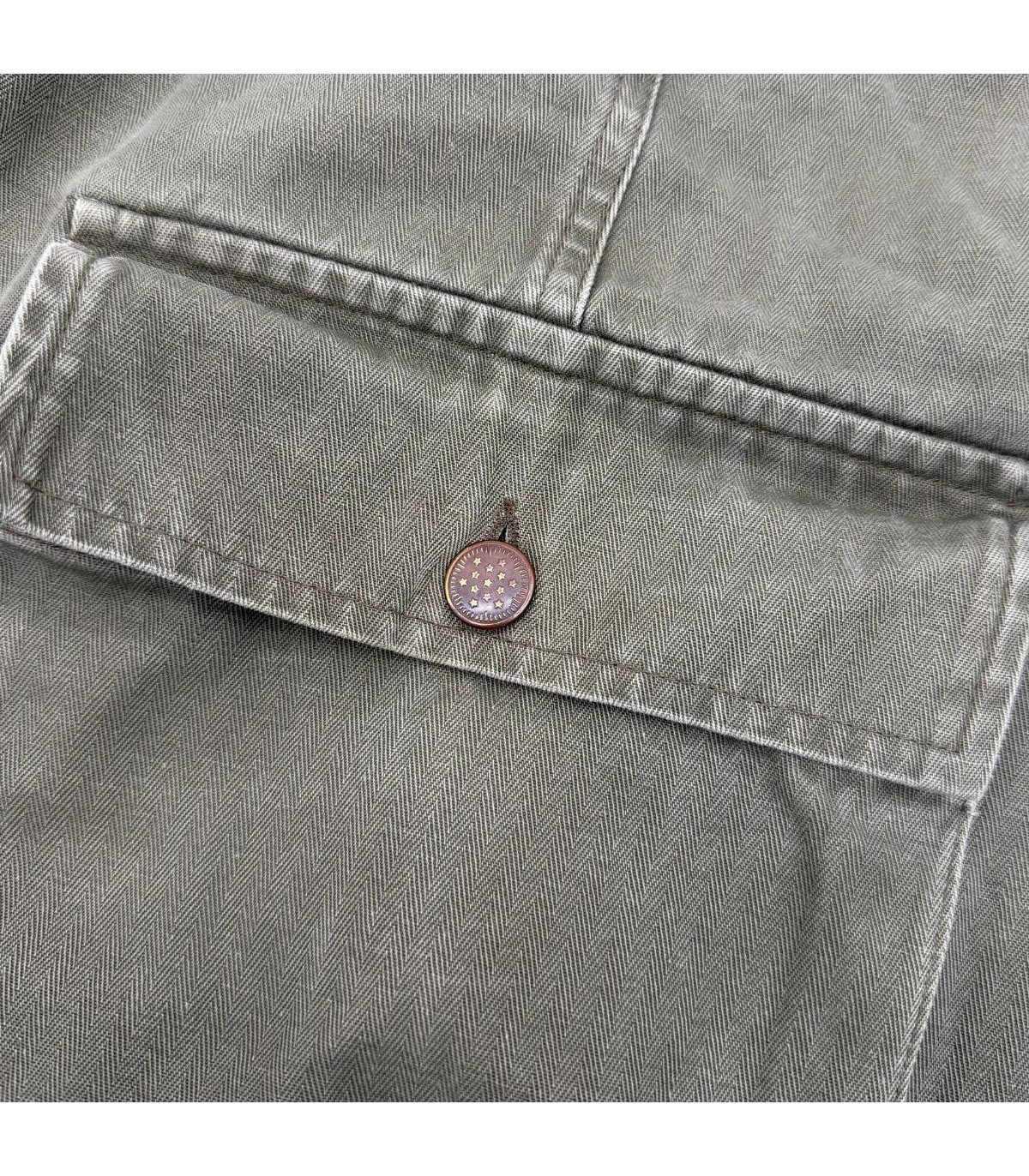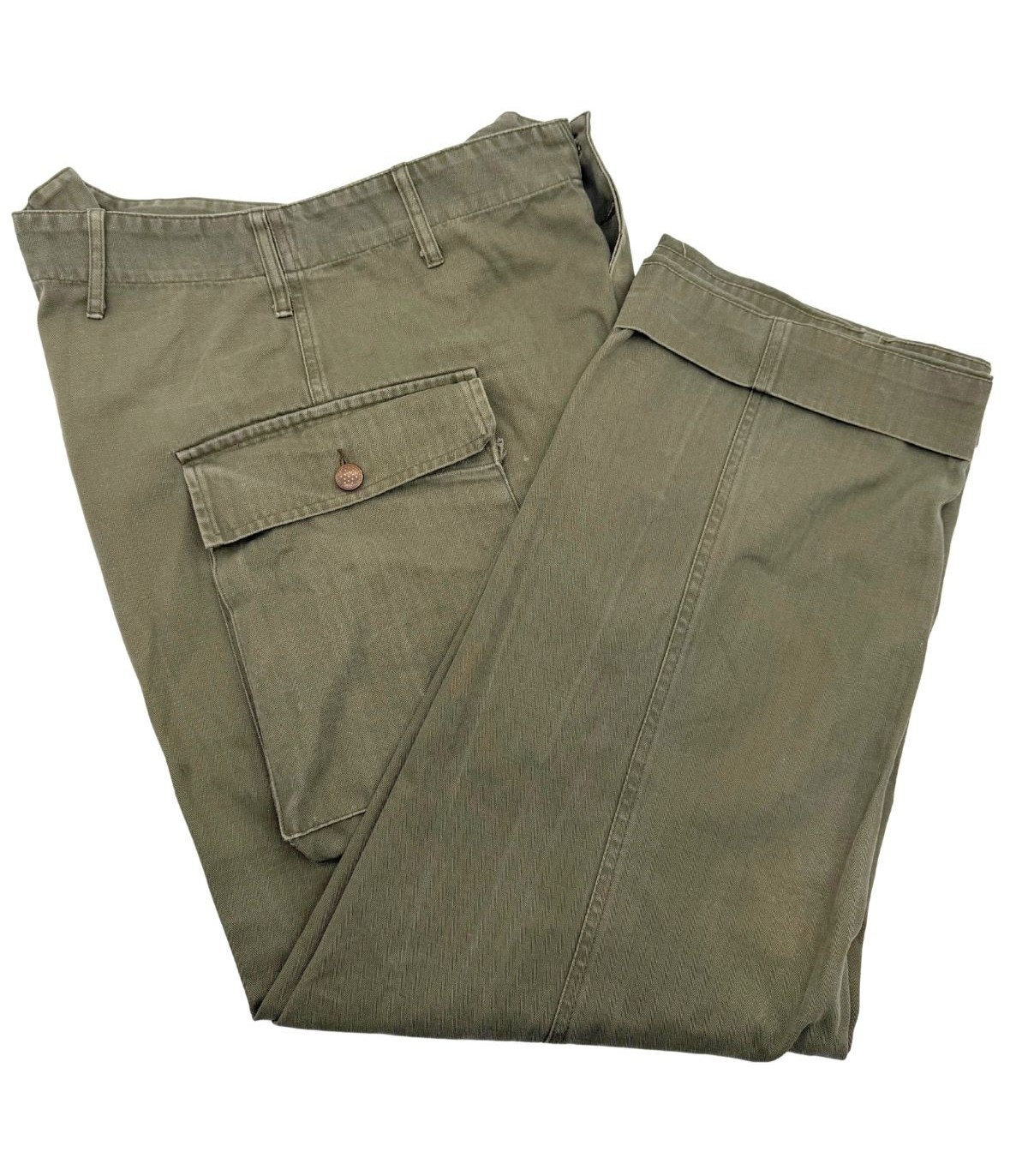 Ce pantalon en toile Herringbone Twill (HBT) est une reproduction ancienne, souvent appréciée pour la qualité de sa toile de coton épaisse, plus proche des originaux que certaines fabrications modernes légères. Il reprend la coupe caractéristique du modèle M-1943 avec ses deux grandes poches cargo latérales à soufflets.