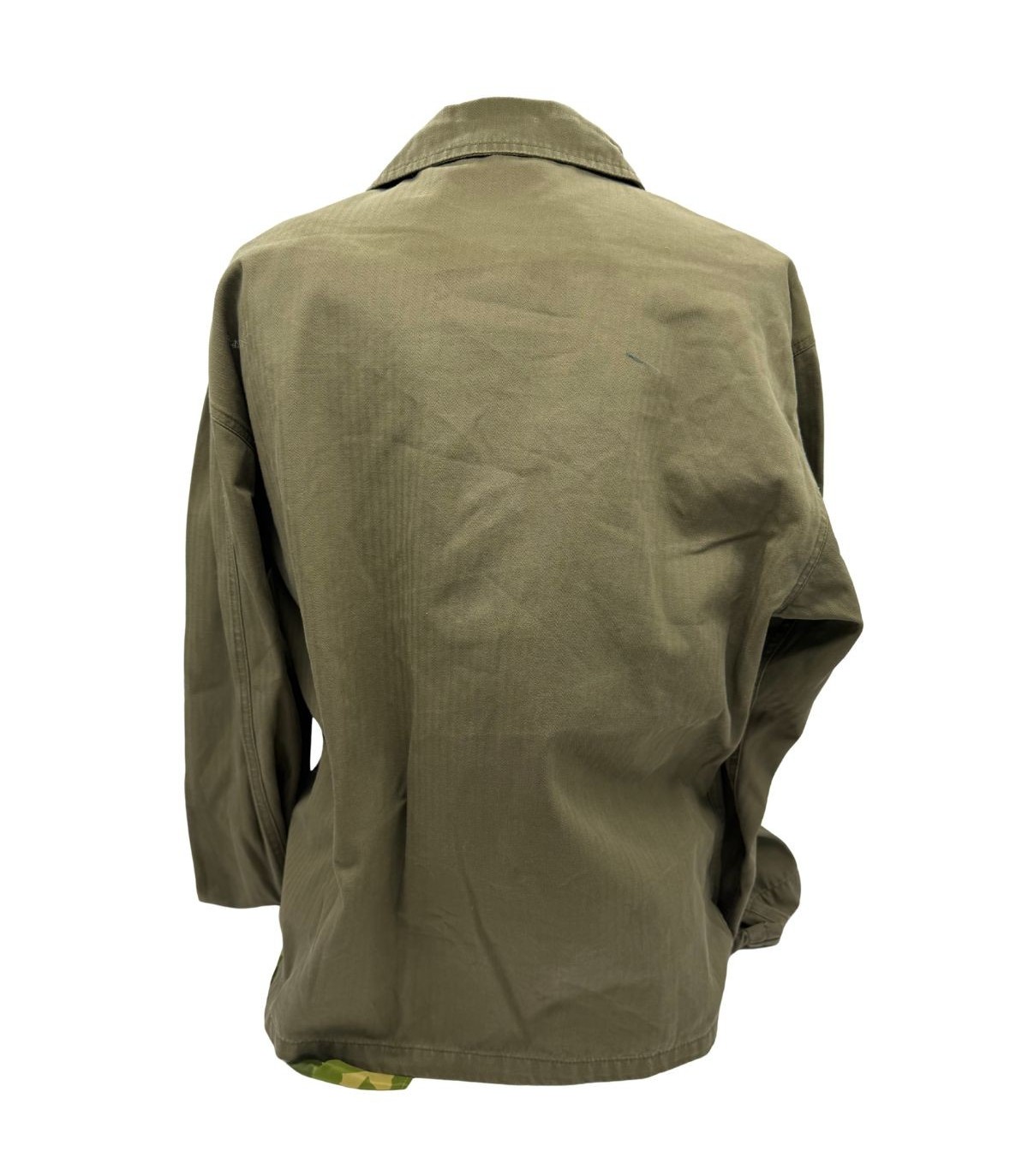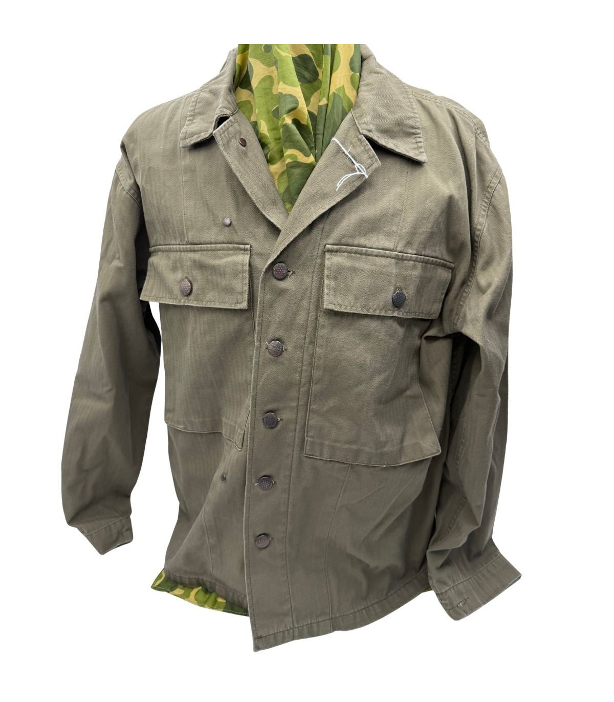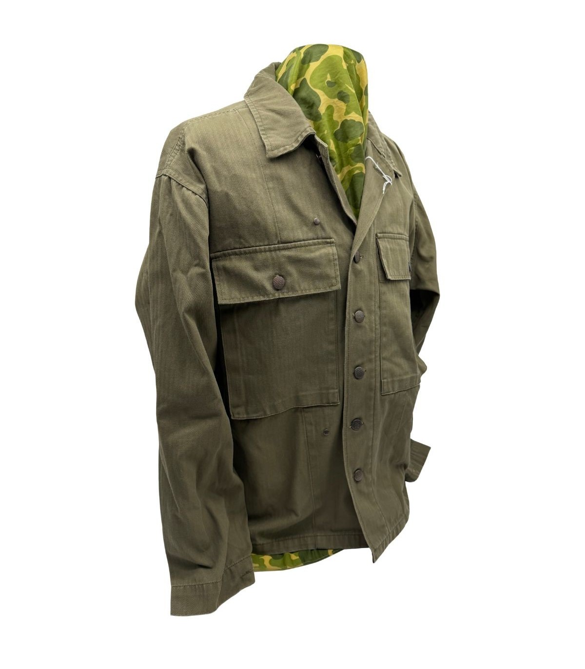 Cette veste en toile Herringbone Twill (HBT) est une reproduction ancienne de haute qualité. Contrairement à d'autres exemplaires de terrain, celle-ci a été parfaitement conservée. Elle ne présente aucun défaut, ni accroc, ni bouton manquant, ce qui en fait la base idéale pour un soldat arrivant en renfort ou pour une tenue de sortie de camp parfaitement entretenue.