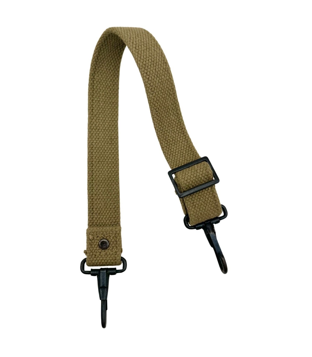 Petite sangle d'origine deuxième guerre réglable en coton filé de couleur olive drab. Elle servait à réunir les deux Pouch pour qu'elles restent plaquées contre les hanches, grâce à la fixation des deux crochets M-1910 sur les anneaux des pouch Médical Bags. Elles pouvaient aussi étre utilisées pour le portage à la main de la sacoche. Aucun marquage, ni date sur la petite sangle.
