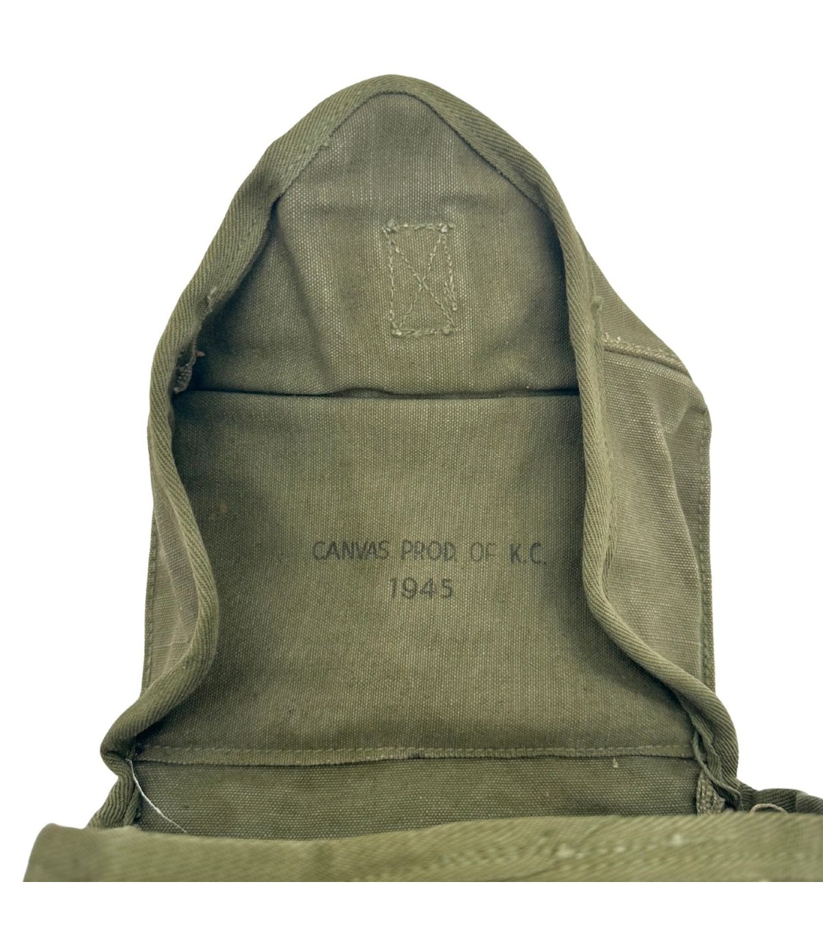 Musette General Purpose GP fabriquée par Canvas Prod OF K.C d'origine deuxième guerre et datée de 1945. Cette musette de couleur OD7 est complète avec ses deux sangles et crochets de fixation.
