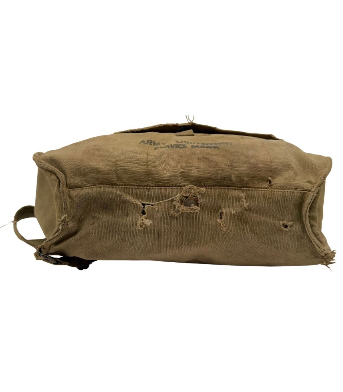 Modifications d'époque : Les crochets métalliques inférieurs ainsi que la petite sangle de serrage ont été supprimés. C'était une pratique courante chez les soldats qui trouvaient ces attaches inutiles ou gênantes une fois le masque à gaz jeté, préférant porter la musette librement en bandoulière.