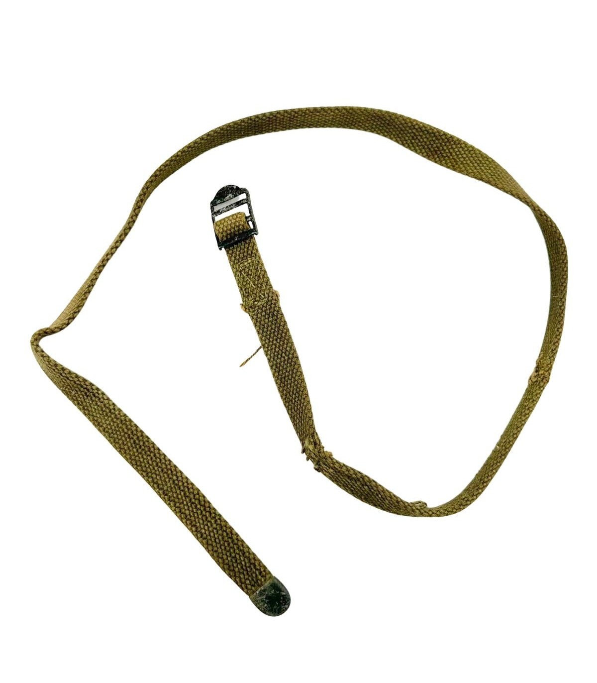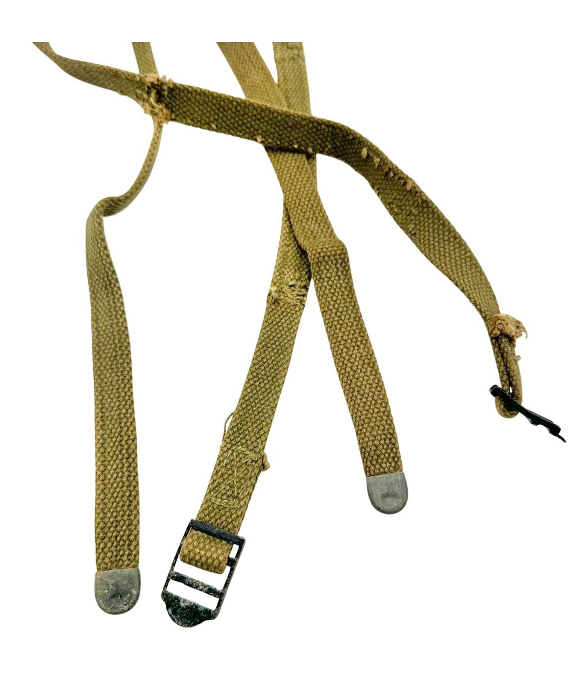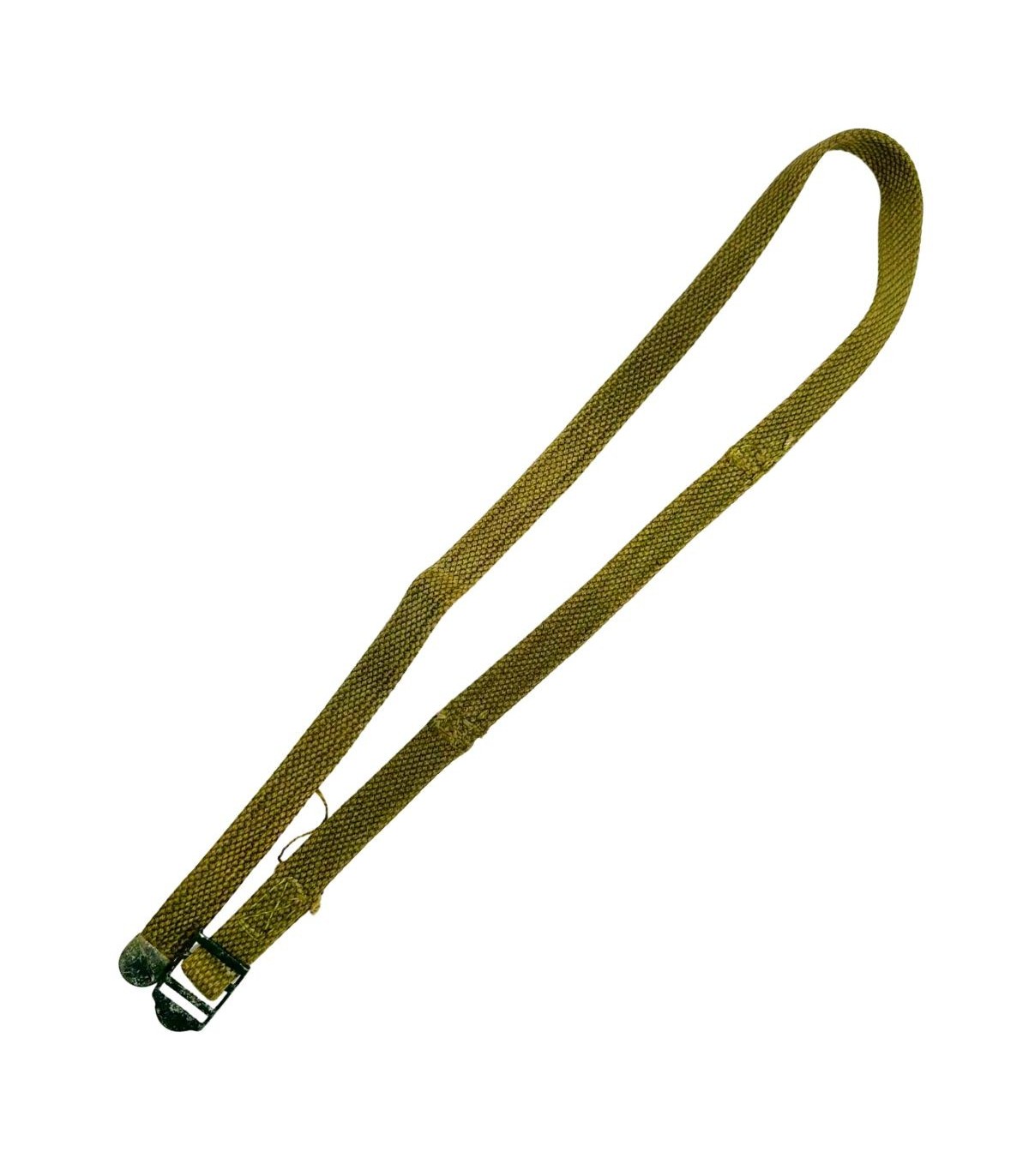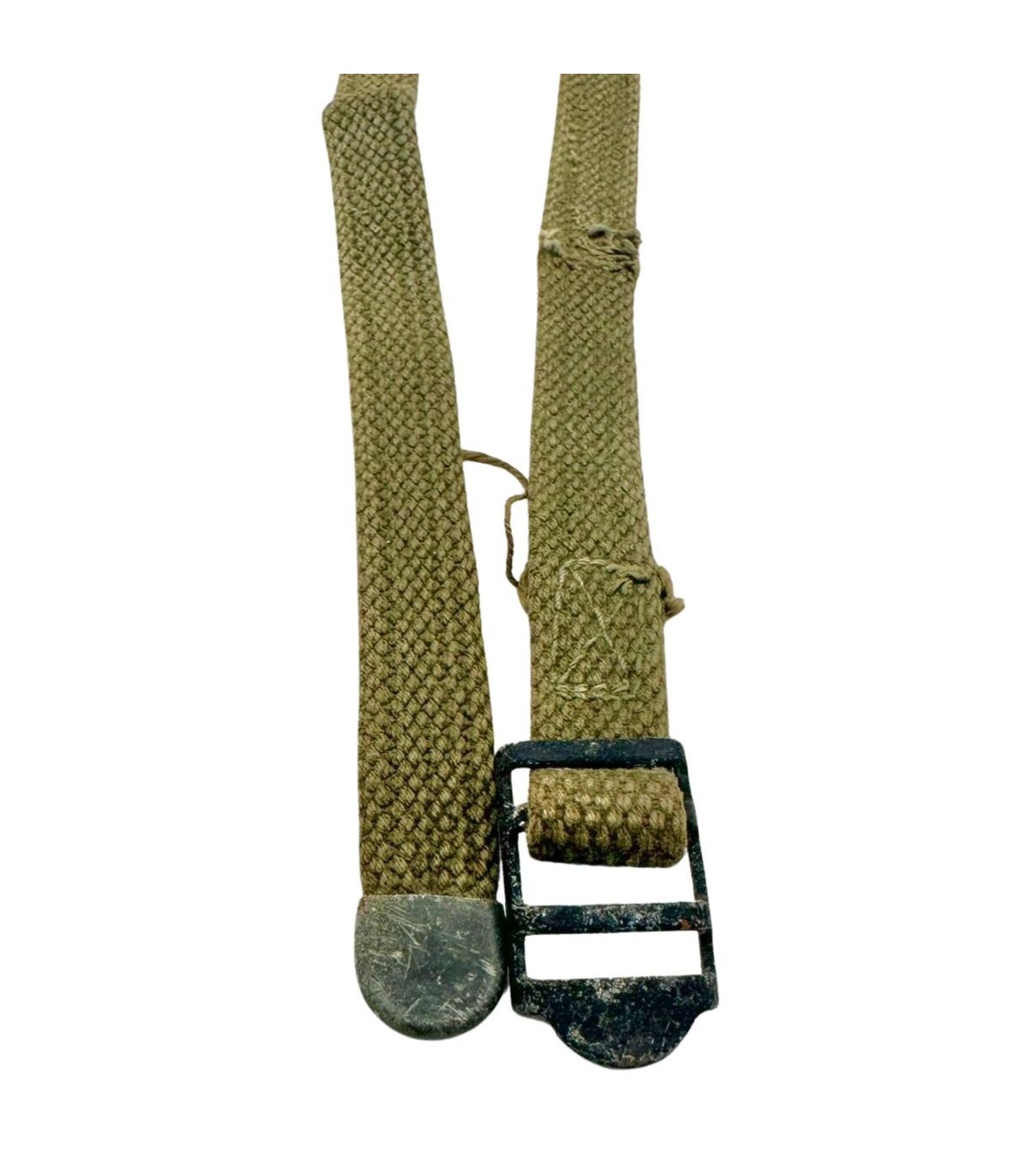 Cette sangle en toile OD3 provient d’un lit picot décousu, utilisée par les parachutistes US pour sécuriser le fourreau USM8 ou USM8A1 à la jambe durant les sauts ou marches.