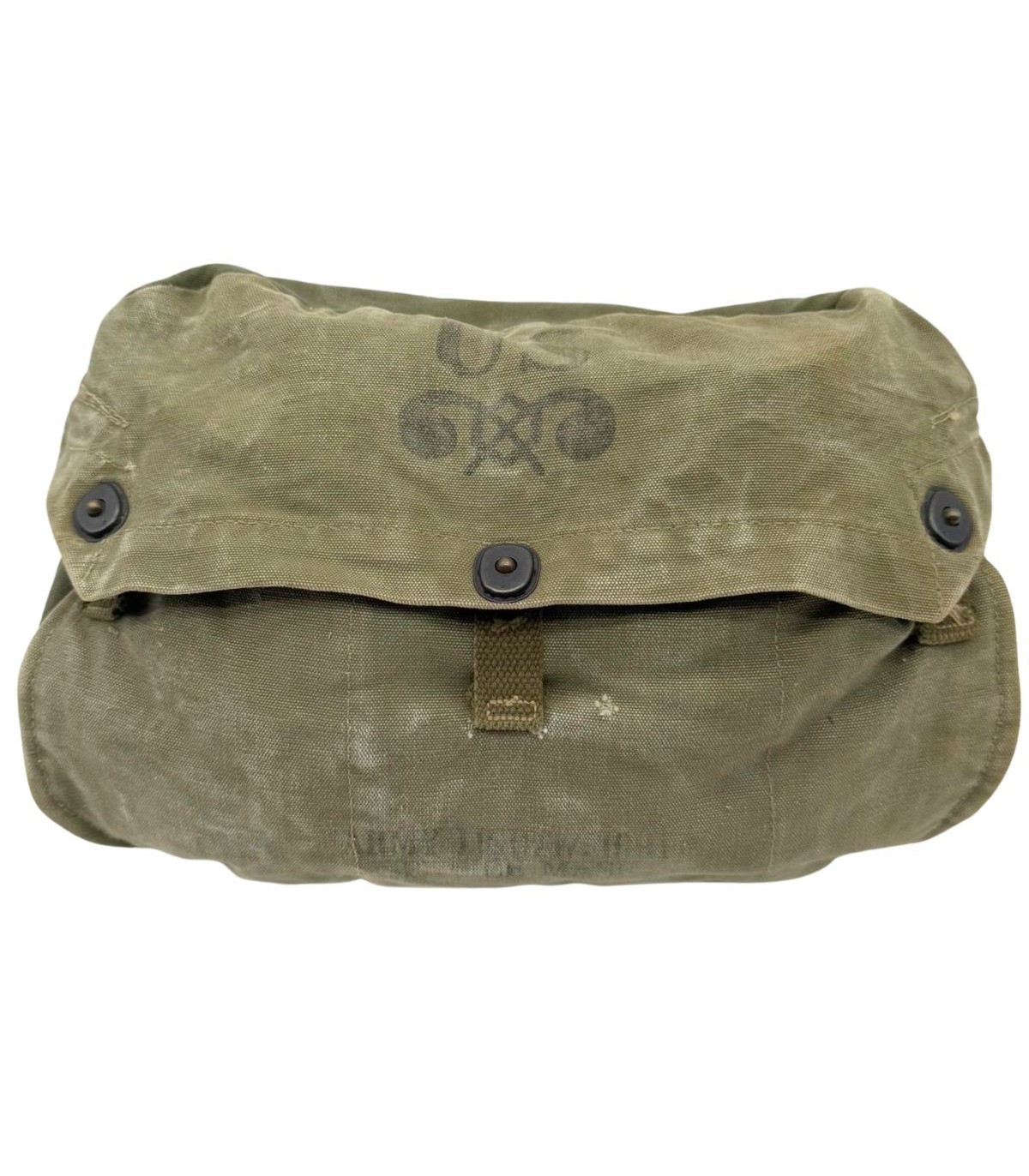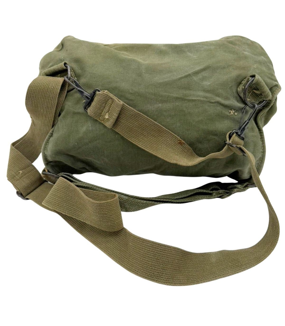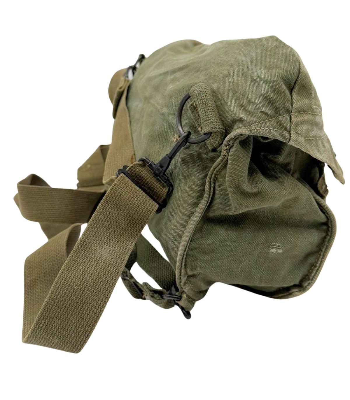 La musette M-6 est le sac de transport polyvalent par excellence des officiers, parachutistes et troupes motorisées. Cet exemplaire est un remarquable modèle "transitionnel", arborant un mélange de teintes contrastées entre le kaki OD#3 et le vert OD#7, une particularité de production très prisée des collectionneurs.