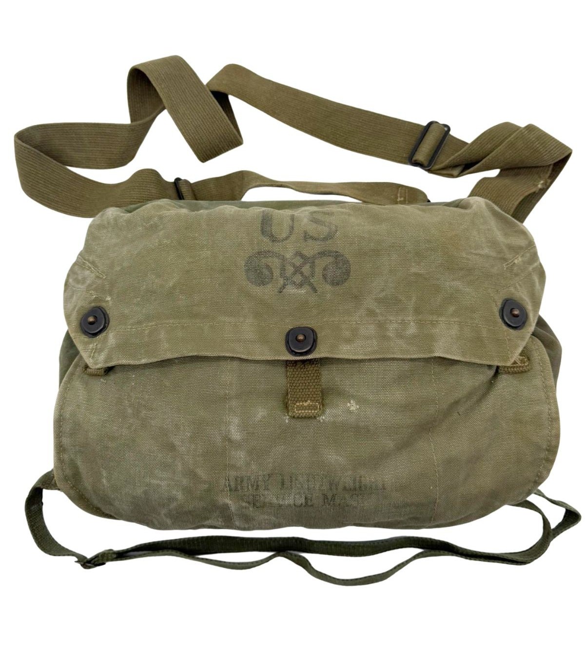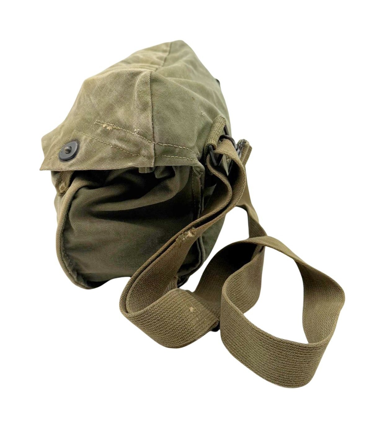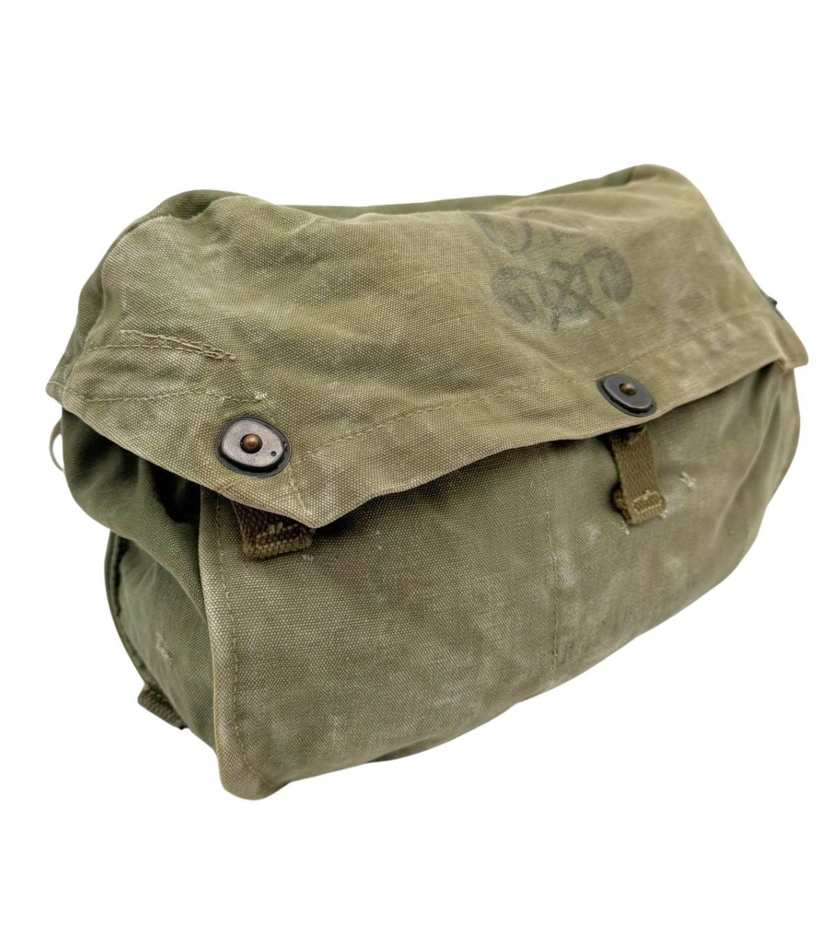 La musette M-6 est le sac de transport polyvalent par excellence des officiers, parachutistes et troupes motorisées. Cet exemplaire est un remarquable modèle "transitionnel", arborant un mélange de teintes contrastées entre le kaki OD#3 et le vert OD#7, une particularité de production très prisée des collectionneurs.