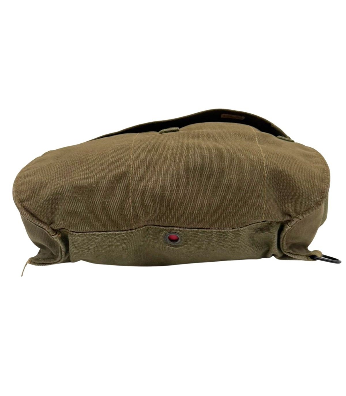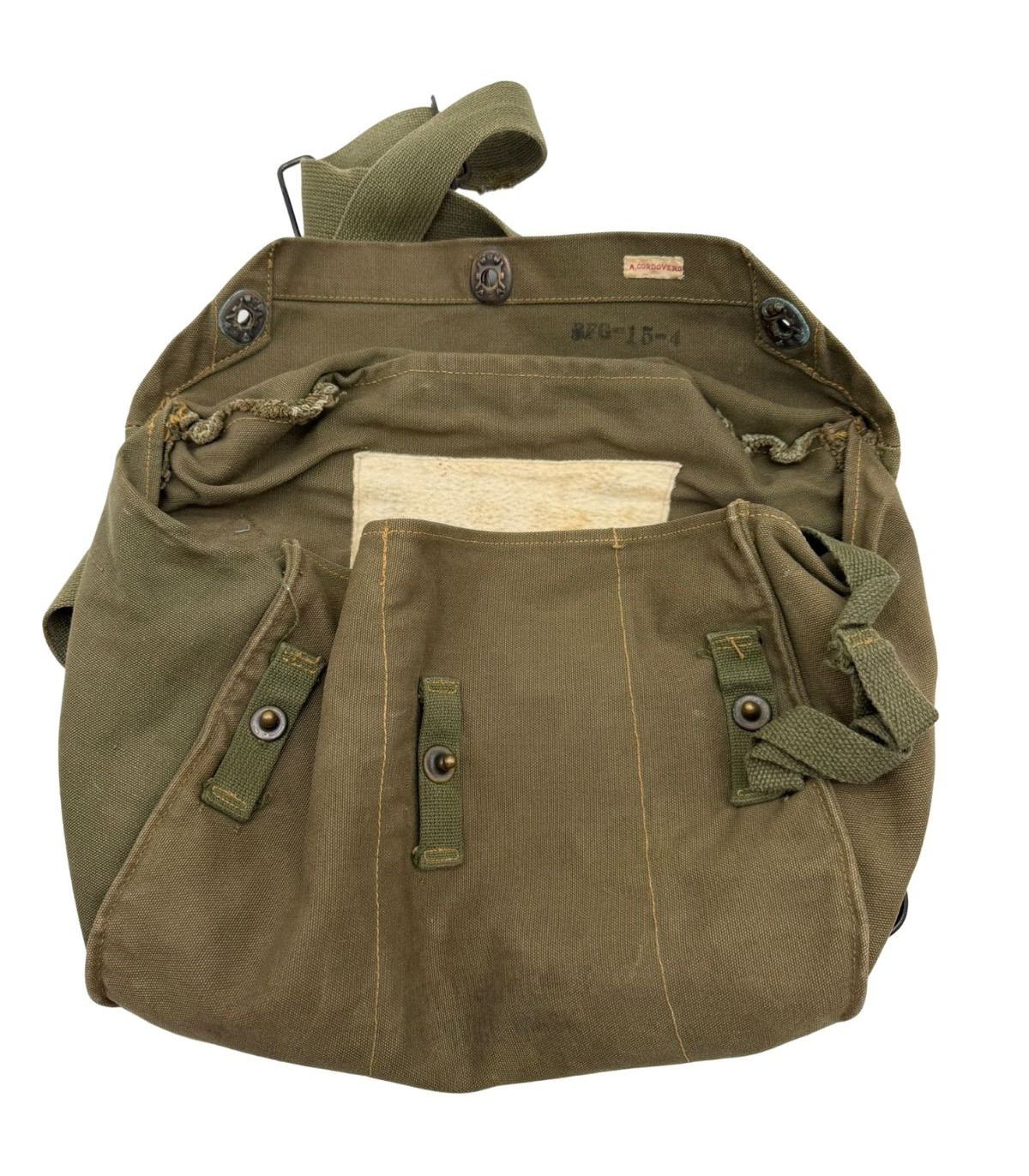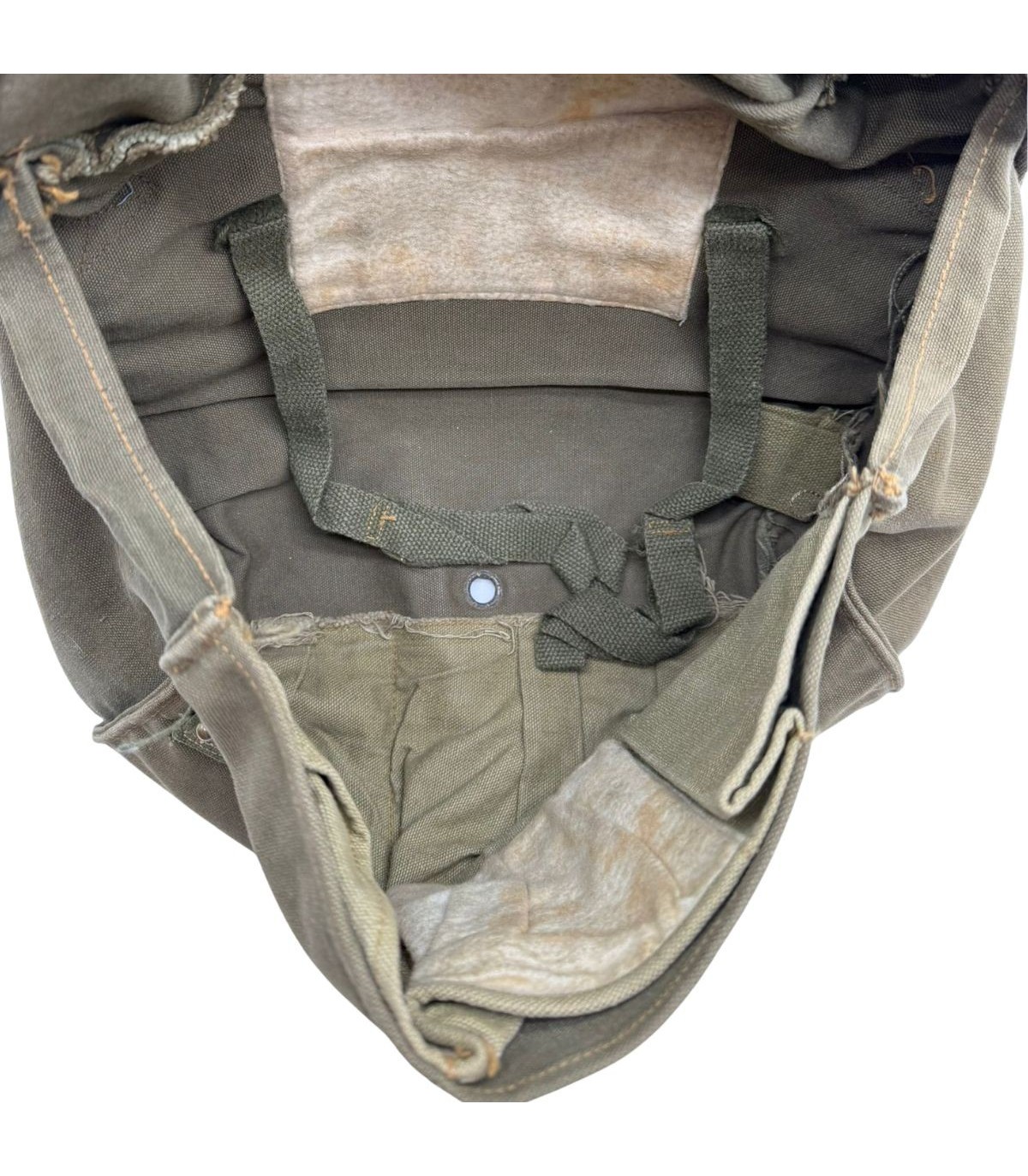 Sangle de transport : Comme c'est très souvent le cas sur les pièces ayant servi, la sangle du bas est coupée. Cette modification était fréquente chez les soldats pour éviter que le sac ne ballotte ou suite à une usure prononcée en opération.