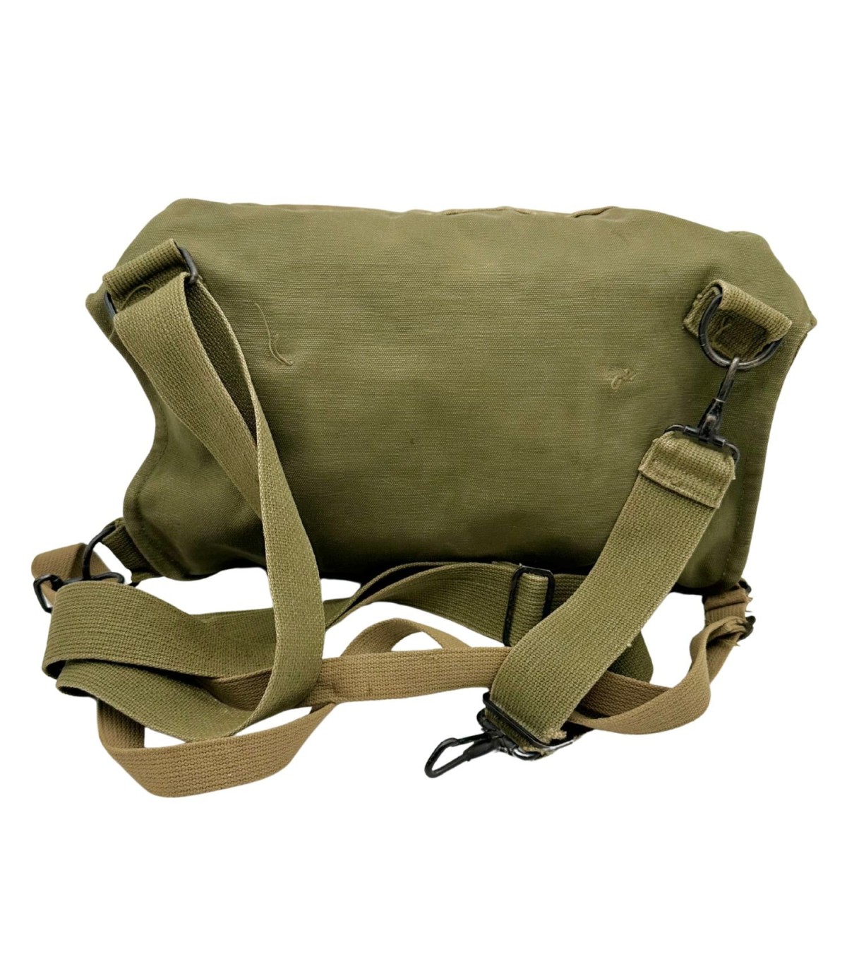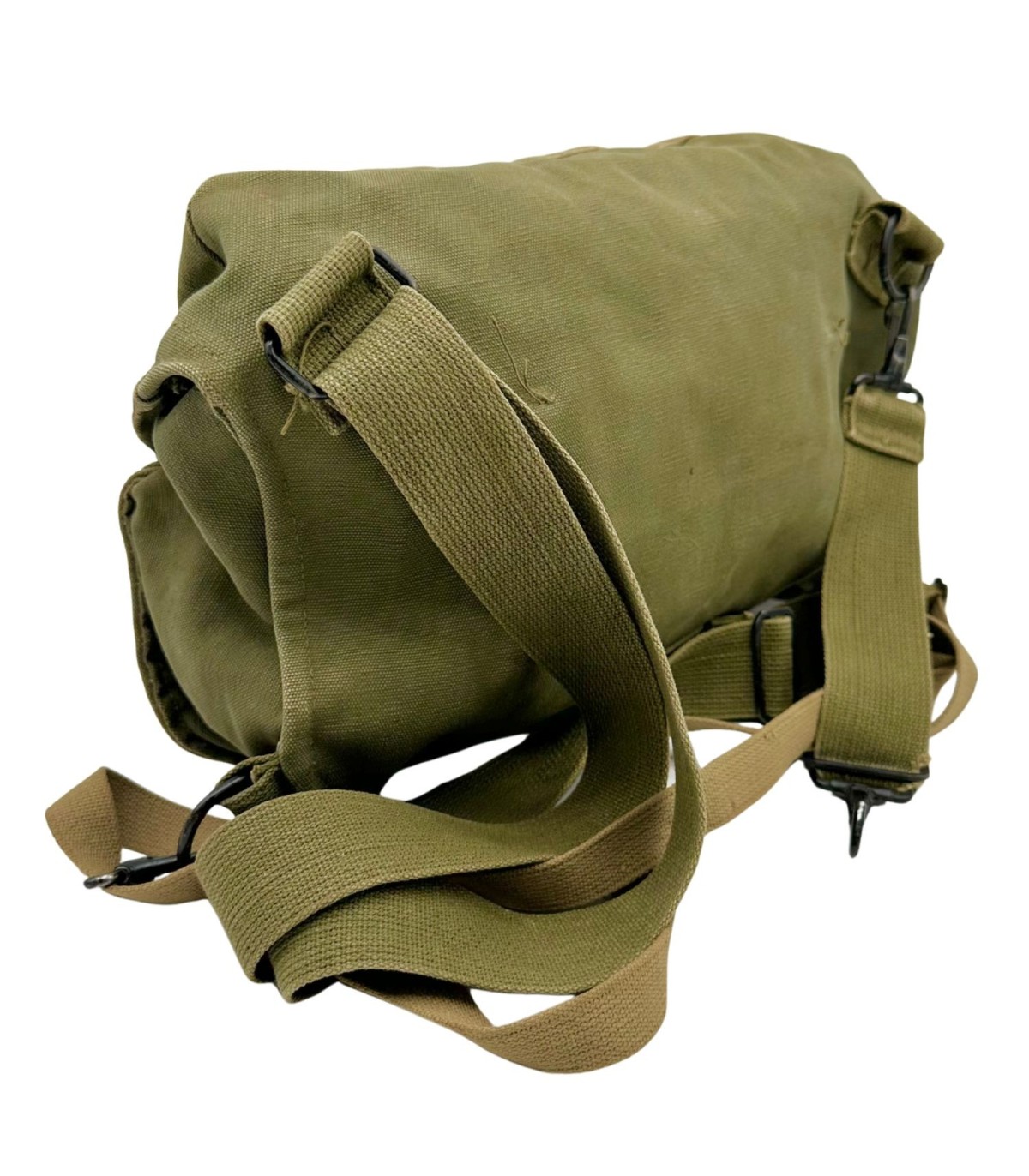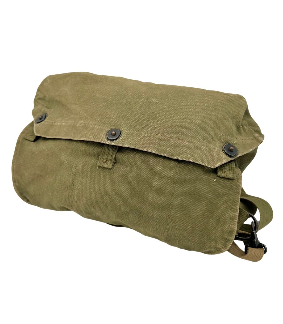 La musette M6 a été introduite pendant la Seconde Guerre Mondiale pour répondre aux besoins des soldats américains en termes de protection contre les attaques chimiques. Elle était utilisée pour transporter et protéger les masques à gaz, essentiels pour la survie en cas d'attaque. La conception robuste et pratique de cette musette en a fait un équipement indispensable pour les soldats en mission. Chaque musette raconte une histoire unique, ayant probablement accompagné un soldat à travers les rigueurs des combats en Europe ou dans le Pacifique.