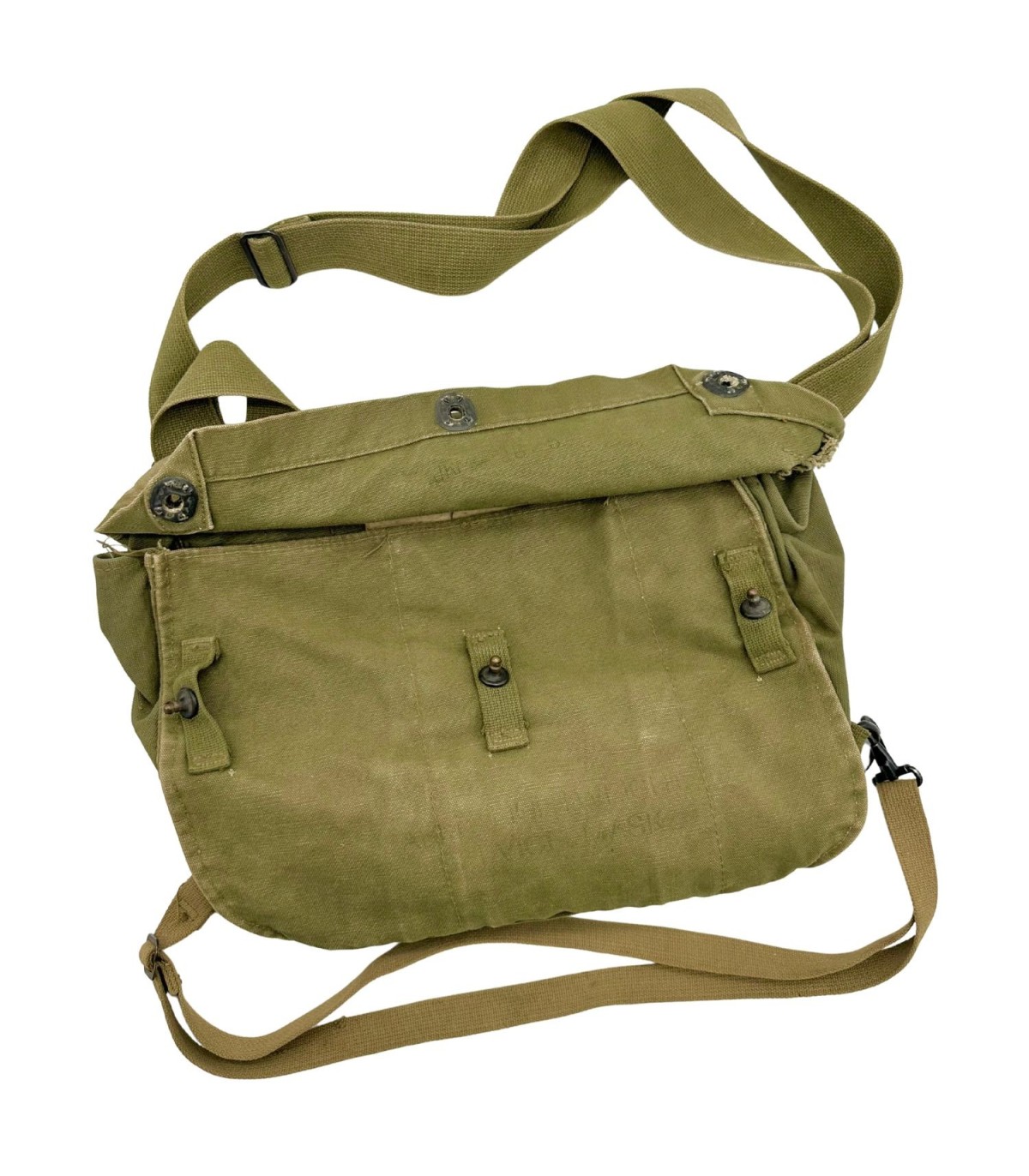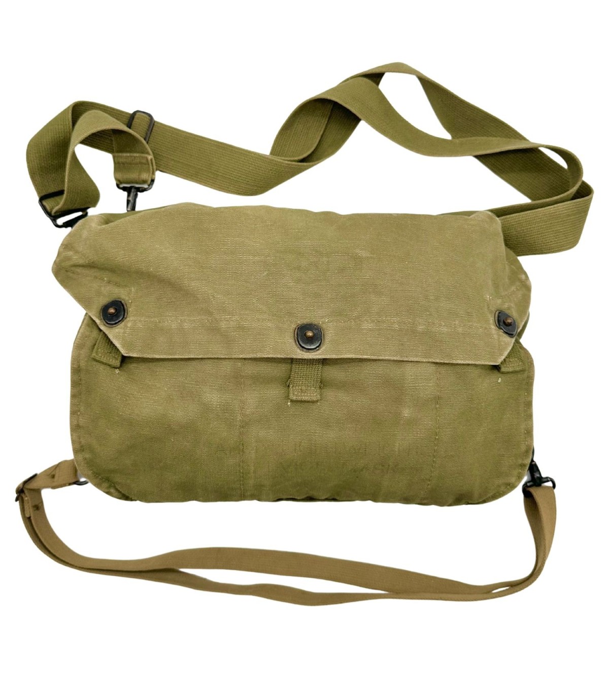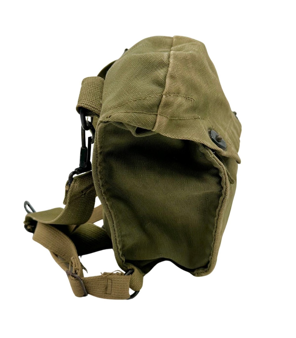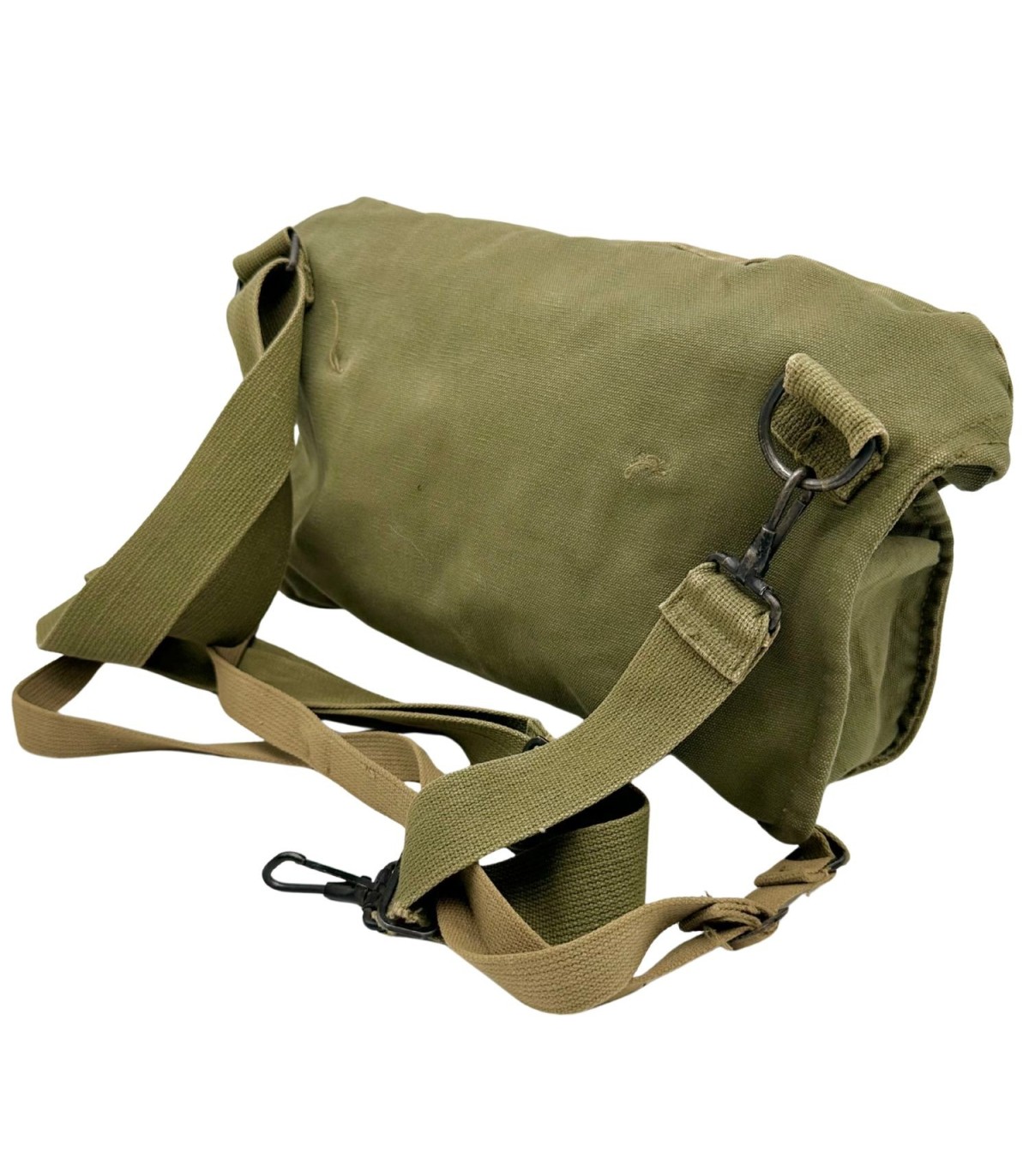 La musette M6 a été introduite pendant la Seconde Guerre Mondiale pour répondre aux besoins des soldats américains en termes de protection contre les attaques chimiques. Elle était utilisée pour transporter et protéger les masques à gaz, essentiels pour la survie en cas d'attaque. La conception robuste et pratique de cette musette en a fait un équipement indispensable pour les soldats en mission. Chaque musette raconte une histoire unique, ayant probablement accompagné un soldat à travers les rigueurs des combats en Europe ou dans le Pacifique.