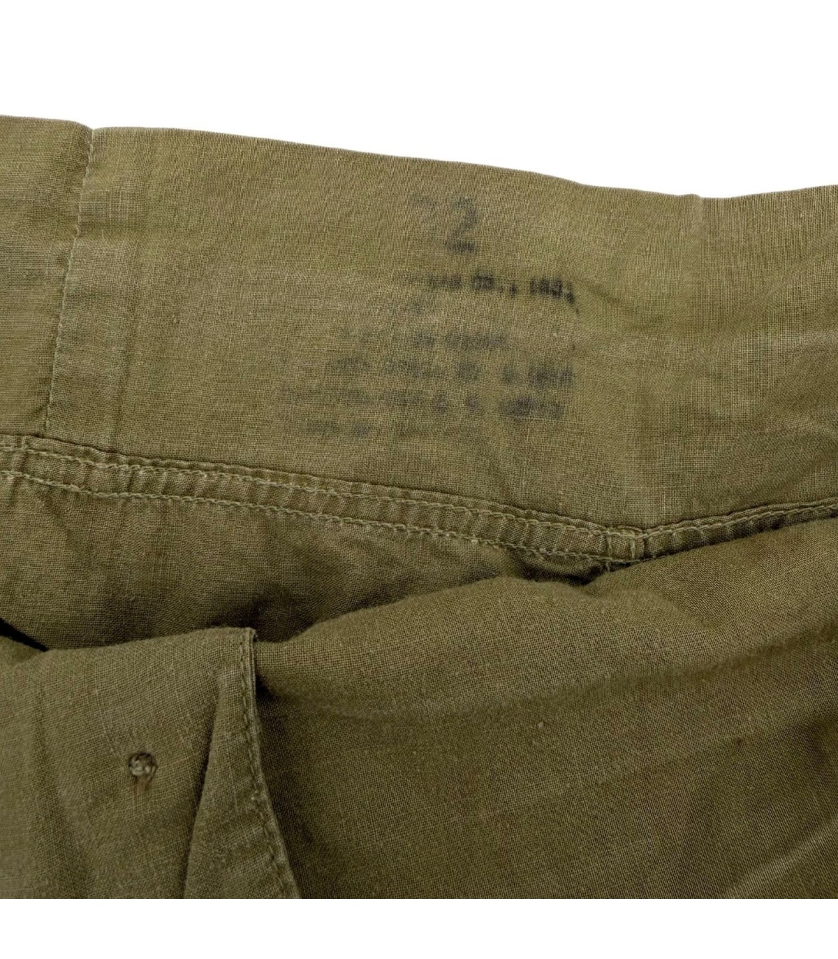 Fabriqué dans un tissu 100 % coton, robuste mais confortable, il était conçu pour supporter les conditions extrêmes du terrain tout en garantissant un confort optimal sous la tenue de combat. Le modèle se distingue par sa teinte OD (Olive Drab) typique de l’armée américaine, et par sa coupe courte fonctionnelle, facilitant les mouvements et le port sous les pantalons M-41 ou M-43.