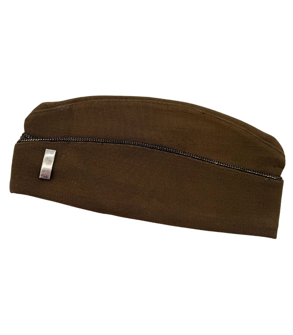 Ce calot d'officier (Garrison Cap) est confectionné dans le célèbre drap de laine de couleur Dark Olive Drab (OD51), plus connu sous le nom de "Chocolat" en raison de sa teinte brune profonde. Ce coloris était réservé aux officiers pour leur tenue de service hivernale, créant un contraste élégant avec le pantalon de couleur "Pink" (beige rosé). C'est la coiffure réglementaire par excellence pour les moments hors service, les permissions ou les postes d'état-major.