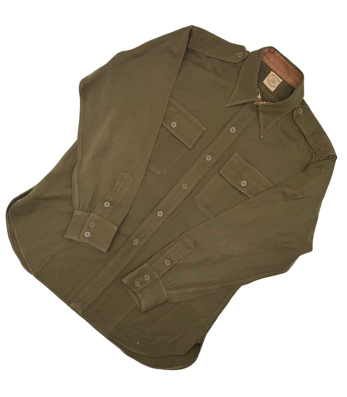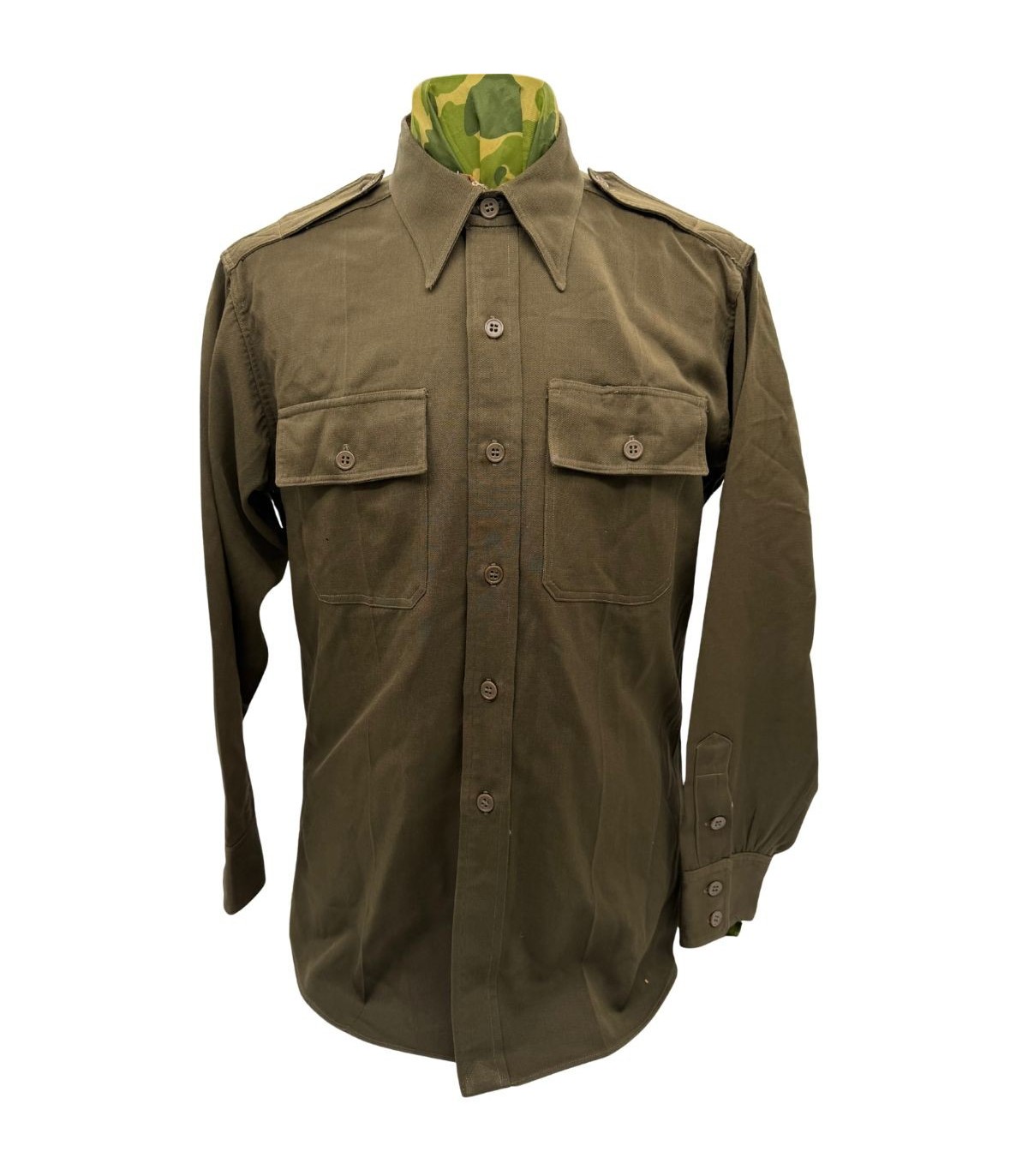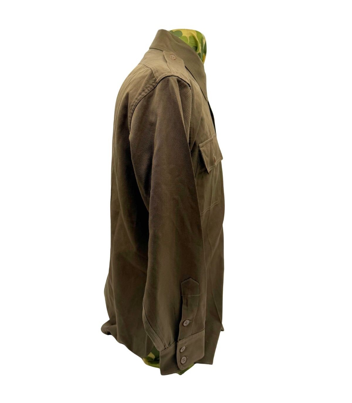 Cette chemise d'officier, reconnaissable à sa teinte brun foncé dite "chocolat" (Dark Shades OD-51), représente le haut de gamme de l'uniforme de sortie américain. Contrairement à la de la troupe, ce modèle est confectionné dans une gabardine de laine fine, offrant un tombé et une résistance exceptionnels.