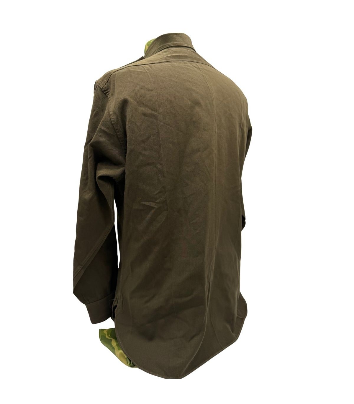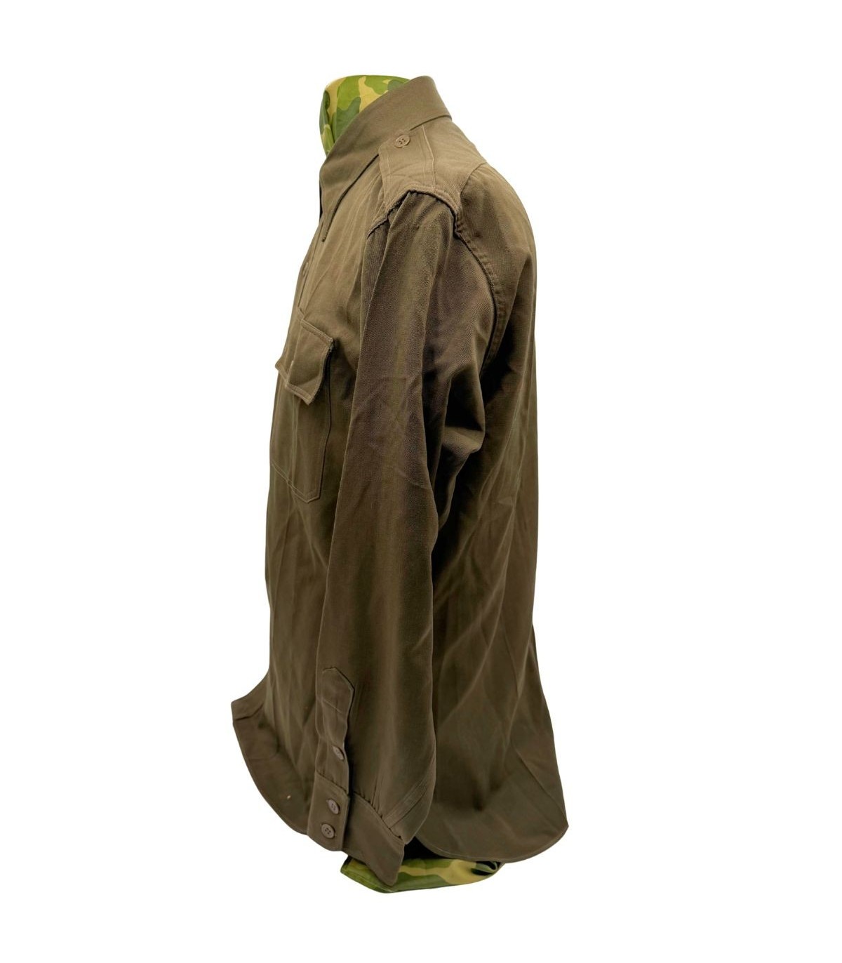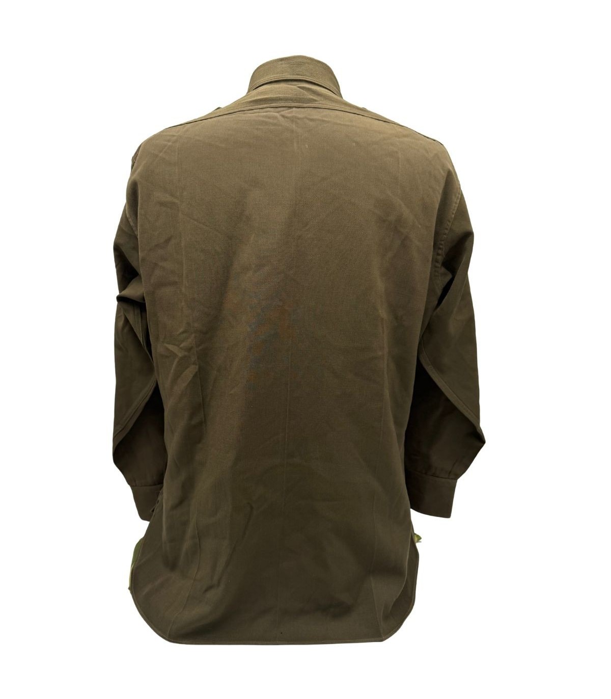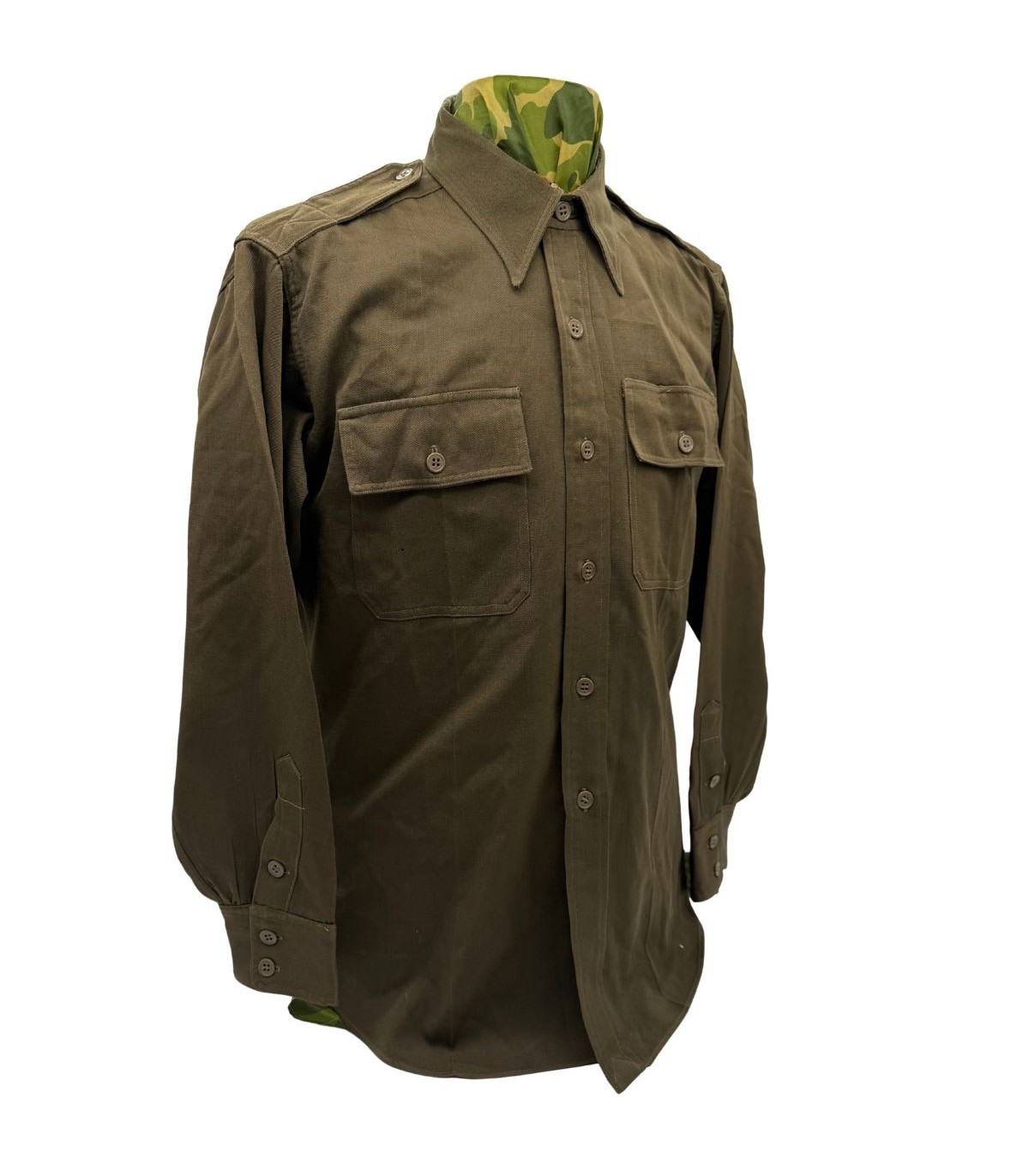 Cette chemise d'officier, reconnaissable à sa teinte brun foncé dite "chocolat" (Dark Shades OD-51), représente le haut de gamme de l'uniforme de sortie américain. Contrairement à la de la troupe, ce modèle est confectionné dans une gabardine de laine fine, offrant un tombé et une résistance exceptionnels.