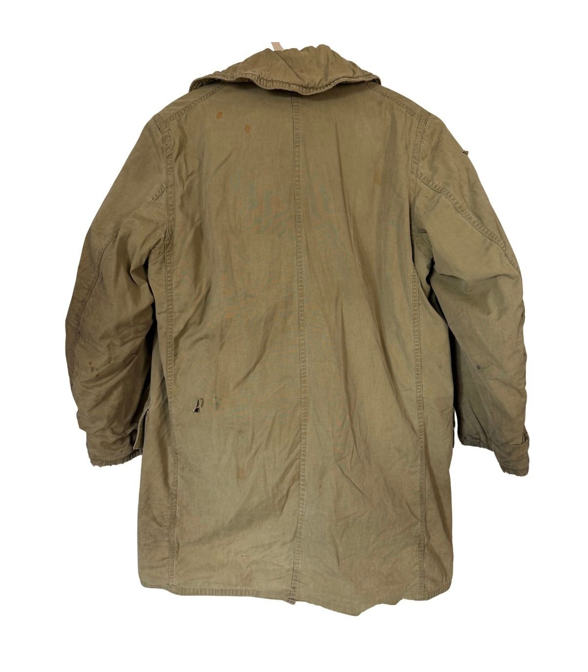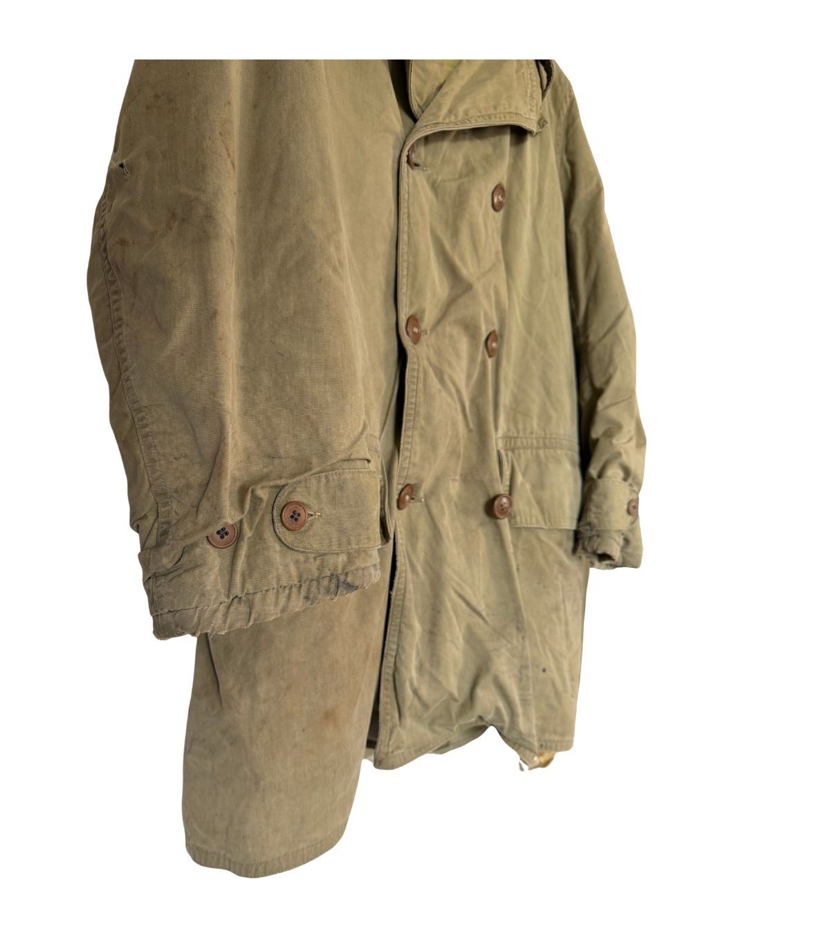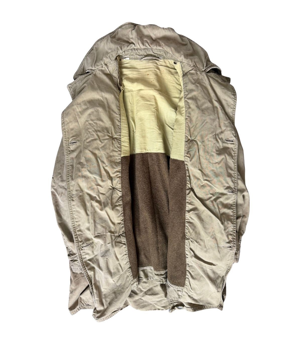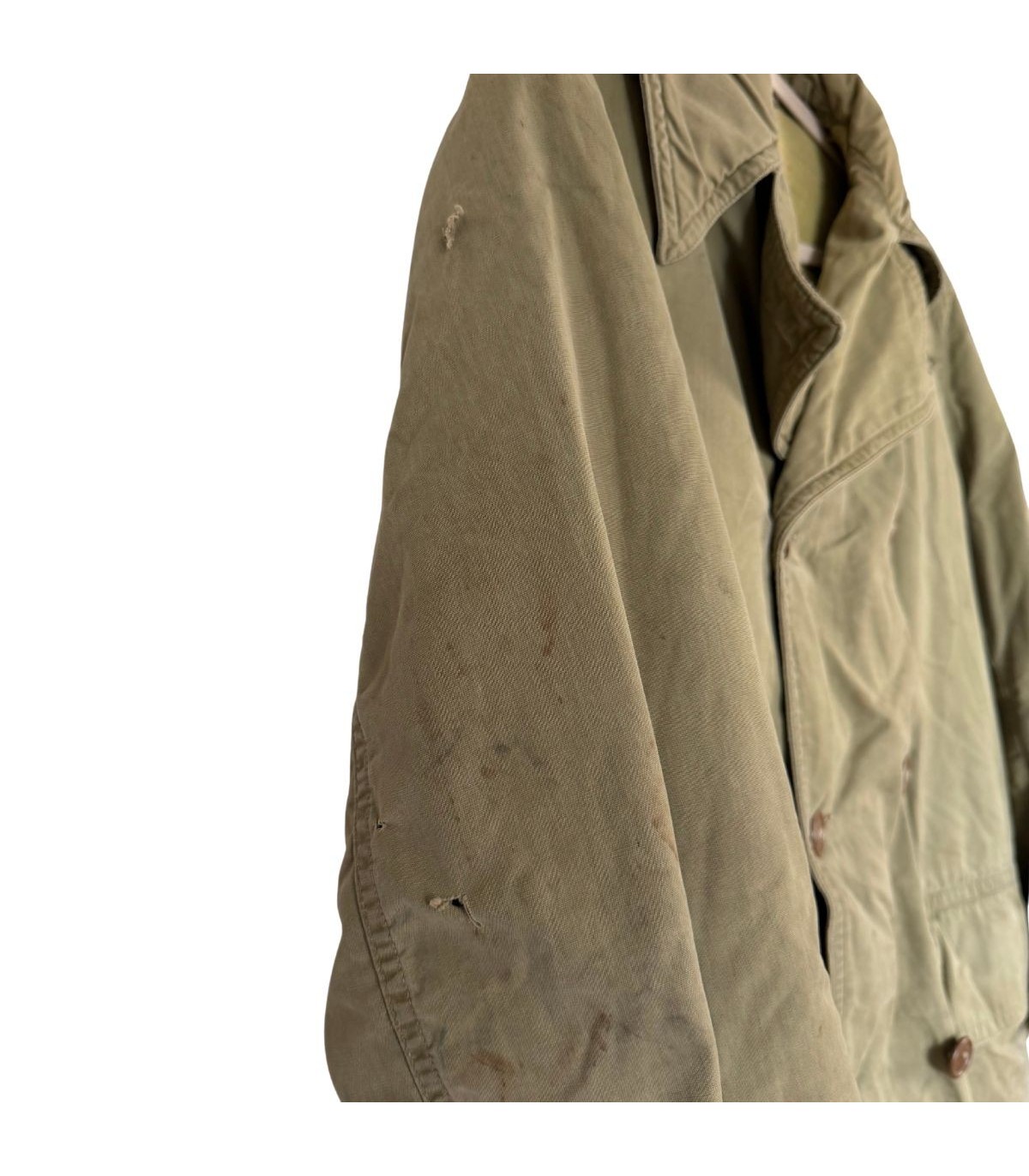 Patine de terrain : Présente des taches éparses et des usures au bas des manches. La doublure est abîmée à l'épaule, témoignant d'un usage réel.