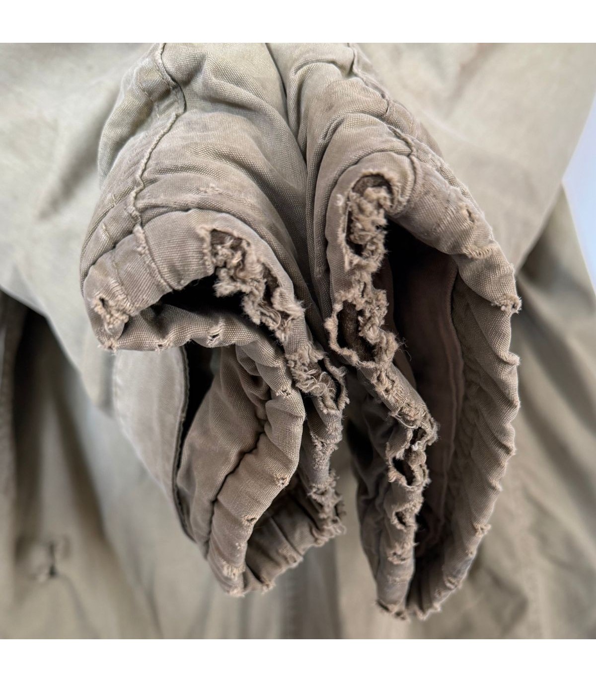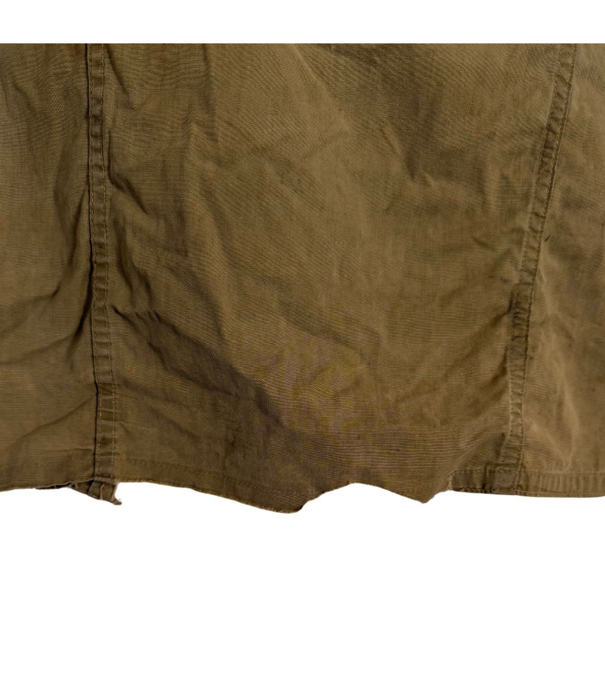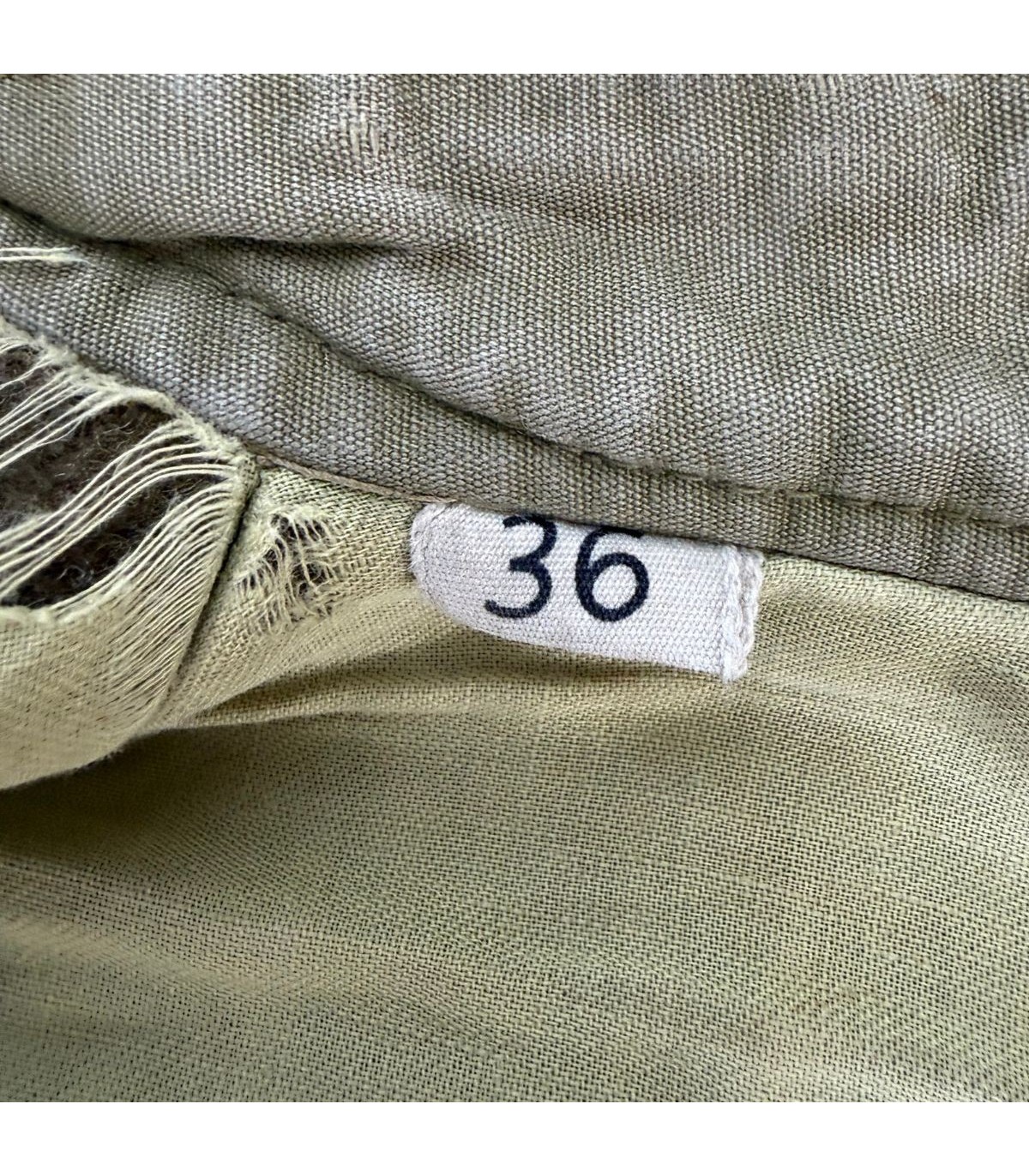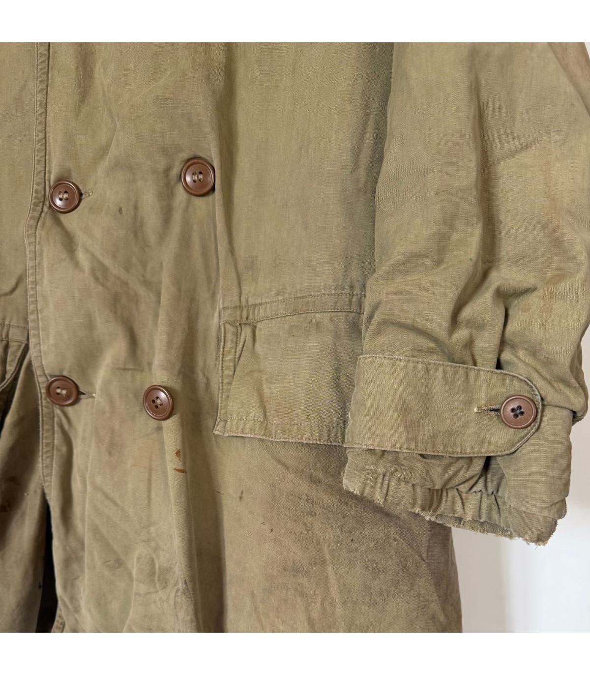 Patine de terrain : Présente des taches éparses et des usures au bas des manches. La doublure est abîmée à l'épaule, témoignant d'un usage réel.