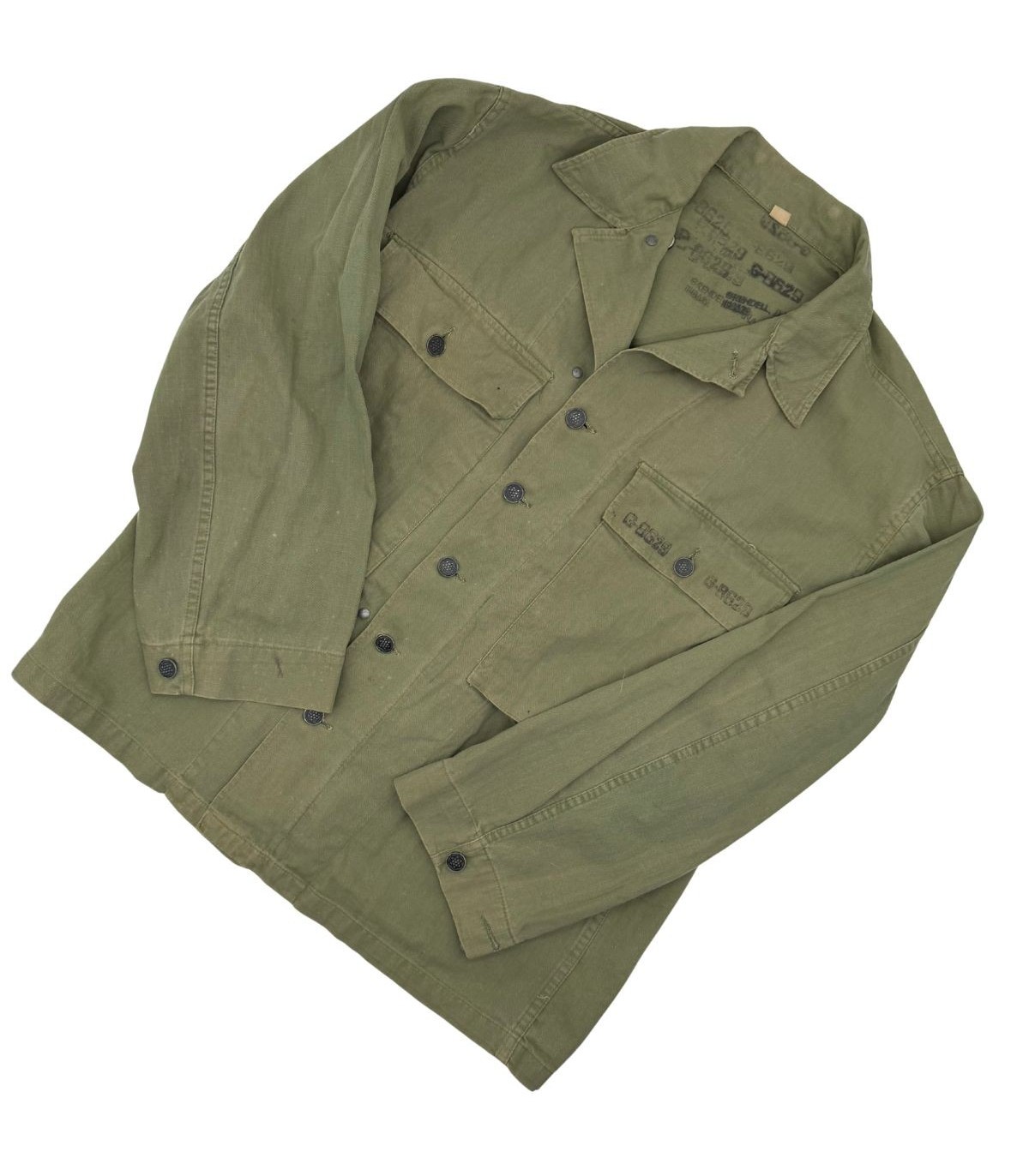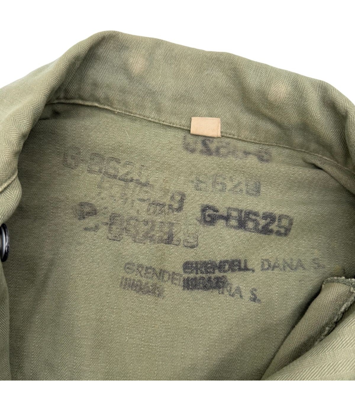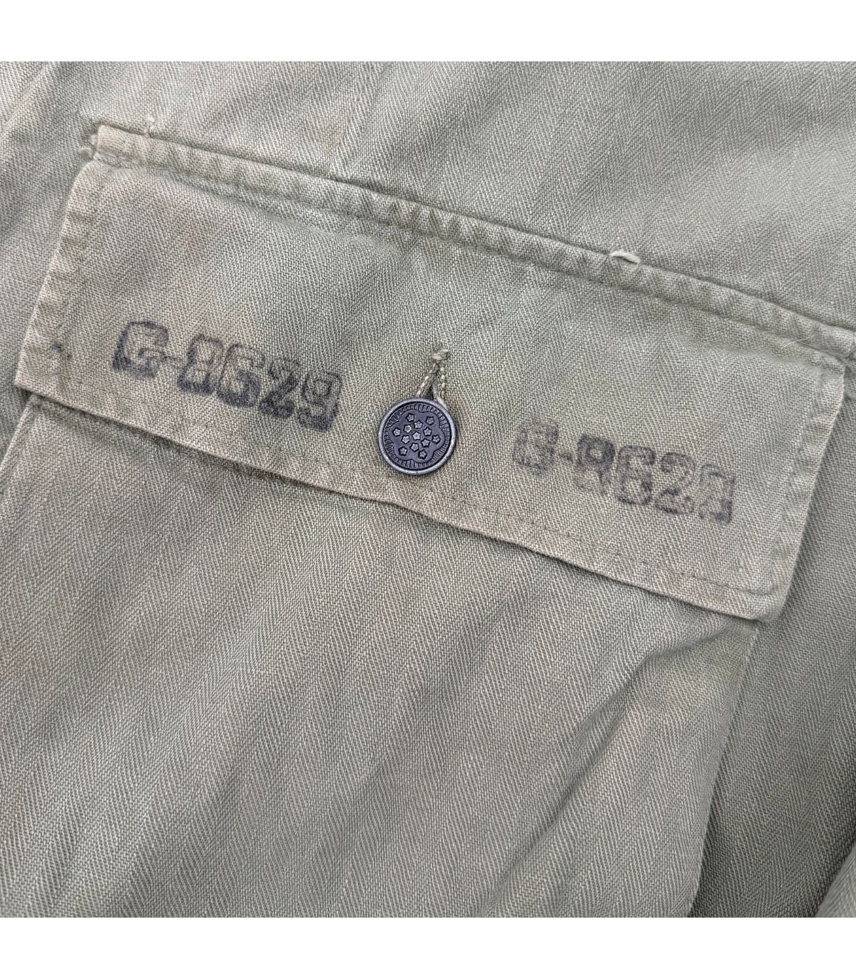 Cette veste en toile HBT (Herringbone Twill) n'est pas qu'un simple élément d'uniforme, c'est un témoin direct du parcours d'un homme. Elle comporte un Laundry Number G-8629 ainsi que le nom du soldat : Grendell, DANA S. Cette identification permet des recherches historiques poussées sur le parcours de ce militaire durant le conflit.