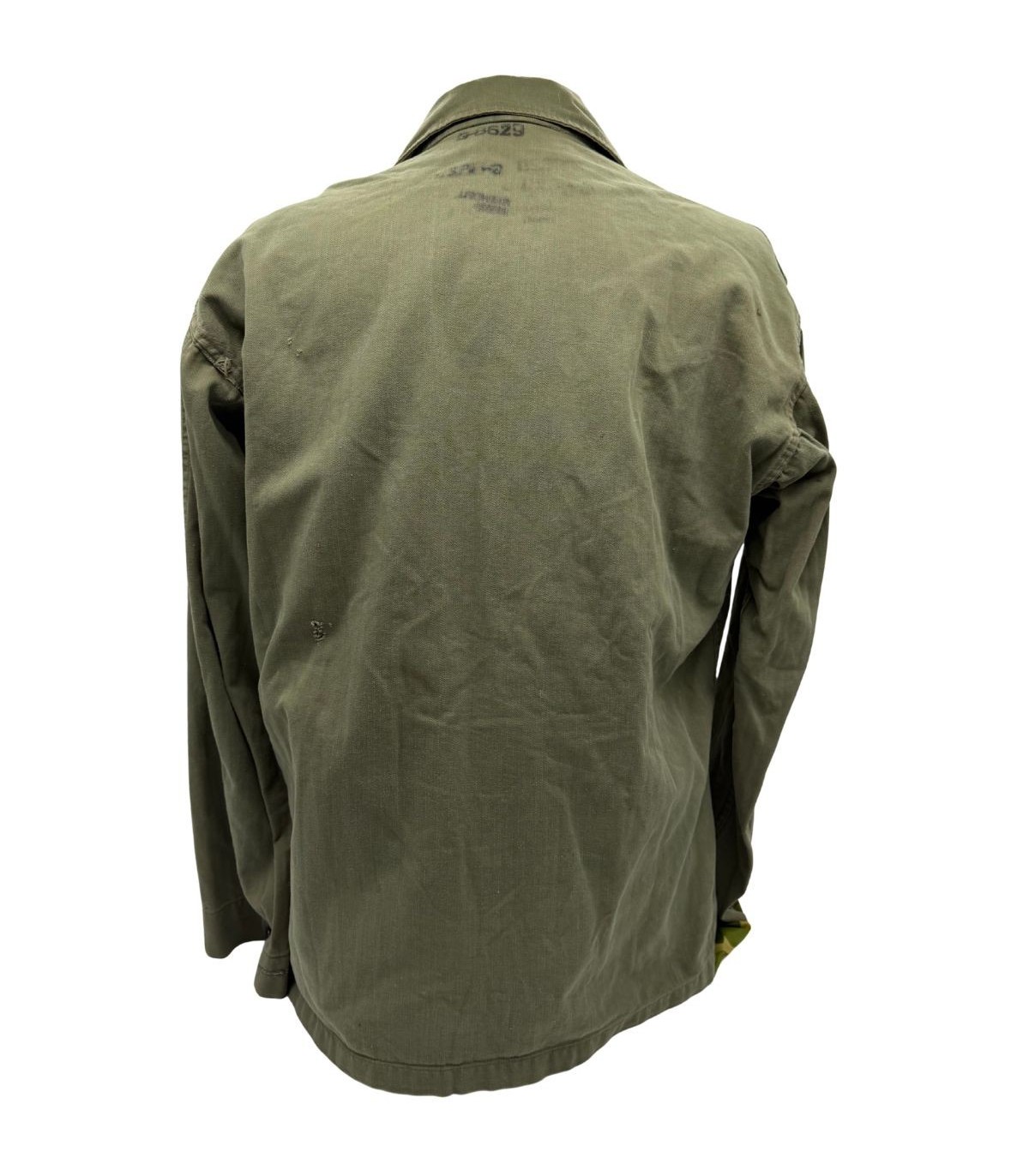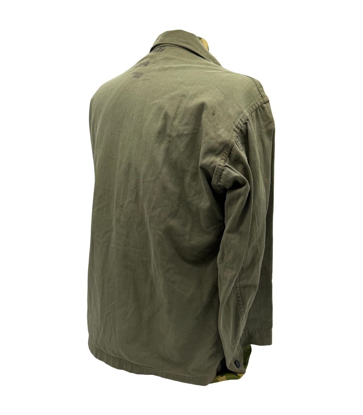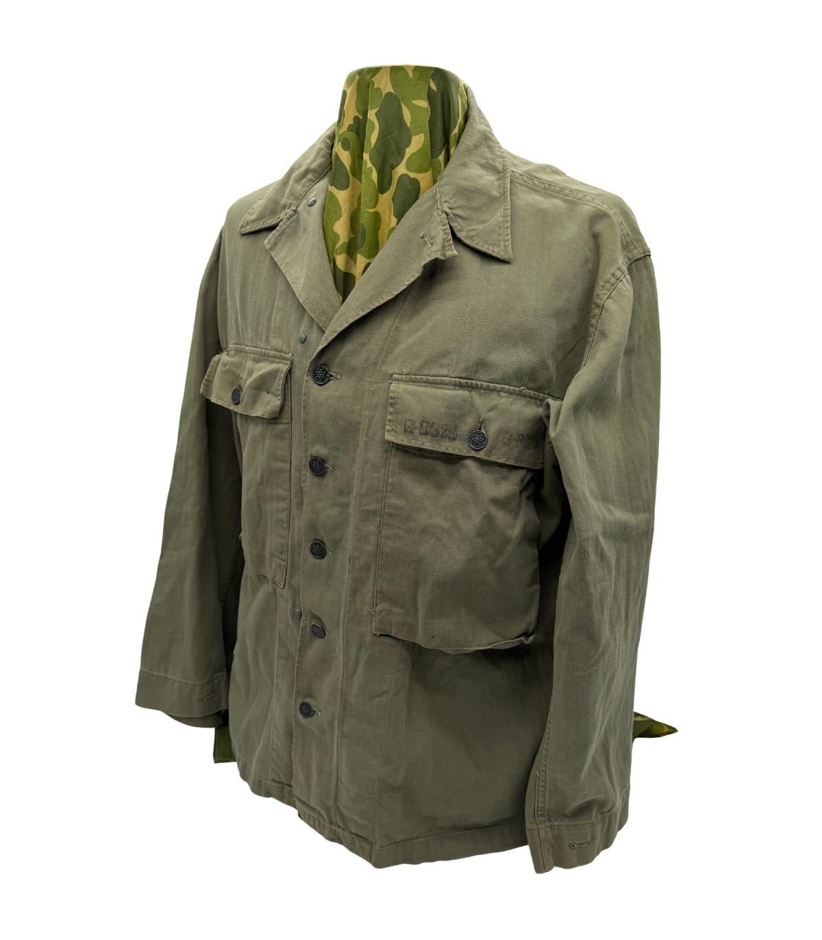 Cette veste en toile HBT (Herringbone Twill) n'est pas qu'un simple élément d'uniforme, c'est un témoin direct du parcours d'un homme. Elle comporte un Laundry Number G-8629 ainsi que le nom du soldat : Grendell, DANA S. Cette identification permet des recherches historiques poussées sur le parcours de ce militaire durant le conflit.