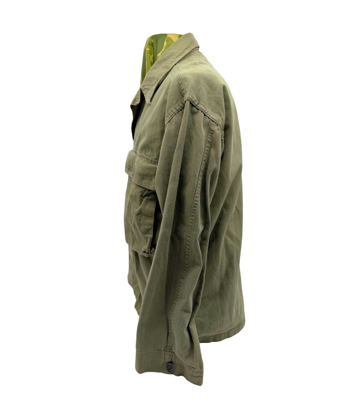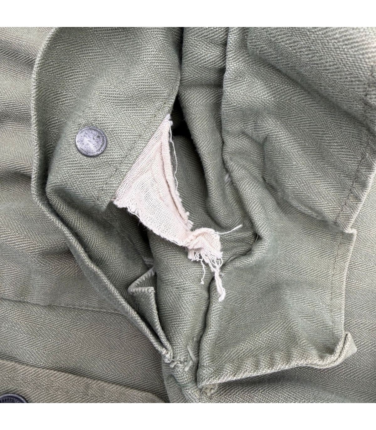 Patine de terrain : Présence d'un trou au dos et d'accrocs à l'épaule, illustrant un usage intensif. Tous les boutons sont d'origine.