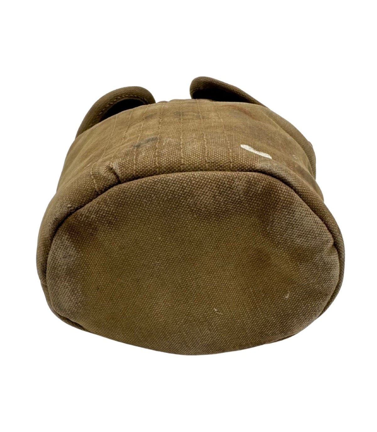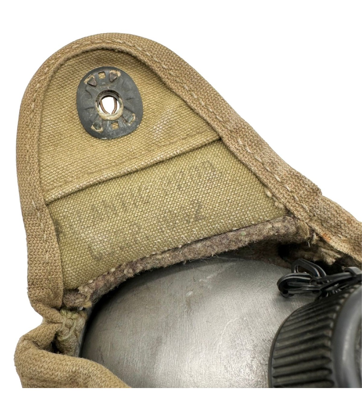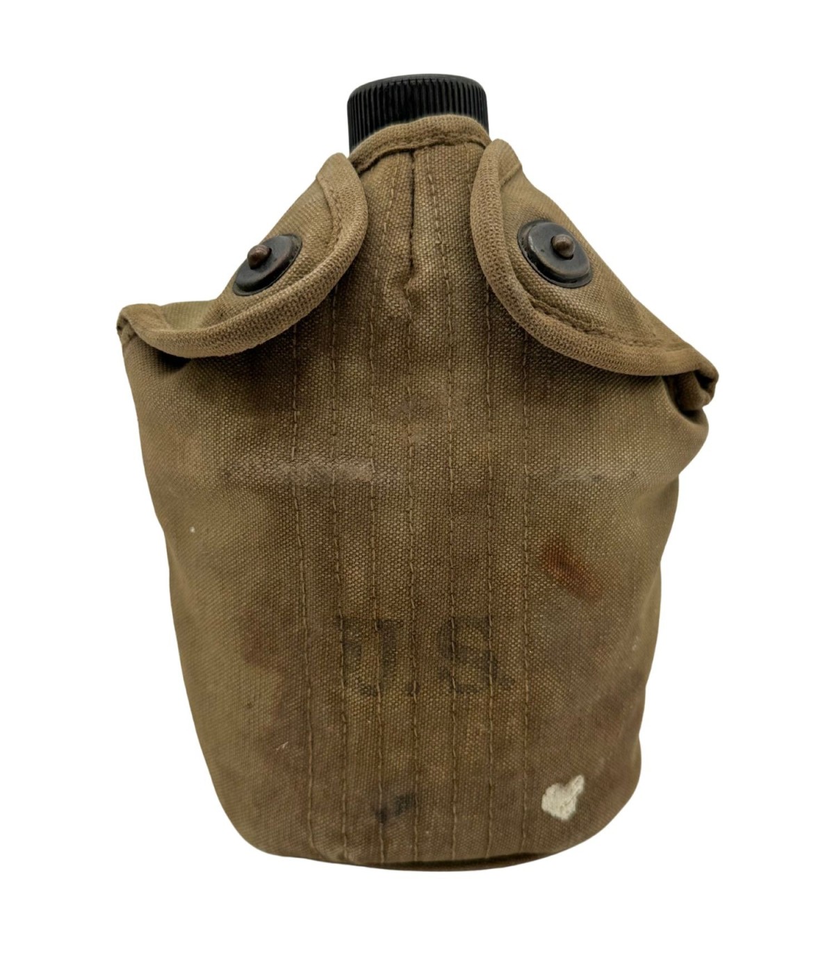 Cet ensemble est 100 % authentique et illustre l'histoire vécue par le matériel. La Housse en toile M-1910 ou M-1942 est fabriquée par ATLANTIC PROD CORP et est datée de 1942. Elle est la pièce la plus ancienne, datant des débuts de l'entrée en guerre américaine. Le Bidon métallique qu'elle contient est marqué S.M Co et est également daté de 1942, formant un matching set cohérent pour ces deux éléments de base.