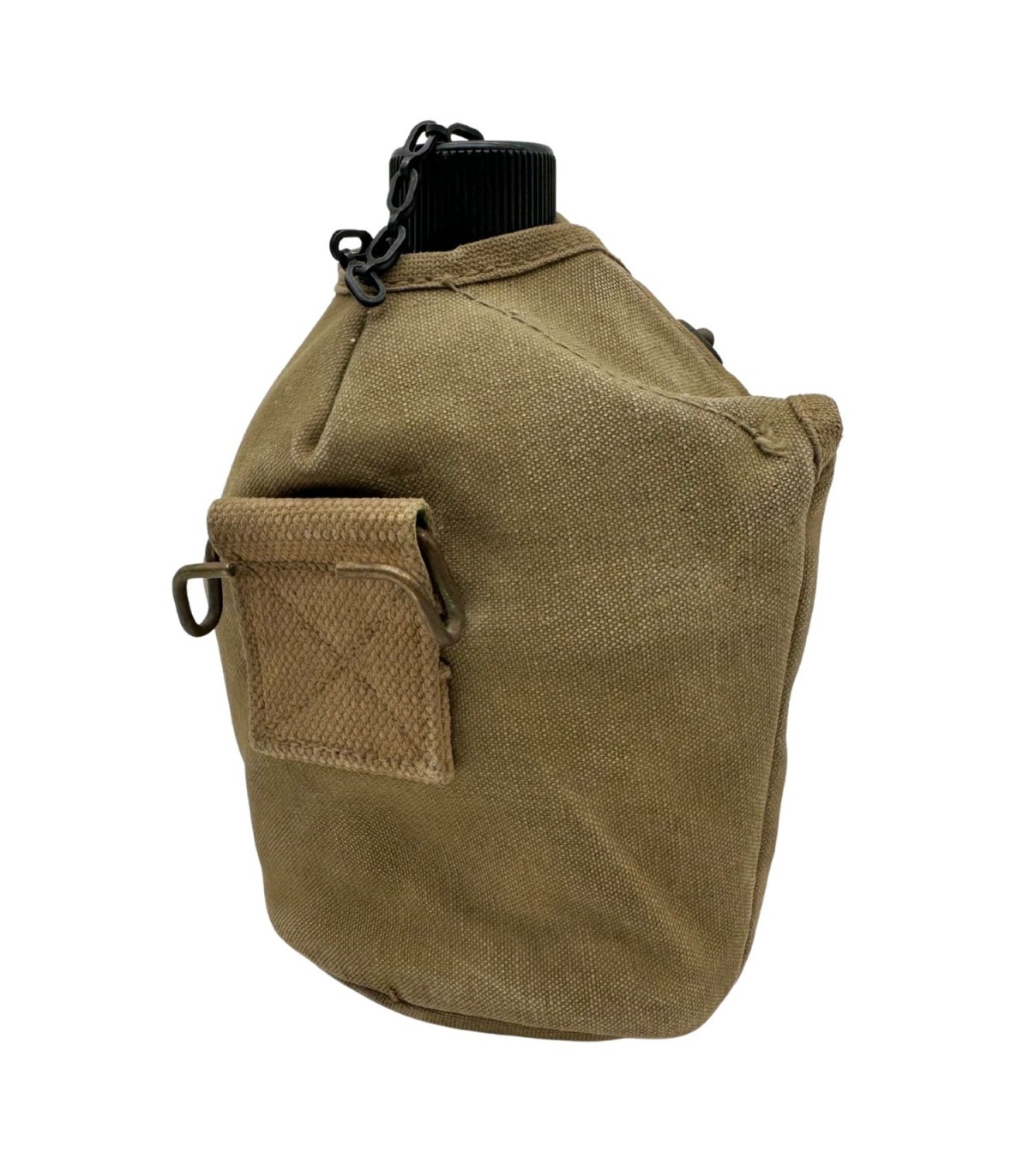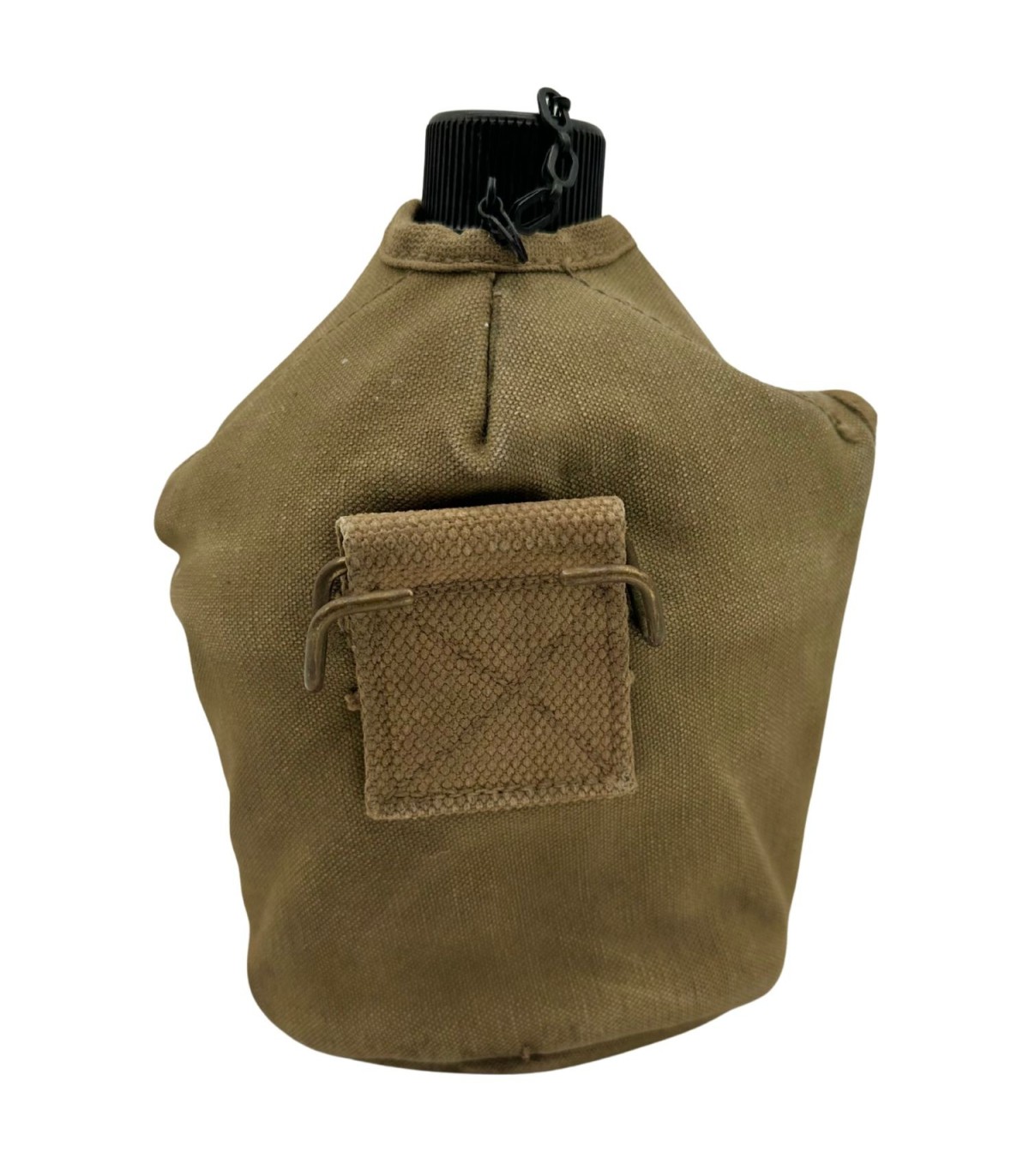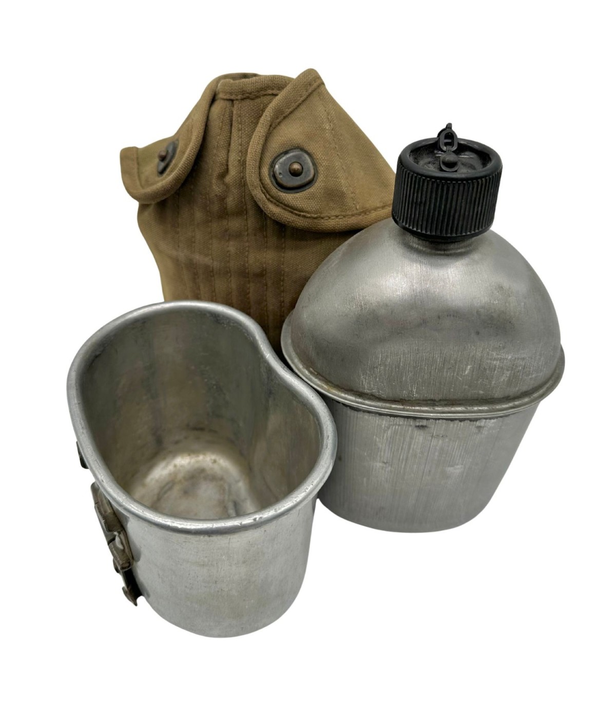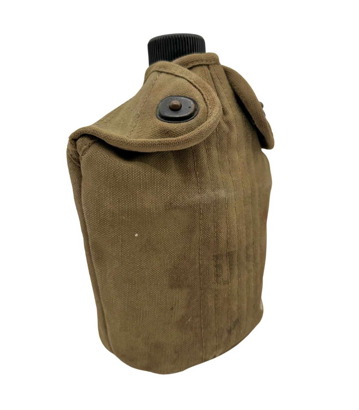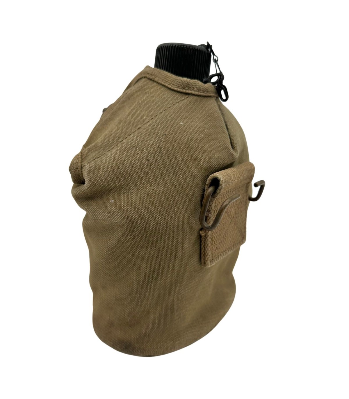 Le mélange des dates reflète le réalignement historique du matériel, avec un bidon d’origine complété par un quart de fabrication tardive. La housse en toile robuste Olive Drab assure protection et portage efficace.