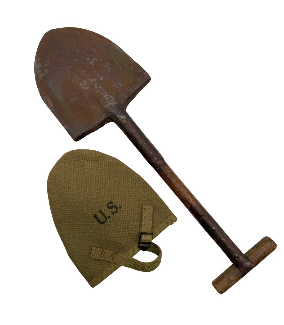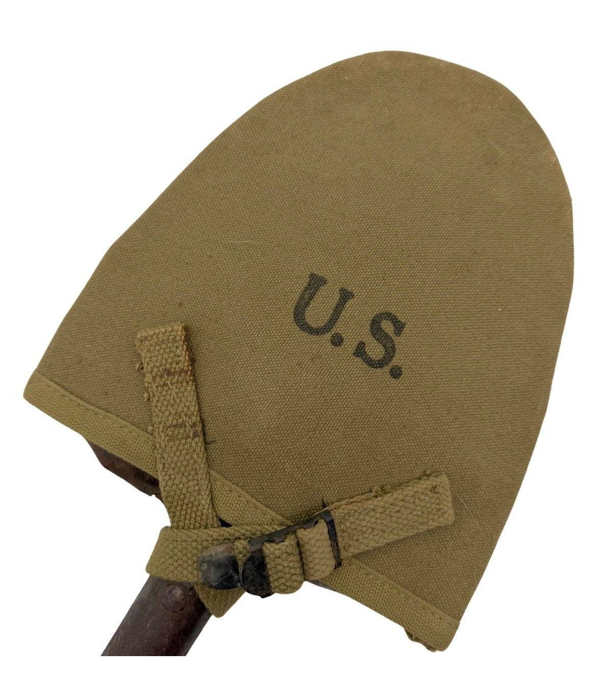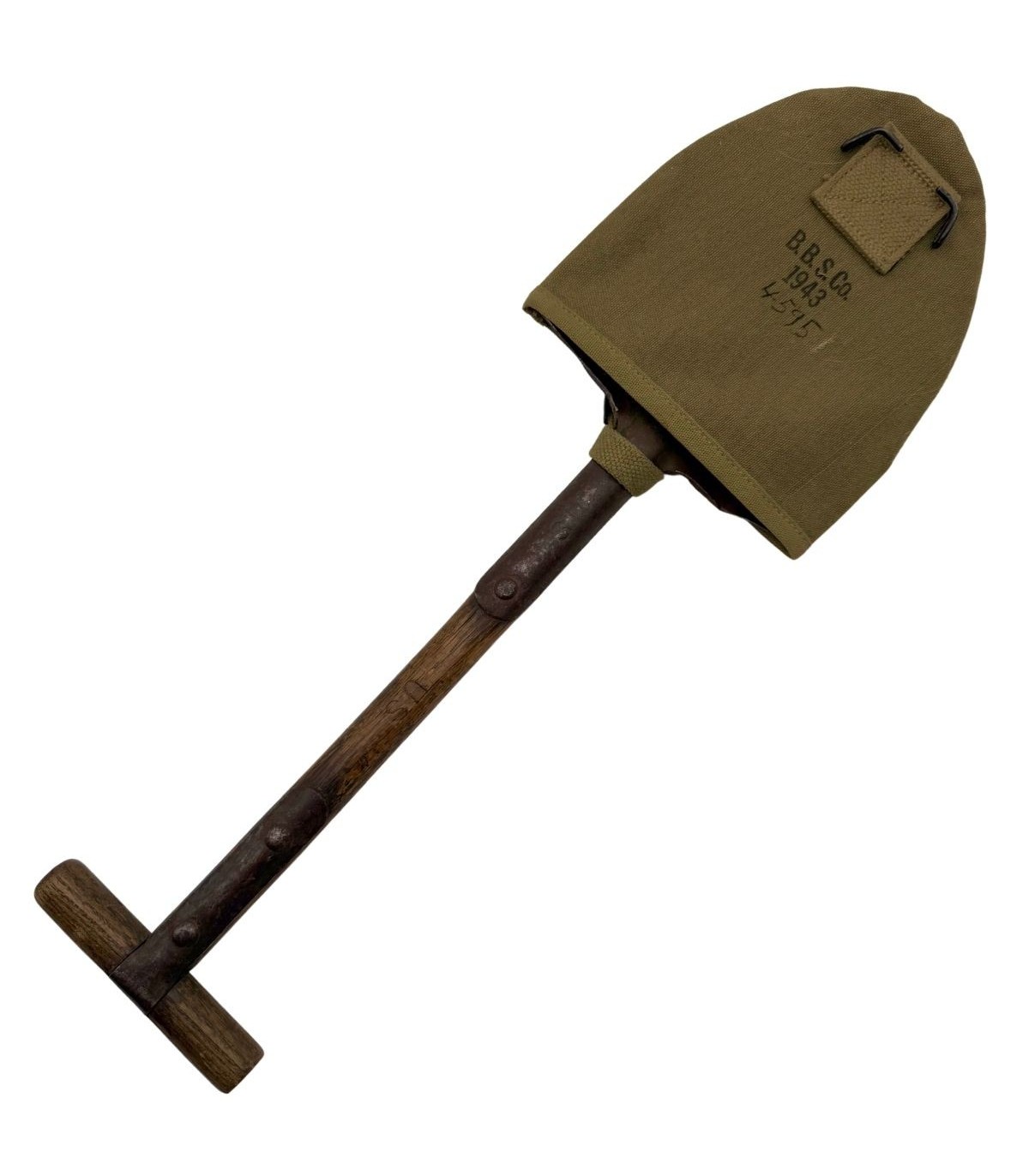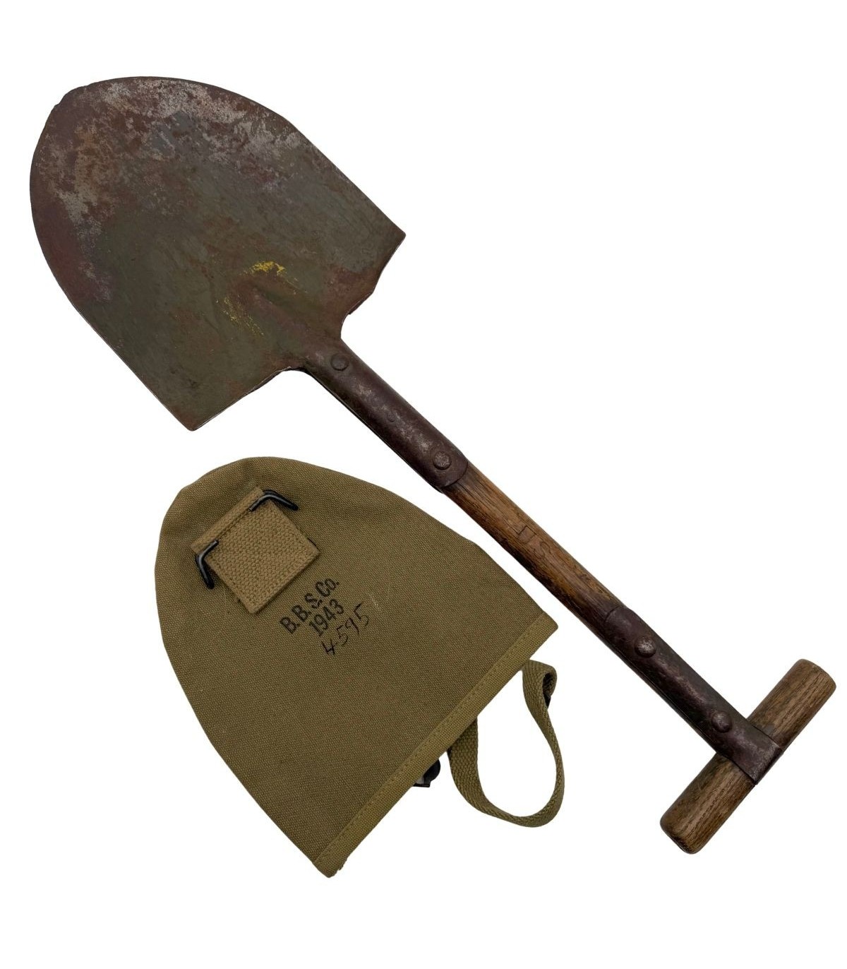 Ensemble authentique Seconde Guerre Mondiale composé de la pelle M-1910 à manche en T (modèle non-pliant) et de sa housse en toile réglementaire fabriquée par B.B.S Co., datée 1943.