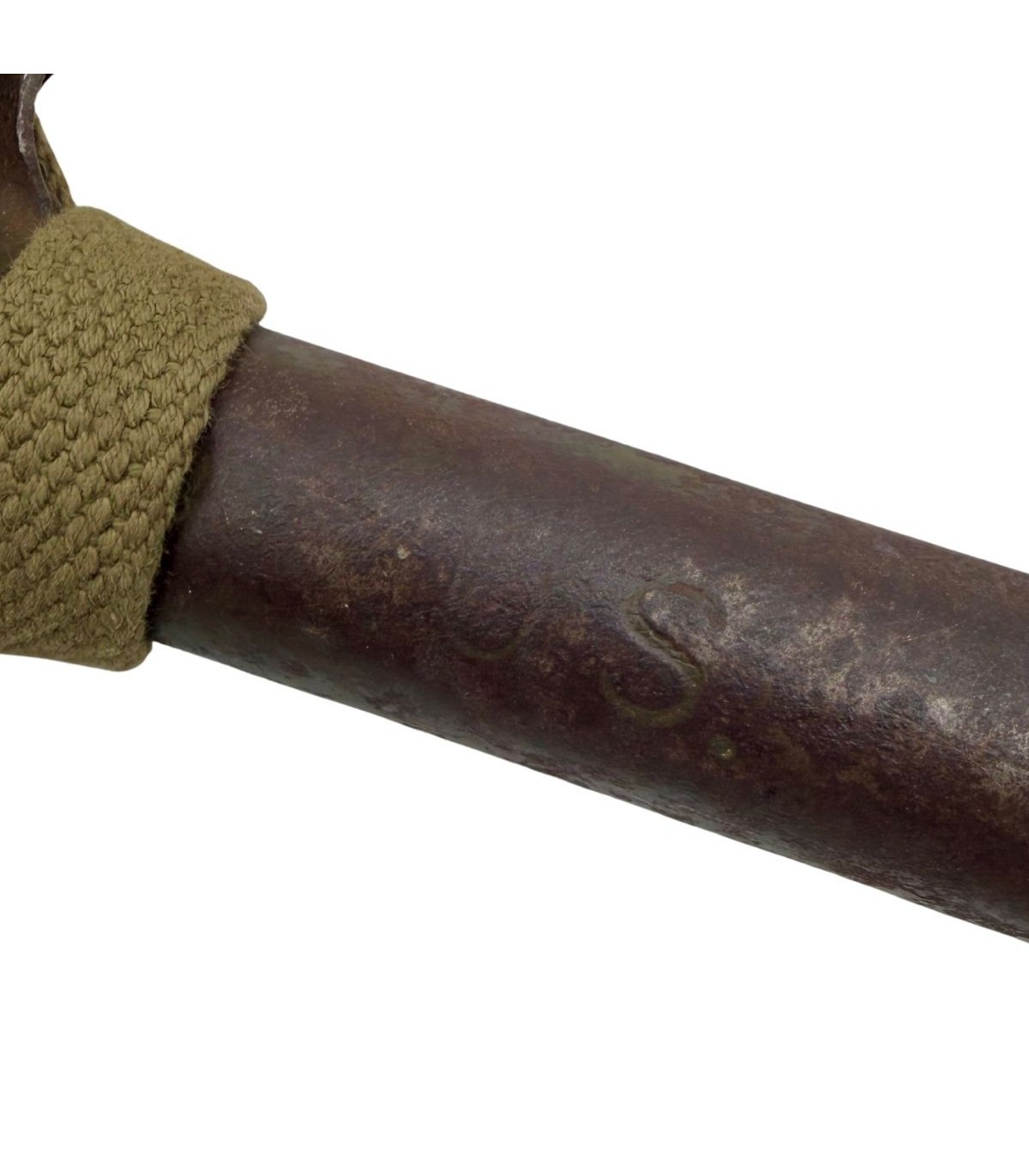 La pelle M-1910, encore largement utilisée au début du conflit, constitue l’outil classique du fantassin pour l’aménagement rapide de positions. La housse en toile Olive Drab, parfaitement adaptée à la tête de la pelle, confirme une production en pleine transition vers les modèles pliants M-1943.