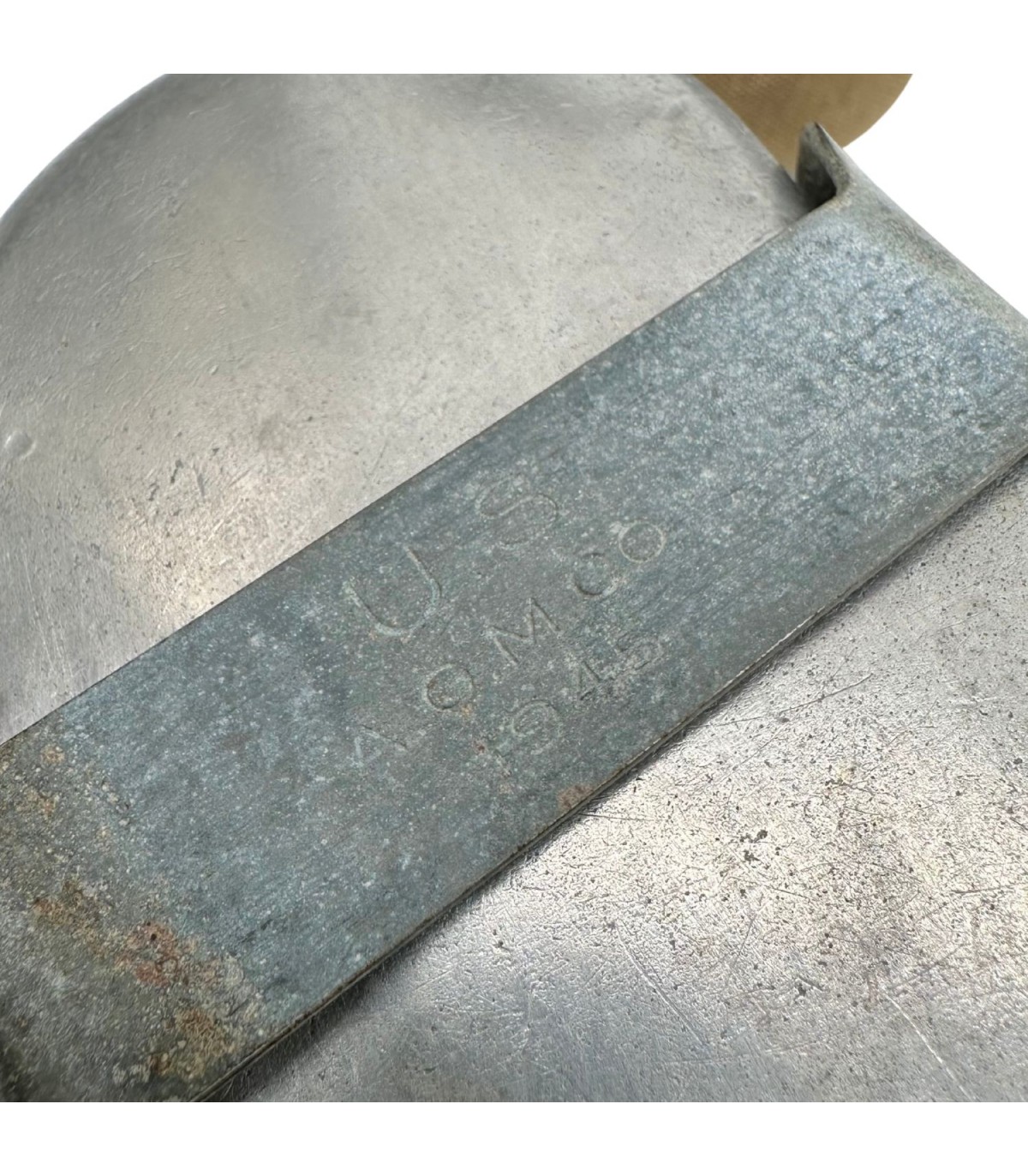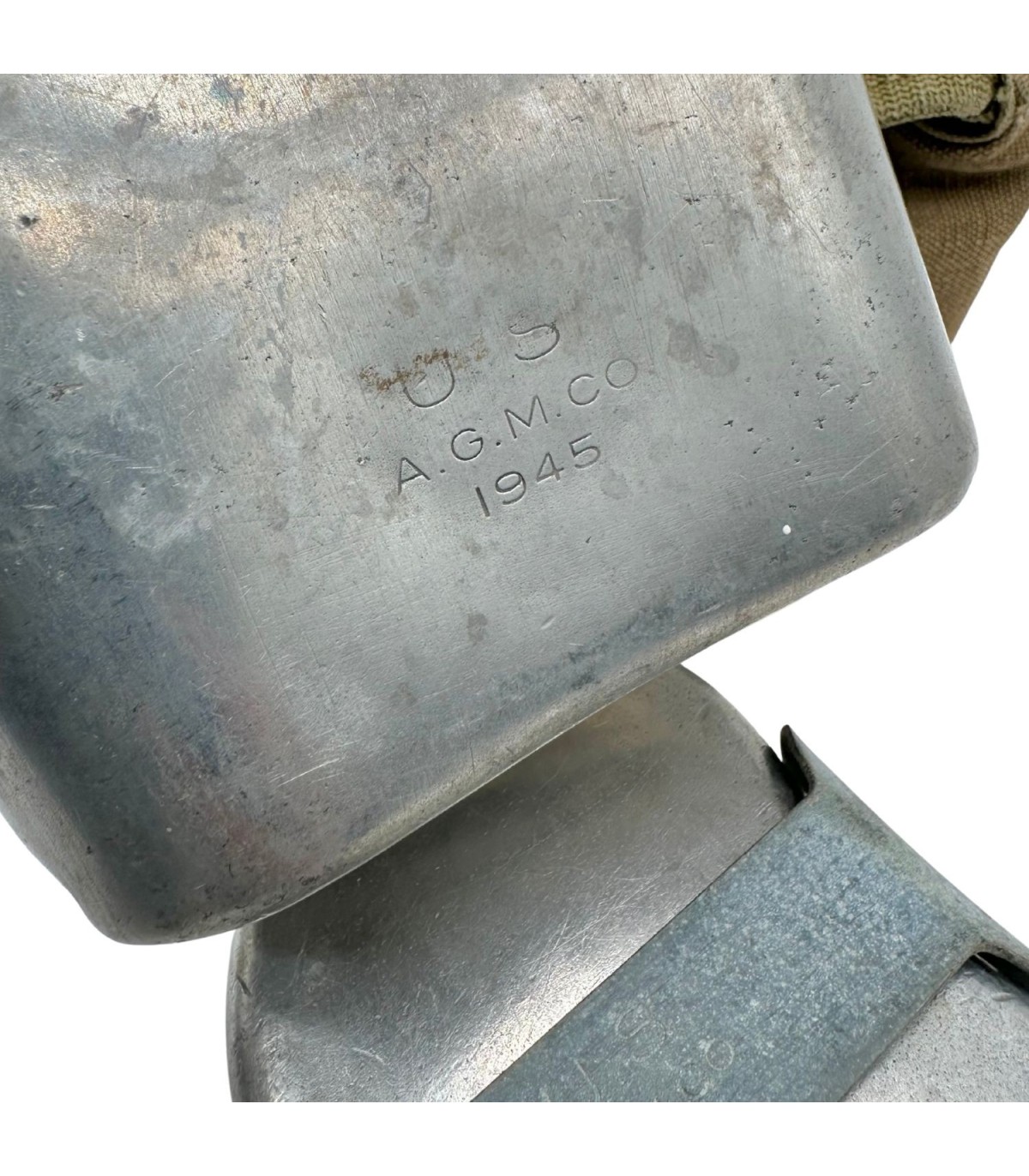Cet ensemble complet est composé de la housse, du bidon et du quart. Le point fort réside dans les éléments métalliques, qui sont un ensemble assorti (Bidon et Quart) du même fabricant : A.G.M CO (Aluminum Goods Manufacturing Company) et sont tous deux datés de 1945. Cette datation les place directement dans la production de la fin de la Seconde Guerre Mondiale, une période où la qualité de fabrication restait élevée.