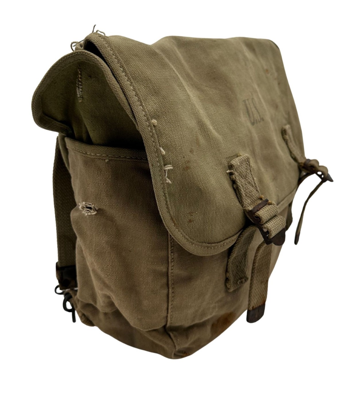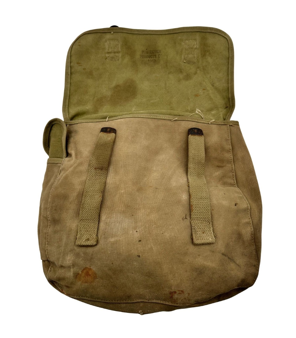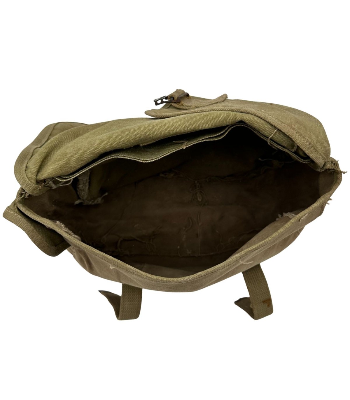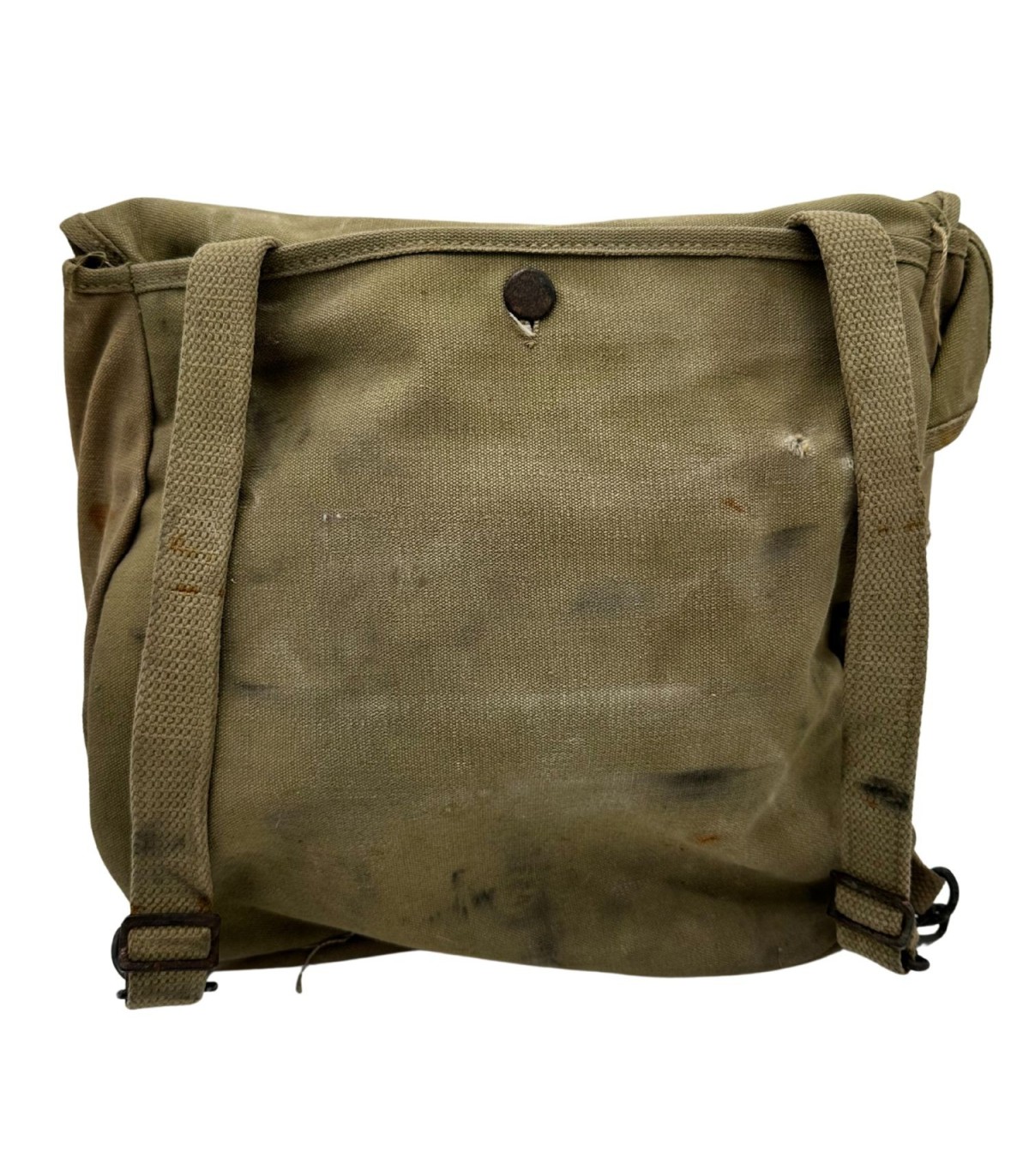 La date de 1942 est particulièrement significative, car elle place cette musette au début de l'entrée en guerre américaine, au moment de la production massive et des premiers déploiements en Afrique du Nord et dans le Pacifique. La Musette M-1936 est reconnaissable à son rabat principal fermé par des boutons-pression, ses pochettes intérieures et ses crochets de fixation métalliques.