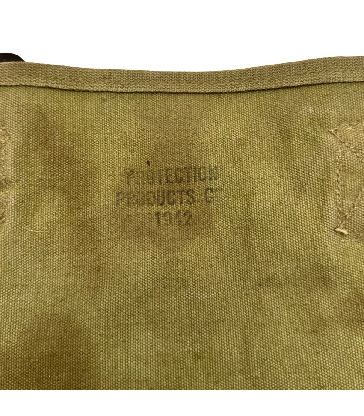 Cet exemplaire est un article 100 % authentique de la Seconde Guerre Mondiale. Il est fabriqué en toile de coton robuste (Canvas) dans la teinte Olive Drab (OD). Son marquage est très clair : il est fabriqué par PROTECTION PRODUCTS CO et est daté de 1942.