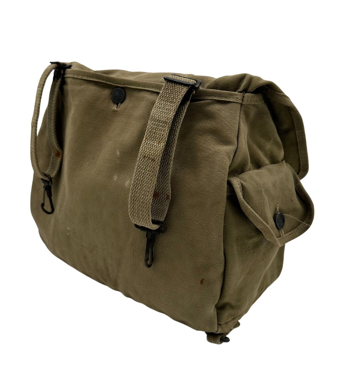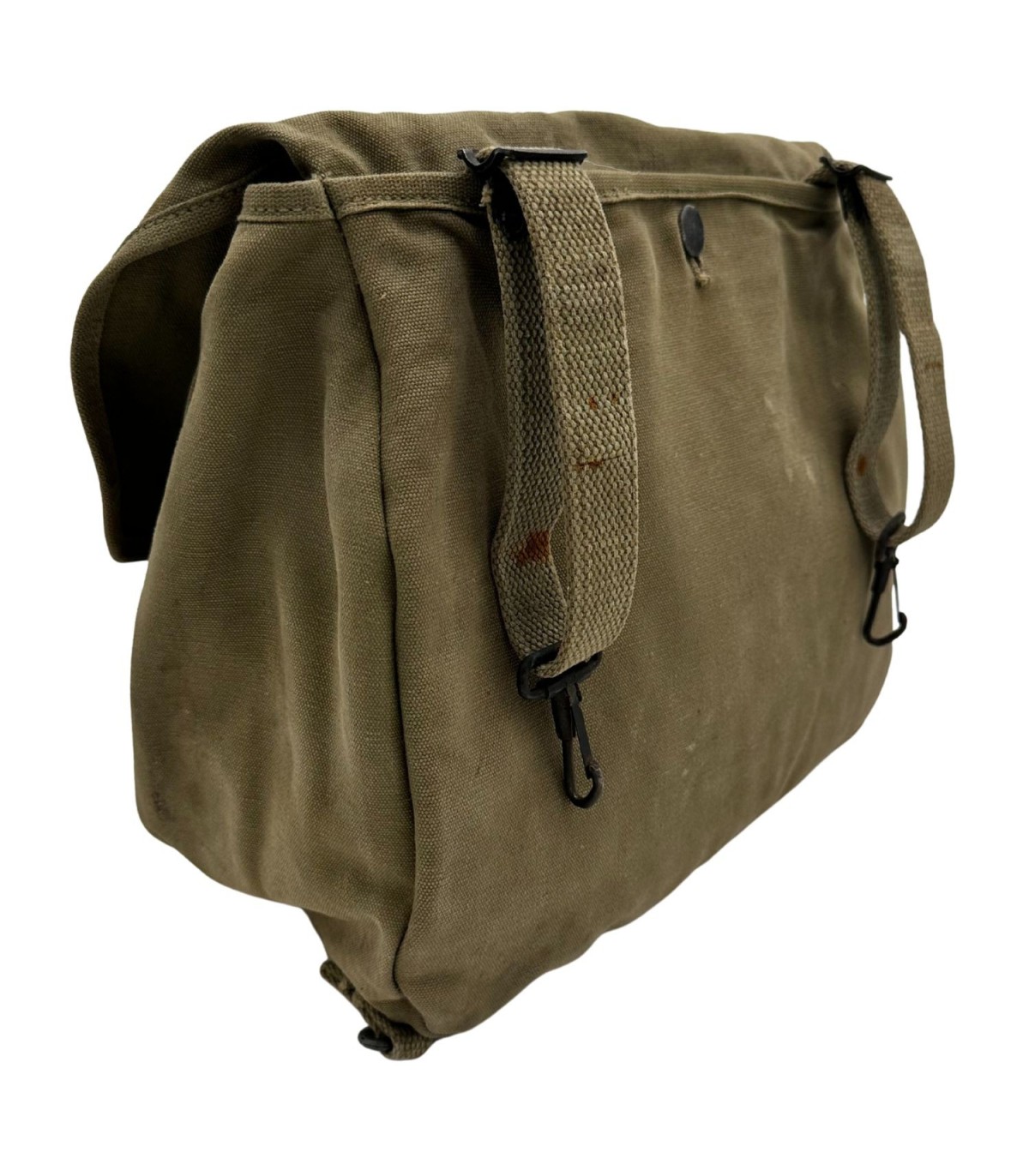 Musette M-1936 originale US Army, pièce essentielle du système de portage des G.I. durant la Seconde Guerre mondiale. Sac polyvalent en toile Olive Drab, utilisé pour le transport des cartes, rations, munitions et effets personnels.