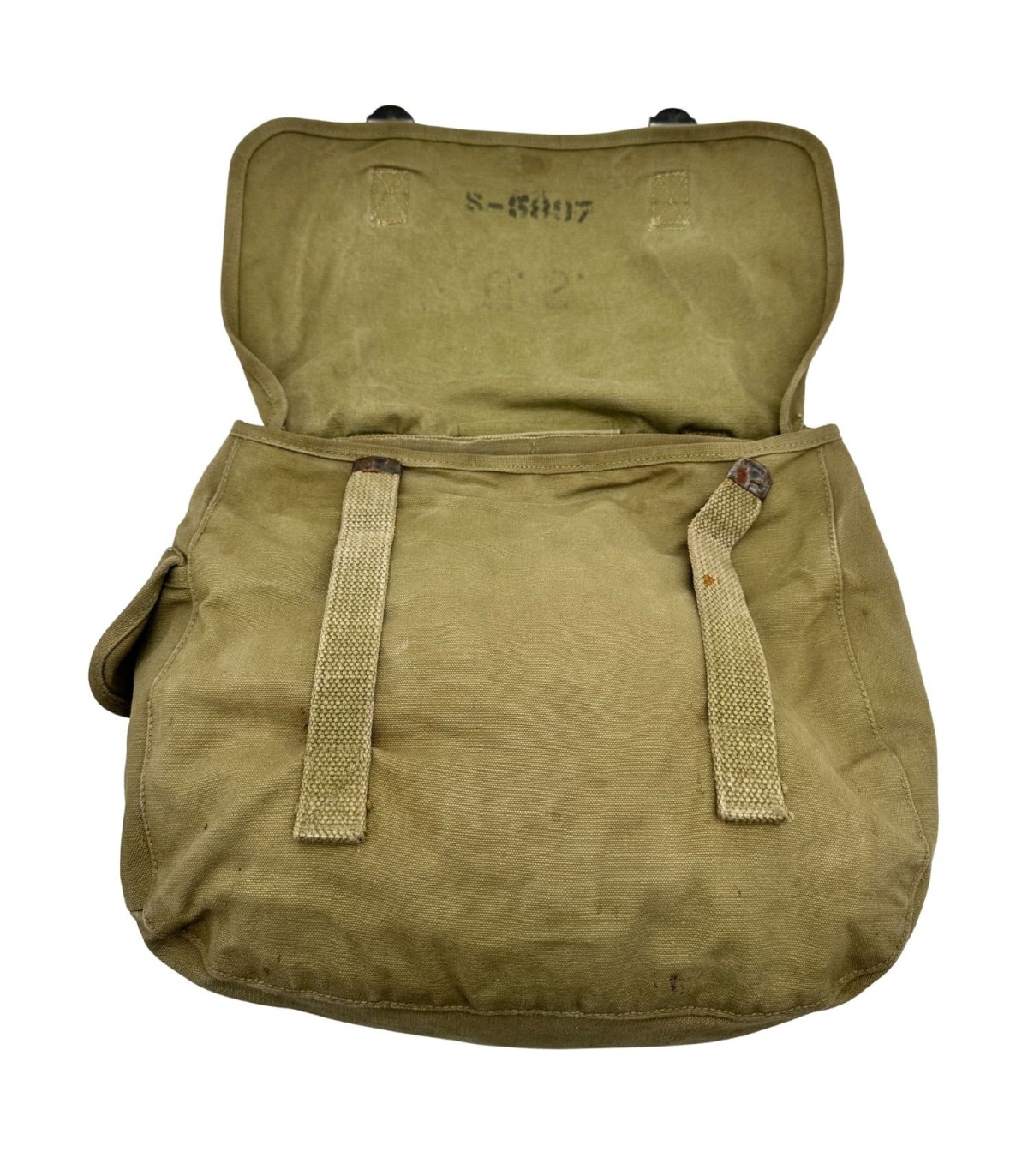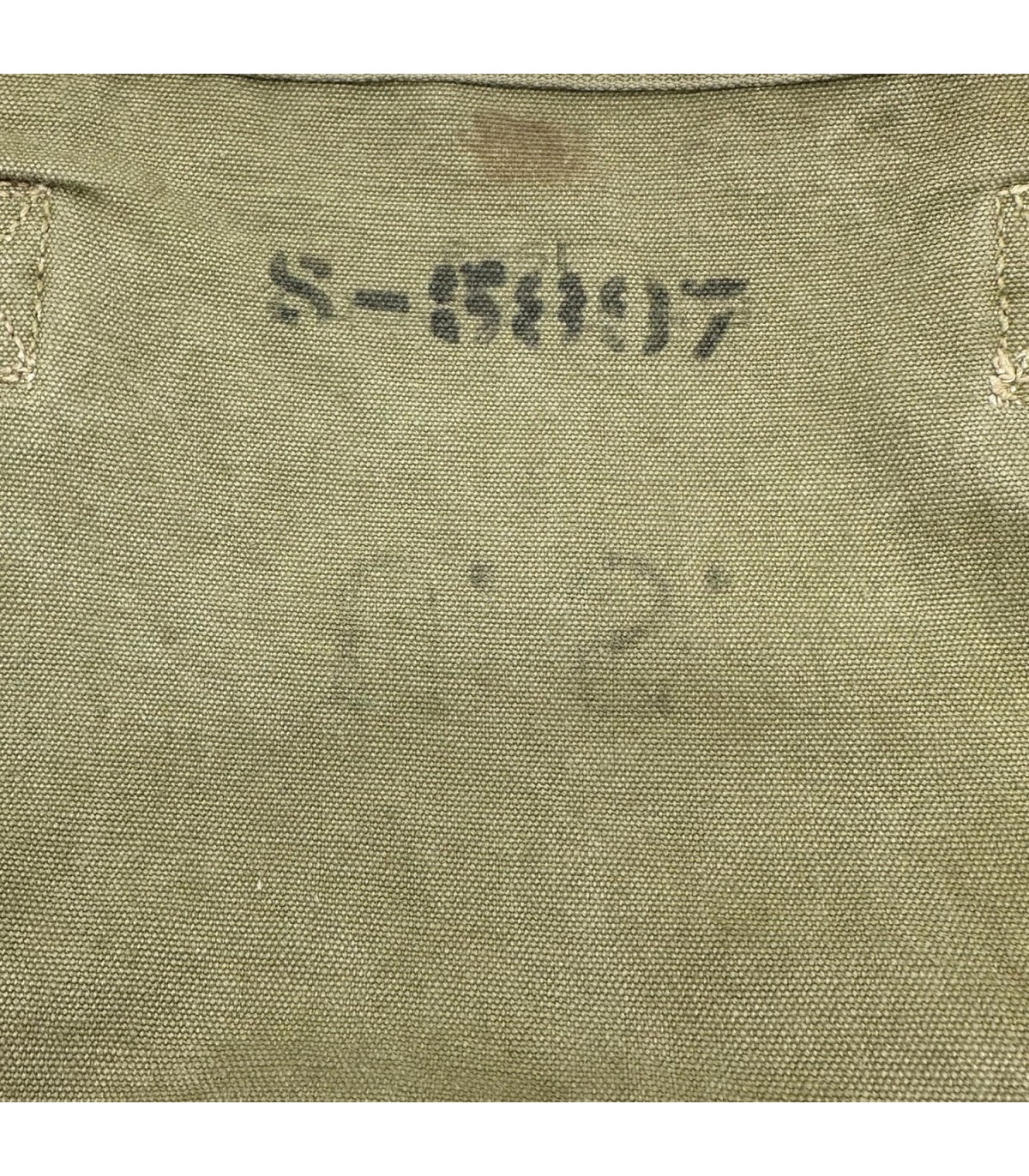 Marquage Personnel : Bien que le nom du fabricant soit devenu illisible, elle porte un numéro de blanchisserie (Laundry Number) ou matricule S-5897. Ce marquage ajoute une dimension humaine et historique forte, permettant de dater la musette à un utilisateur spécifique et d'évoquer l'histoire du soldat qui l'a portée.