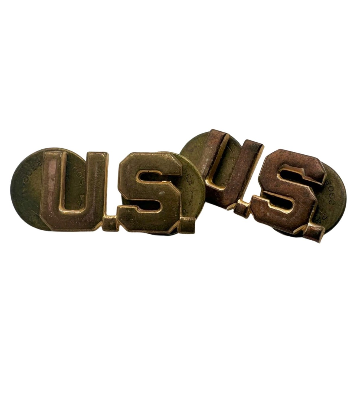Insigne de col réglementaire US Army pour officier, modèle “US”, porté sur la tunique de service en face de l’insigne d’arme. Pièce 100 % authentique de la Seconde Guerre Mondiale, indispensable pour compléter un uniforme d’officier.