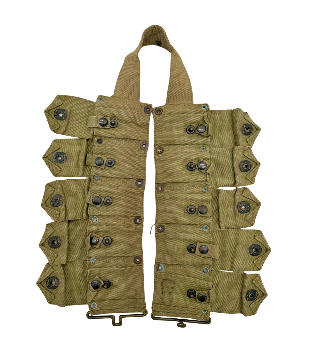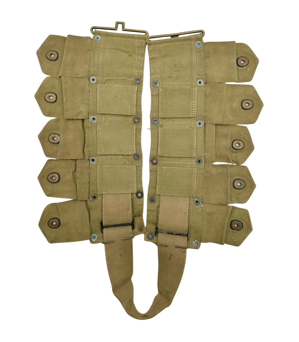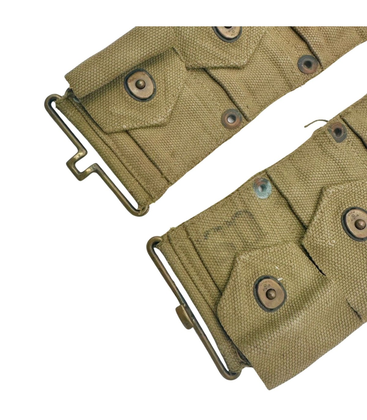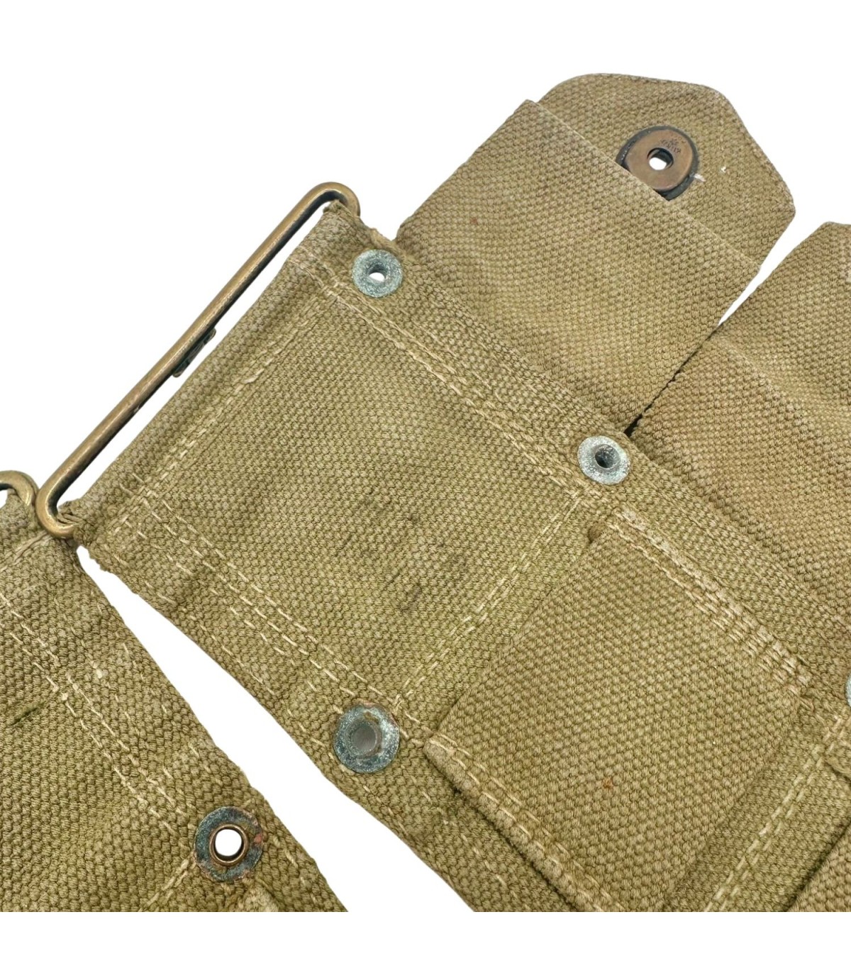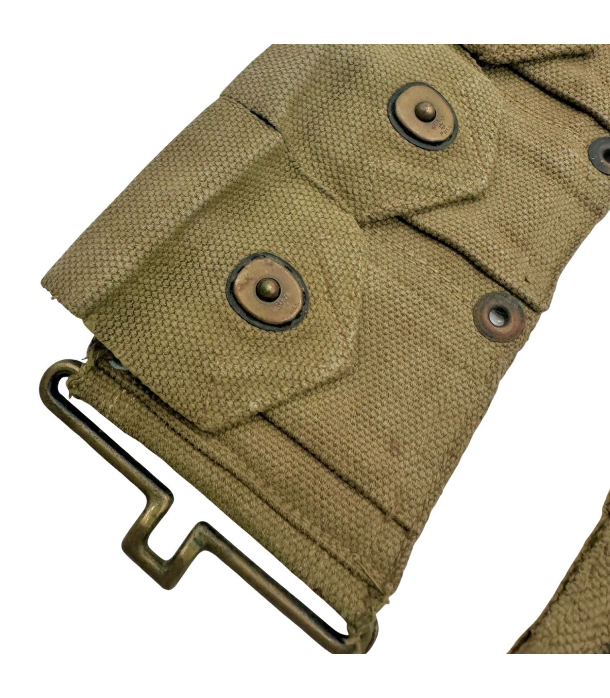 Couleur de la Toile : Il est réalisé en toile de coton (webbing) OD3 (Olive Drab n°3), une teinte kaki/beige clair, caractéristique des productions de début et milieu de guerre, souvent plus claires que les modèles de fin de guerre.